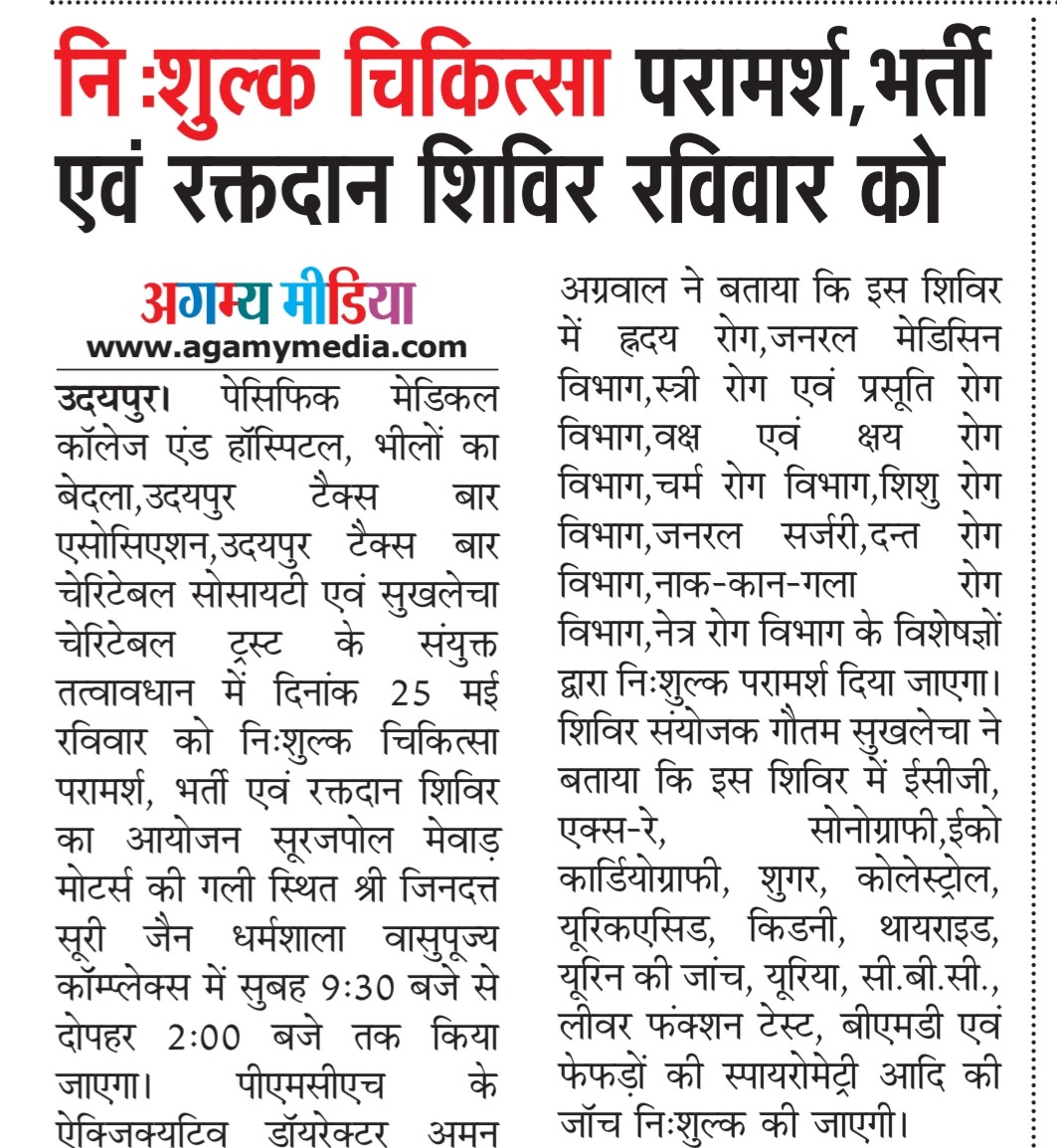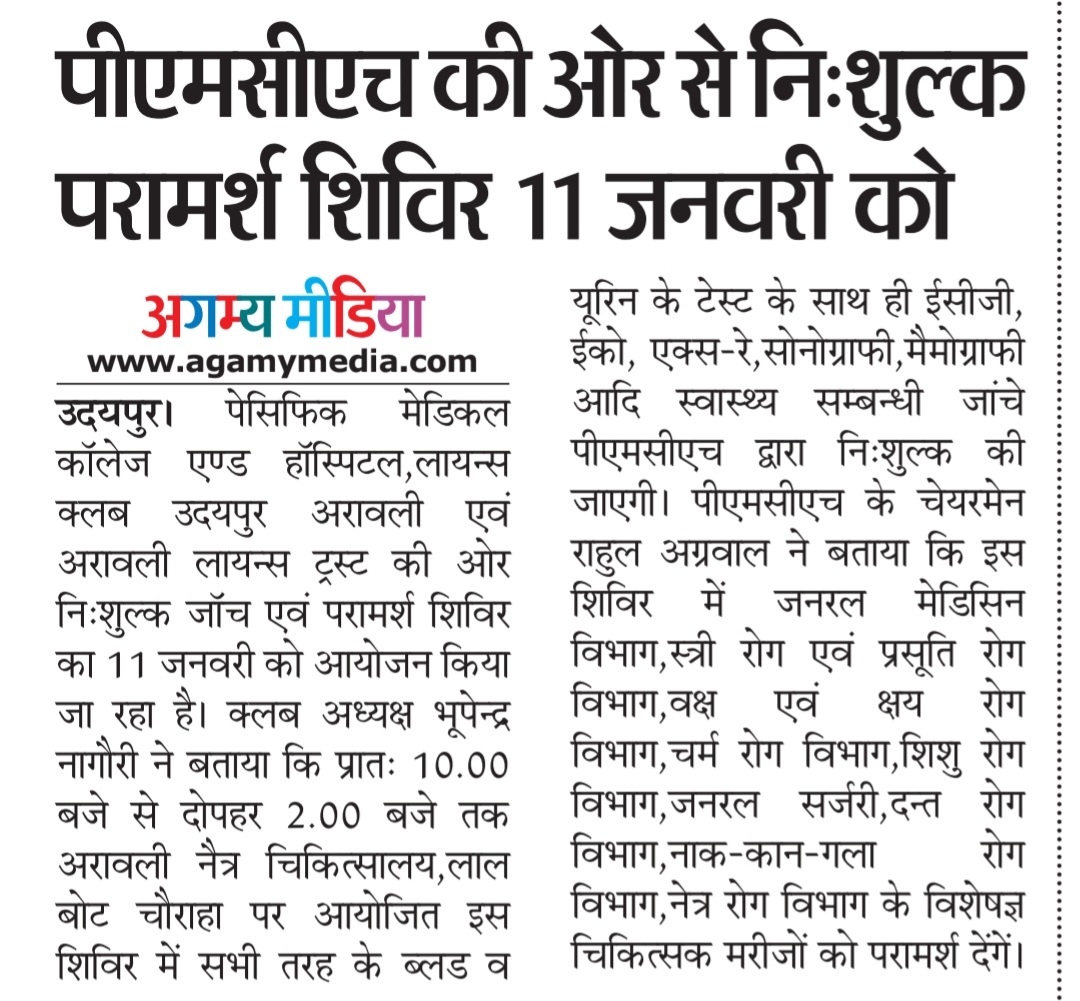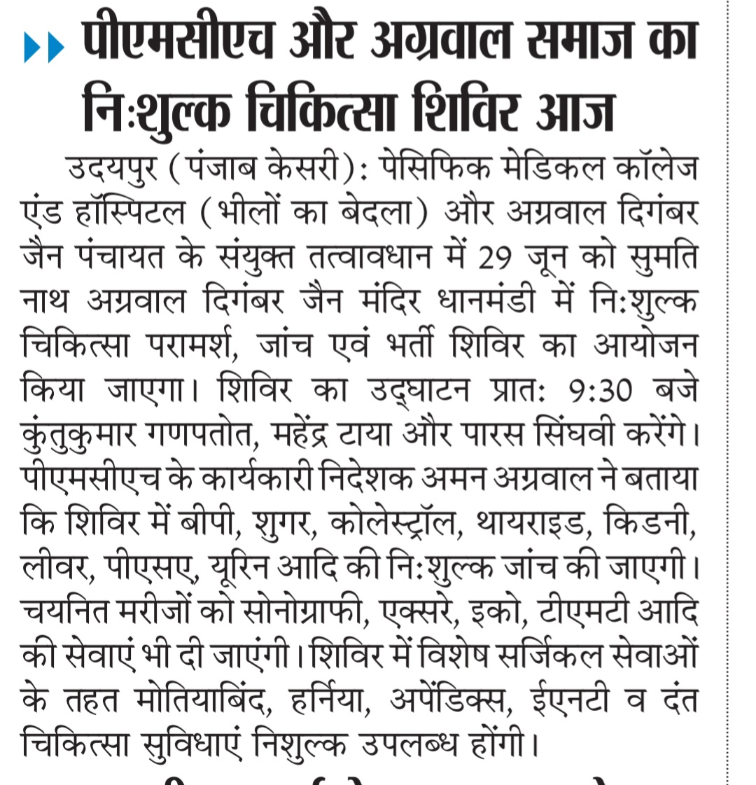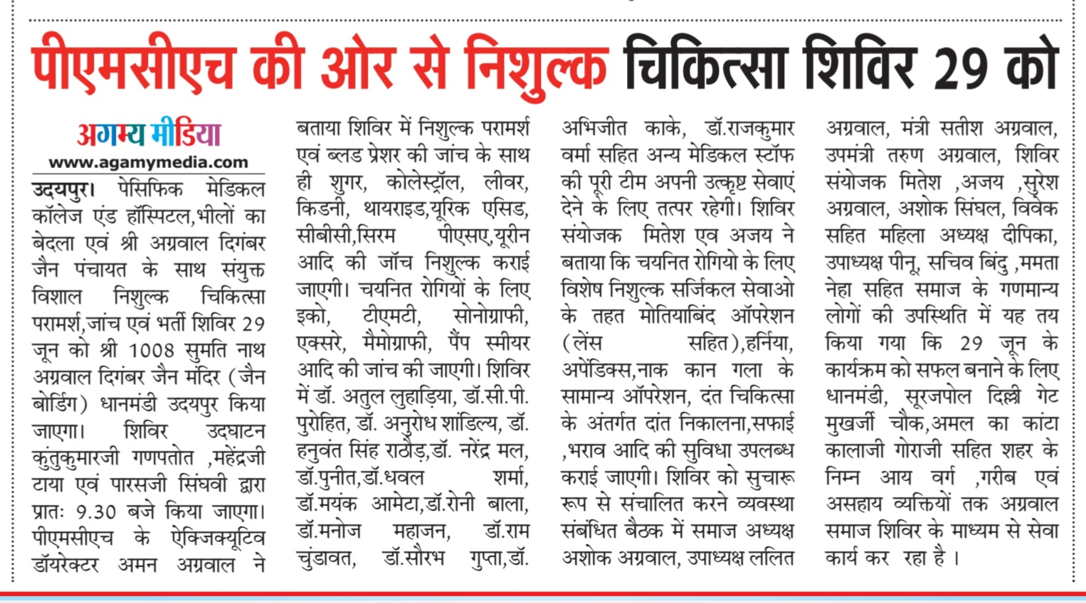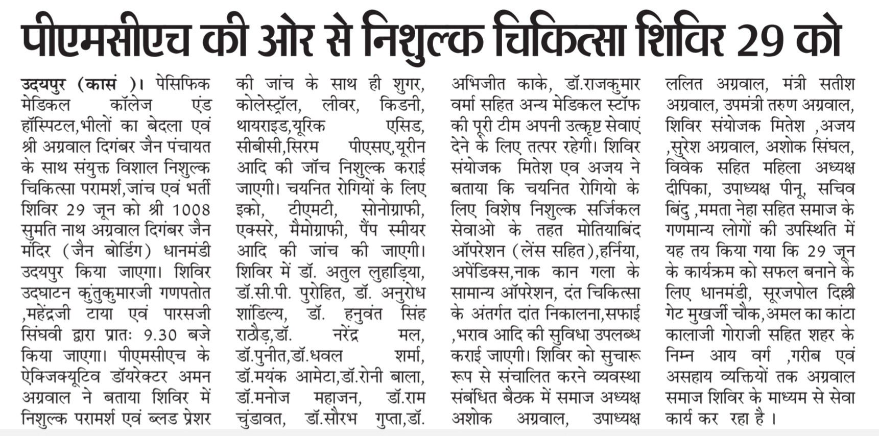рдкреЗрд╕рд┐рдлрд┐рдХ рдореЗрдбрд┐рдХрд▓ рдХреЙрд▓реЗрдЬ рдПрдВрдб рд╣реЙрд╕реНрдкрд┐рдЯрд▓, рднреАрд▓реЛрдВ рдХрд╛ рдмреЗрджрд▓рд╛ рдПрд╡рдВ рд╢реНрд░реА рдЕрдЧреНрд░рд╡рд╛рд▓ рджрд┐рдЧрдВрдмрд░ рдЬреИрди рдкрдВрдЪрд╛рдпрдд рдХреЗ рд╕рд╛рде рд╕рдВрдпреБрдХреНрдд рд╡рд┐рд╢рд╛рд▓ рдирд┐рд╢реБрд▓реНрдХ рдЪрд┐рдХрд┐рддреНрд╕рд╛ рдкрд░рд╛рдорд░реНрд╢,рдЬрд╛рдВрдЪ рдПрд╡рдВ рднрд░реНрддреА рд╢рд┐рд╡рд┐рд░ 29 рдЬреВрди рдХреЛ рд╢реНрд░реА 1008 рд╕реБрдорддрд┐ рдирд╛рде рдЕрдЧреНрд░рд╡рд╛рд▓ рджрд┐рдЧрдВрдмрд░ рдЬреИрди рдордВрджрд┐рд░ (рдЬреИрди рдмреЛрд░реНрдбрд┐рдЧ) рдзрд╛рдирдордВрдбреА рдЙрджрдпрдкреБрд░ рдХрд┐рдпрд╛ рдЬрд╛рдПрдЧрд╛ред рд╢рд┐рд╡рд┐рд░ рдХреБрдВрддреБрдХреБрдорд╛рд░рдЬреА рдЧрдгрдкрддреЛрдд, рдорд╣реЗрдВрджреНрд░рдЬреА рдЯрд╛рдпрд╛ рдПрд╡рдВ рдкрд╛рд░рд╕рдЬреА рд╕рд┐рдВрдШрд╡реА рджреНрд╡рд╛рд░рд╛ рдкреНрд░рд╛рддрдГ 9.30 рдмрдЬреЗ рдХрд┐рдпрд╛ рдЬрд╛рдПрдЧрд╛ред рдкреАрдПрдорд╕реАрдПрдЪ рдХреЗ рдРрдХреНрдЬрд┐рдХреНрдпреВрдЯрд┐рд╡ рдбреЙрдпрд░реЗрдХреНрдЯрд░ рдЕрдорди рдЕрдЧреНрд░рд╡рд╛рд▓ рдиреЗ рдЙрджрдШрд╛рдЯрди рдмрддрд╛рдпрд╛ рд╢рд┐рд╡рд┐рд░ рдореЗрдВ рдирд┐рд╢реБрд▓реНрдХ рдкрд░рд╛рдорд░реНрд╢ рдПрд╡рдВ рдмреНрд▓рдб рдкреНрд░реЗрд╢рд░ рдХреА рдЬрд╛рдВрдЪ рдХреЗ рд╕рд╛рде рд╣реА рд╢реБрдЧрд░, рдХреЛрд▓реЗрд╕реНрдЯреНрд░реЙрд▓, рд▓реАрд╡рд░, рдХрд┐рдбрдиреА, рдерд╛рдпрд░рд╛рдЗрдб, рдпреВрд░рд┐рдХ рдПрд╕рд┐рдб, рд╕реАрдмреАрд╕реА, рд╕рд┐рд░рдо рдкреАрдПрд╕рдП, рдпреВрд░реАрди рдЖрджрд┐ рдХреА рдЬреЙрдЪ рдирд┐рд╢реБрд▓реНрдХ рдХрд░рд╛рдИ рдЬрд╛рдПрдЧреАред рдЪрдпрдирд┐рдд рд░реЛрдЧрд┐рдпреЛрдВ рдХреЗ рд▓рд┐рдП рдЗрдХреЛ, рдЯреАрдПрдордЯреА, рд╕реЛрдиреЛрдЧреНрд░рд╛рдлреА, рдПрдХреНрд╕рд░реЗ, рдореИрдореЛрдЧреНрд░рд╛рдлреА, рдкреИрдВрдк рд╕реНрдореАрдпрд░ рдЖрджрд┐ рдХреА рдЬрд╛рдВрдЪ рдХреА рдЬрд╛рдПрдЧреАред рд╢рд┐рд╡рд┐рд░ рдореЗрдВ рдбреЙ. рдЕрддреБрд▓ рд▓реБрд╣рд╛рдбрд╝рд┐рдпрд╛, рдбреЙ. рд╕реА.рдкреА. рдкреБрд░реЛрд╣рд┐рдд, рдбреЙ. рдЕрдиреБрд░реЛрдз рд╢рд╛рдВрдбрд┐рд▓реНрдп, рдбреЙ. рд╣рдиреБрд╡рдВрдд рд╕рд┐рдВрд╣ рд░рд╛рдареМрдбрд╝, рдбреЙ. рдирд░реЗрдВрджреНрд░ рдорд▓, рдбреЙ. рдкреБрдиреАрдд,рдбреЙ.рдзрд╡рд▓ рдбреЙ. рдордпрдВрдХ рдЖрдореЗрдЯрд╛, рдбреЙ. рд░реЛрдиреА рдмрд╛рд▓рд╛, рдбреЙ. рд░рд╛рдо рдорд╣рд╛рдЬрди, рдбреЙ. рдордиреЛрдЬ рдЪреБрдВрдбрд╛рд╡рдд, рдбреЙ. рд╕реМрд░рдн рдЧреБрдкреНрддрд╛, рдбреЙ. рд╢рд░реНрдорд╛, рдЕрднрд┐рдЬреАрдд рдХрд╛рдХреЗ, рдбреЙ. рд░рд╛рдЬрдХреБрдорд╛рд░ рд╡рд░реНрдорд╛ рд╕рд╣рд┐рдд рдЕрдиреНрдп рдореЗрдбрд┐рдХрд▓ рд╕реНрдЯреЙрдл рдХреА рдкреВрд░реА рдЯреАрдо рдЕрдкрдиреА рдЙрддреНрдХреГрд╖реНрдЯ рд╕реЗрд╡рд╛рдПрдВ рджреЗрдиреЗ рдХреЗ рд▓рд┐рдП рддрддреНрдкрд░ рд░рд╣реЗрдЧреА ред рд╢рд┐рд╡рд┐рд░ рд╕рдВрдпреЛрдЬрдХ рдорд┐рддреЗрд╢ рдПрд╡ рдЕрдЬрдп рдиреЗ рдмрддрд╛рдпрд╛ рдХрд┐ рдЪрдпрдирд┐рдд рд░реЛрдЧрд┐рдпреЛ рдХреЗ рд▓рд┐рдП рд╡рд┐рд╢реЗрд╖ рдирд┐рд╢реБрд▓реНрдХ рд╕рд░реНрдЬрд┐рдХрд▓ рд╕реЗрд╡рд╛рдУ рдХреЗ рддрд╣рдд рдореЛрддрд┐рдпрд╛рдмрд┐рдВрдж рдСрдкрд░реЗрд╢рди (рд▓реЗрдВрд╕ рд╕рд╣рд┐рдд),рд╣рд░реНрдирд┐рдпрд╛, рдЕрдкреЗрдВрдбрд┐рдХреНрд╕, рдирд╛рдХ рдХрд╛р