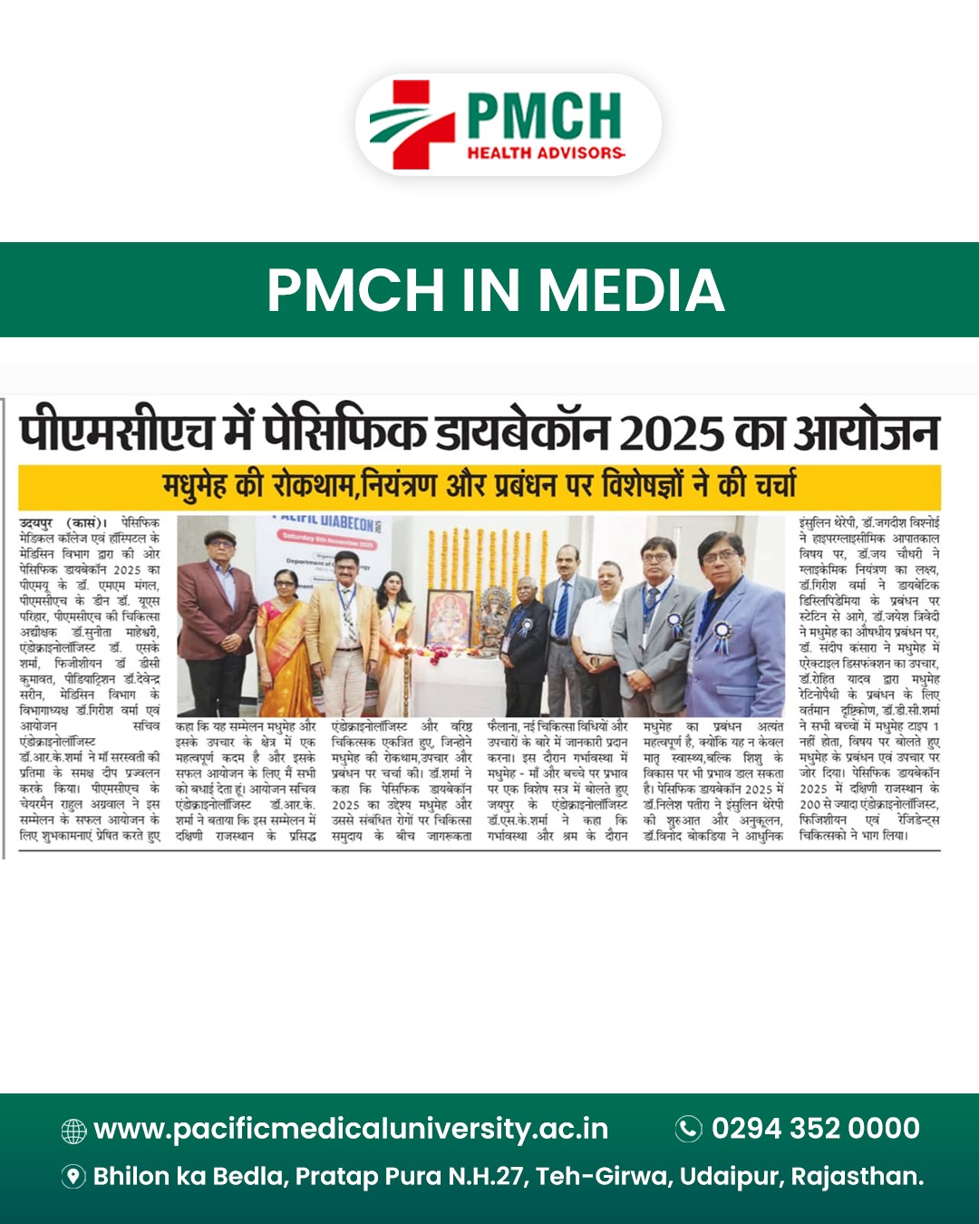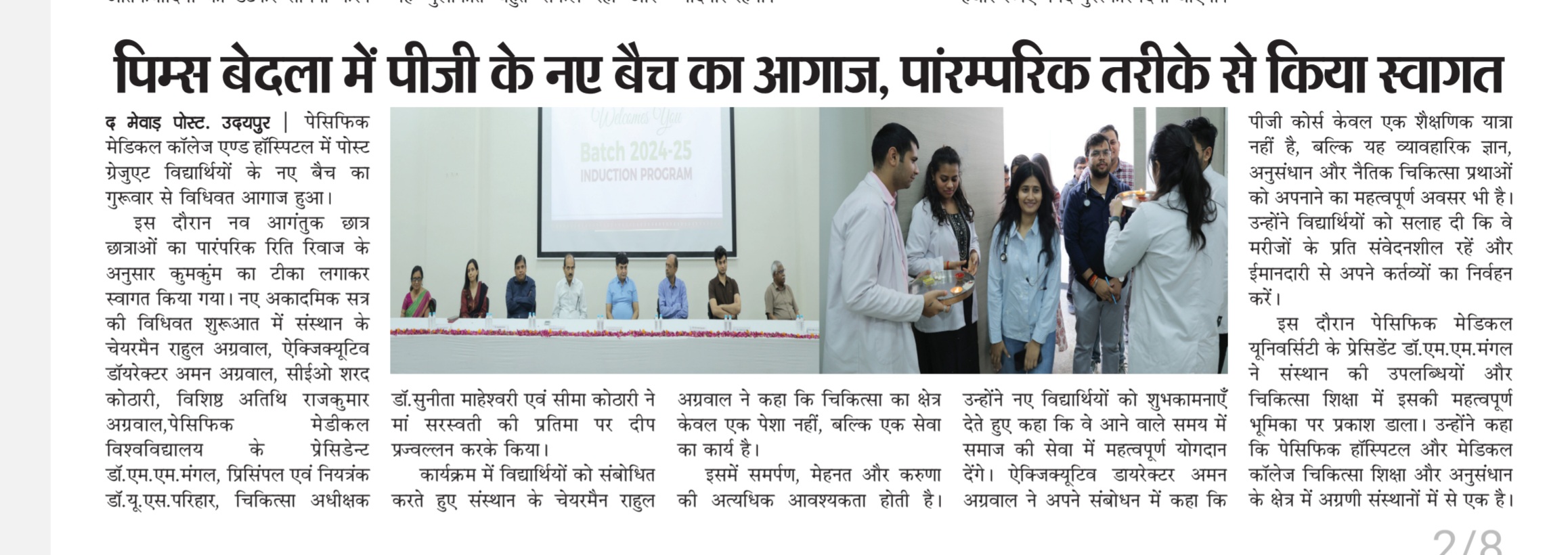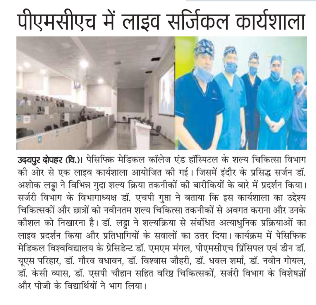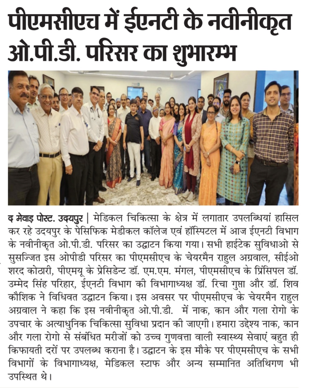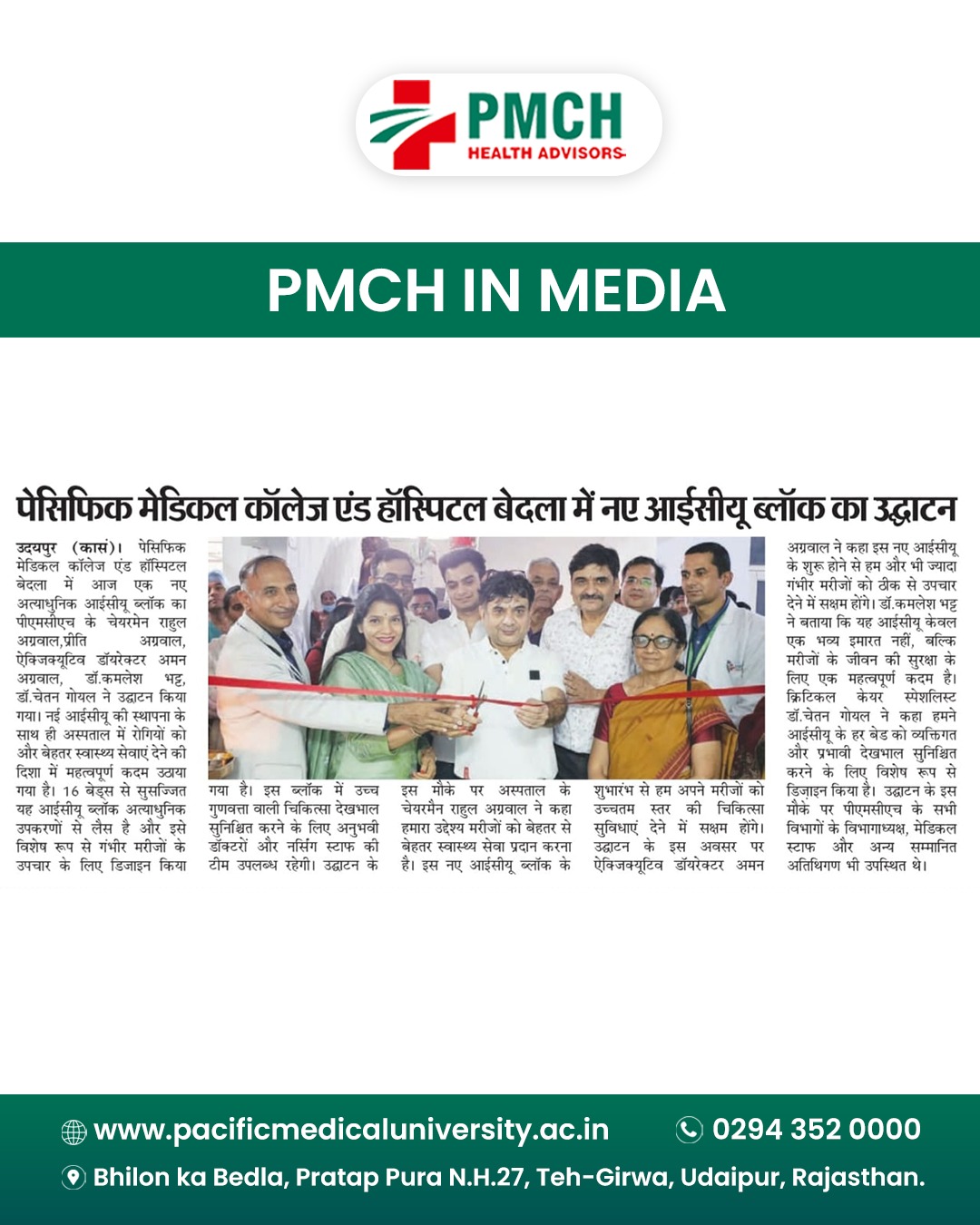 рдкреЗрд╕рд┐рдлрд┐рдХ рдореЗрдбрд┐рдХрд▓ рдХреЙрд▓реЗрдЬ рдПрдВрдб рд╣реЙрд╕реНрдкрд┐рдЯрд▓, рднреАрд▓реЛрдВ рдХрд╛ рдмреЗрджрд▓рд╛ рдПрд╡рдВ рд╢реНрд░реА рдЕрдЧреНрд░рд╡рд╛рд▓ рджрд┐рдЧрдВрдмрд░ рдЬреИрди рдкрдВрдЪрд╛рдпрдд рдХреЗ рд╕рд╛рде рд╕рдВрдпреБрдХреНрдд рд╡рд┐рд╢рд╛рд▓ рдирд┐рд╢реБрд▓реНрдХ рдЪрд┐рдХрд┐рддреНрд╕рд╛ рдкрд░рд╛рдорд░реНрд╢,рдЬрд╛рдВрдЪ рдПрд╡рдВ рднрд░реНрддреА рд╢рд┐рд╡рд┐рд░ 29 рдЬреВрди рдХреЛ рд╢реНрд░реА 1008 рд╕реБрдорддрд┐ рдирд╛рде рдЕрдЧреНрд░рд╡рд╛рд▓ рджрд┐рдЧрдВрдмрд░ рдЬреИрди рдордВрджрд┐рд░ (рдЬреИрди рдмреЛрд░реНрдбрд┐рдЧ) рдзрд╛рдирдордВрдбреА рдЙрджрдпрдкреБрд░ рдХрд┐рдпрд╛ рдЬрд╛рдПрдЧрд╛ред рд╢рд┐рд╡рд┐рд░ рдХреБрдВрддреБрдХреБрдорд╛рд░рдЬреА рдЧрдгрдкрддреЛрдд, рдорд╣реЗрдВрджреНрд░рдЬреА рдЯрд╛рдпрд╛ рдПрд╡рдВ рдкрд╛рд░рд╕рдЬреА рд╕рд┐рдВрдШрд╡реА рджреНрд╡рд╛рд░рд╛ рдкреНрд░рд╛рддрдГ 9.30 рдмрдЬреЗ рдХрд┐рдпрд╛ рдЬрд╛рдПрдЧрд╛ред рдкреАрдПрдорд╕реАрдПрдЪ рдХреЗ рдРрдХреНрдЬрд┐рдХреНрдпреВрдЯрд┐рд╡ рдбреЙрдпрд░реЗрдХреНрдЯрд░ рдЕрдорди рдЕрдЧреНрд░рд╡рд╛рд▓ рдиреЗ рдЙрджрдШрд╛рдЯрди рдмрддрд╛рдпрд╛ рд╢рд┐рд╡рд┐рд░ рдореЗрдВ рдирд┐рд╢реБрд▓реНрдХ рдкрд░рд╛рдорд░реНрд╢ рдПрд╡рдВ рдмреНрд▓рдб рдкреНрд░реЗрд╢рд░ рдХреА рдЬрд╛рдВрдЪ рдХреЗ рд╕рд╛рде рд╣реА рд╢реБрдЧрд░, рдХреЛрд▓реЗрд╕реНрдЯреНрд░реЙрд▓, рд▓реАрд╡рд░, рдХрд┐рдбрдиреА, рдерд╛рдпрд░рд╛рдЗрдб, рдпреВрд░рд┐рдХ рдПрд╕рд┐рдб, рд╕реАрдмреАрд╕реА, рд╕рд┐рд░рдо рдкреАрдПрд╕рдП, рдпреВрд░реАрди рдЖрджрд┐ рдХреА рдЬреЙрдЪ рдирд┐рд╢реБрд▓реНрдХ рдХрд░рд╛рдИ рдЬрд╛рдПрдЧреАред рдЪрдпрдирд┐рдд рд░реЛрдЧрд┐рдпреЛрдВ рдХреЗ рд▓рд┐рдП рдЗрдХреЛ, рдЯреАрдПрдордЯреА, рд╕реЛрдиреЛрдЧреНрд░рд╛рдлреА, рдПрдХреНрд╕рд░реЗ, рдореИрдореЛрдЧреНрд░рд╛рдлреА, рдкреИрдВрдк рд╕реНрдореАрдпрд░ рдЖрджрд┐ рдХреА рдЬрд╛рдВрдЪ рдХреА рдЬрд╛рдПрдЧреАред рд╢рд┐рд╡рд┐рд░ рдореЗрдВ рдбреЙ. рдЕрддреБрд▓ рд▓реБрд╣рд╛рдбрд╝рд┐рдпрд╛, рдбреЙ. рд╕реА.рдкреА. рдкреБрд░реЛрд╣рд┐рдд, рдбреЙ. рдЕрдиреБрд░реЛрдз рд╢рд╛рдВрдбрд┐рд▓реНрдп, рдбреЙ. рд╣рдиреБрд╡рдВрдд рд╕рд┐рдВрд╣ рд░рд╛рдареМрдбрд╝, рдбреЙ. рдирд░реЗрдВрджреНрд░ рдорд▓, рдбреЙ. рдкреБрдиреАрдд,рдбреЙ.рдзрд╡рд▓ рдбреЙ. рдордпрдВрдХ рдЖрдореЗрдЯрд╛, рдбреЙ. рд░реЛрдиреА рдмрд╛рд▓рд╛, рдбреЙ. рд░рд╛рдо рдорд╣рд╛рдЬрди, рдбреЙ. рдордиреЛрдЬ рдЪреБрдВрдбрд╛рд╡рдд, рдбреЙ. рд╕реМрд░рдн рдЧреБрдкреНрддрд╛, рдбреЙ. рд╢рд░реНрдорд╛, рдЕрднрд┐рдЬреАрдд рдХрд╛рдХреЗ, рдбреЙ. рд░рд╛рдЬрдХреБрдорд╛рд░ рд╡рд░реНрдорд╛ рд╕рд╣рд┐рдд рдЕрдиреНрдп рдореЗрдбрд┐рдХрд▓ рд╕реНрдЯреЙрдл рдХреА рдкреВрд░реА рдЯреАрдо рдЕрдкрдиреА рдЙрддреНрдХреГрд╖реНрдЯ рд╕реЗрд╡рд╛рдПрдВ рджреЗрдиреЗ рдХреЗ рд▓рд┐рдП рддрддреНрдкрд░ рд░рд╣реЗрдЧреА ред рд╢рд┐рд╡рд┐рд░ рд╕рдВрдпреЛрдЬрдХ рдорд┐рддреЗрд╢ рдПрд╡ рдЕрдЬрдп рдиреЗ рдмрддрд╛рдпрд╛ рдХрд┐ рдЪрдпрдирд┐рдд рд░реЛрдЧрд┐рдпреЛ рдХреЗ рд▓рд┐рдП рд╡рд┐рд╢реЗрд╖ рдирд┐рд╢реБрд▓реНрдХ рд╕рд░реНрдЬрд┐рдХрд▓ рд╕реЗрд╡рд╛рдУ рдХреЗ рддрд╣рдд рдореЛрддрд┐рдпрд╛рдмрд┐рдВрдж рдСрдкрд░реЗрд╢рди (рд▓реЗрдВрд╕ рд╕рд╣рд┐рдд),рд╣рд░реНрдирд┐рдпрд╛, рдЕрдкреЗрдВрдбрд┐рдХреНрд╕, рдирд╛рдХ рдХрд╛р
