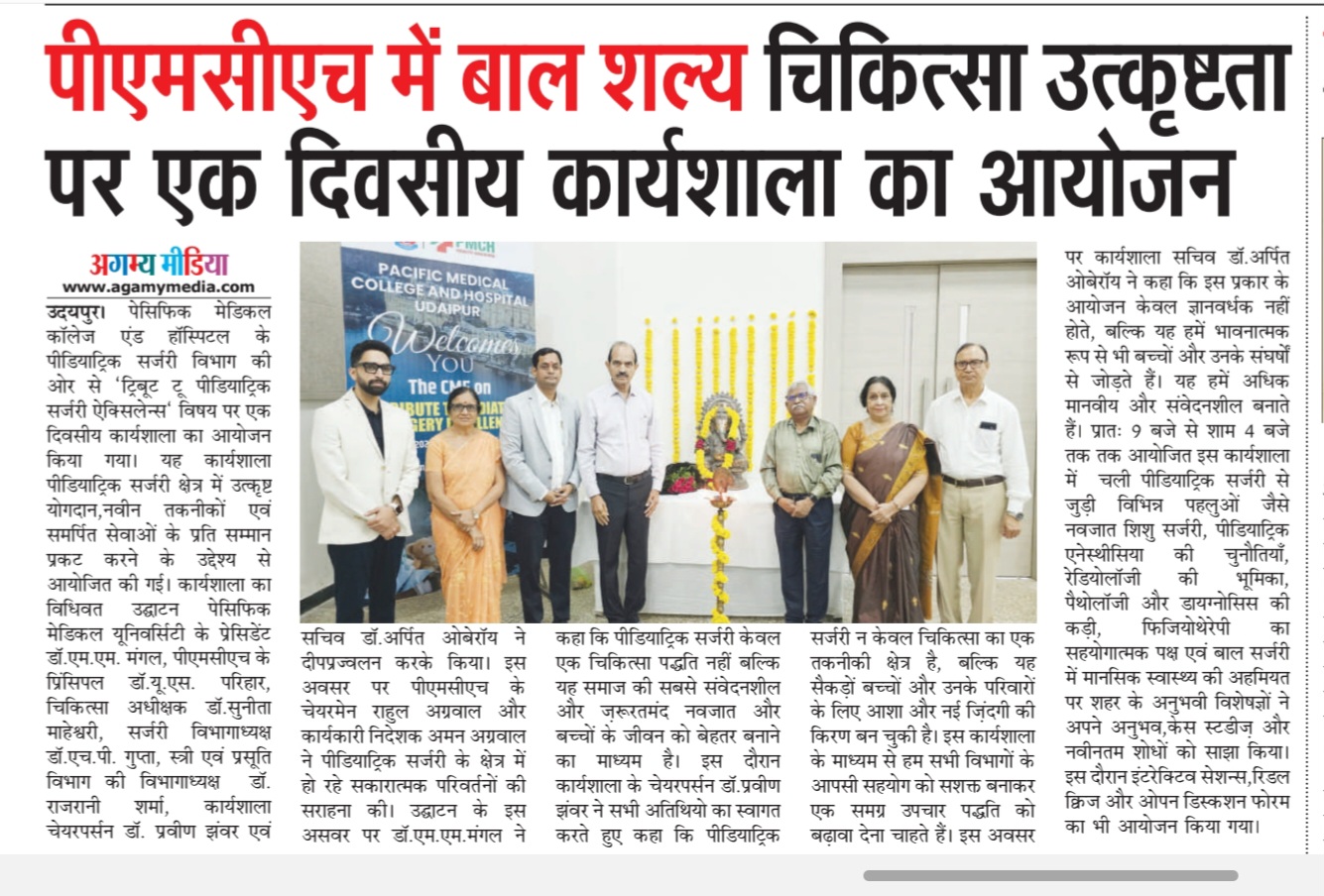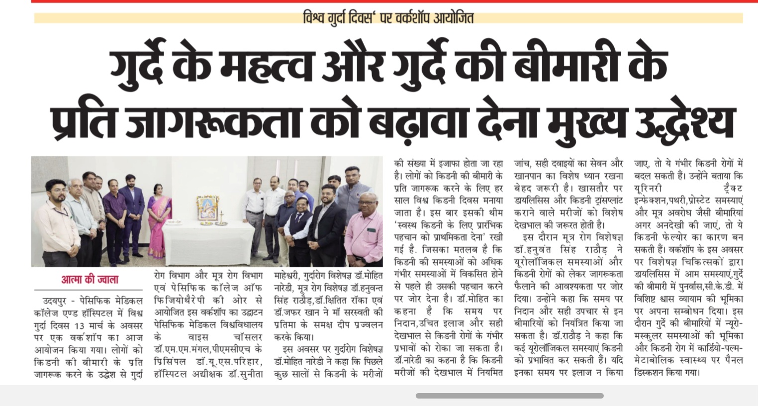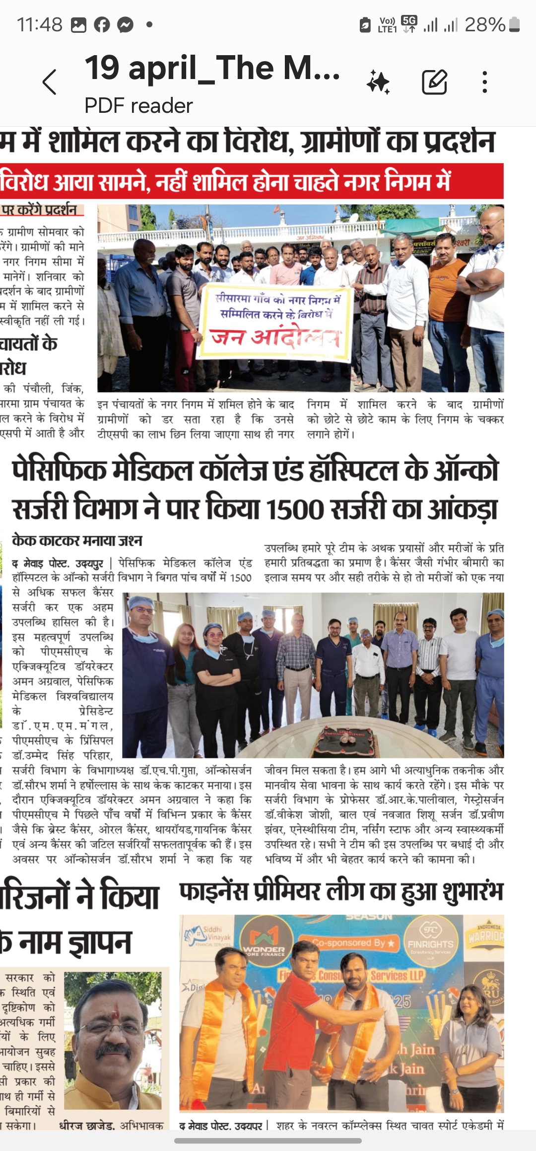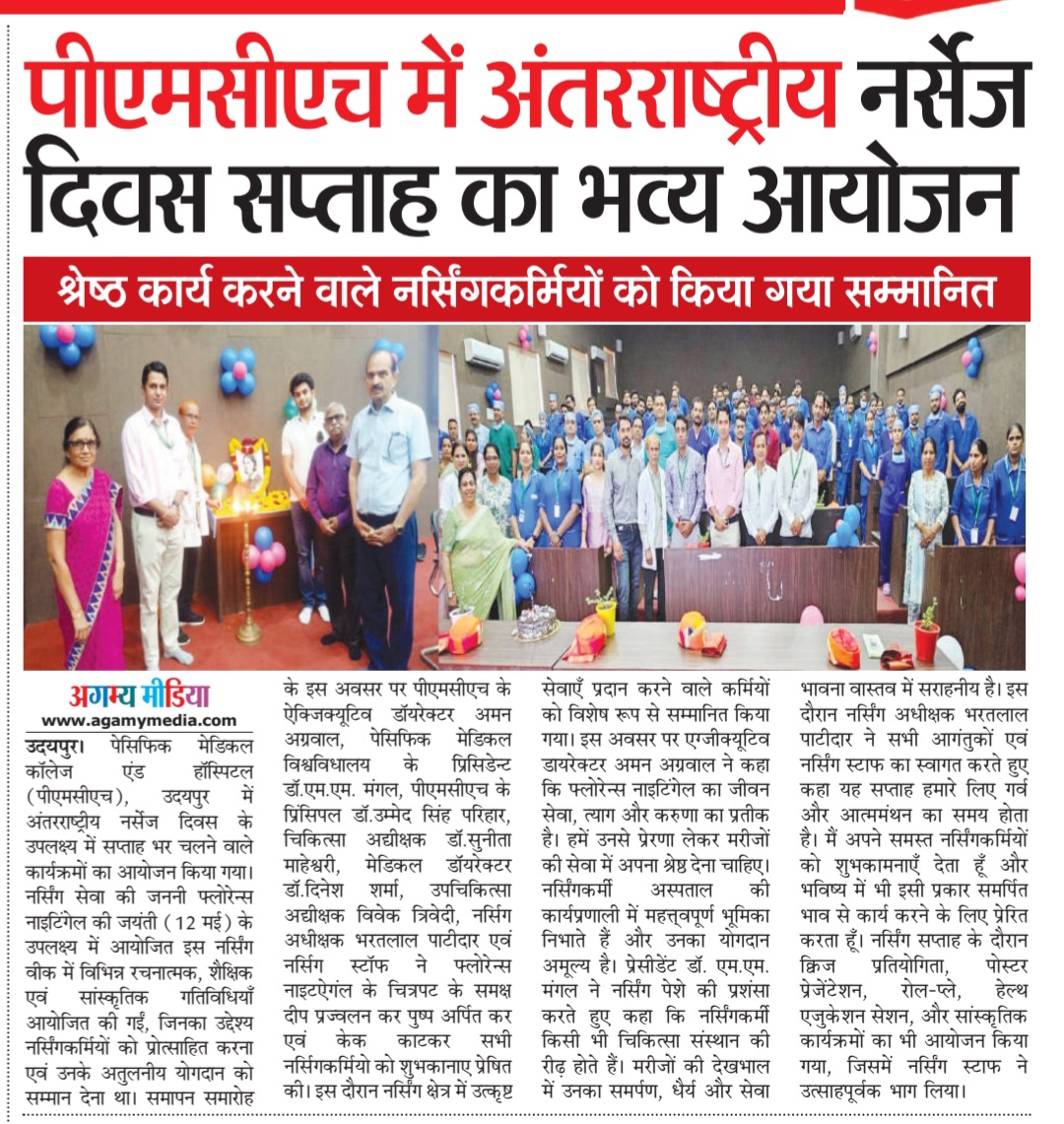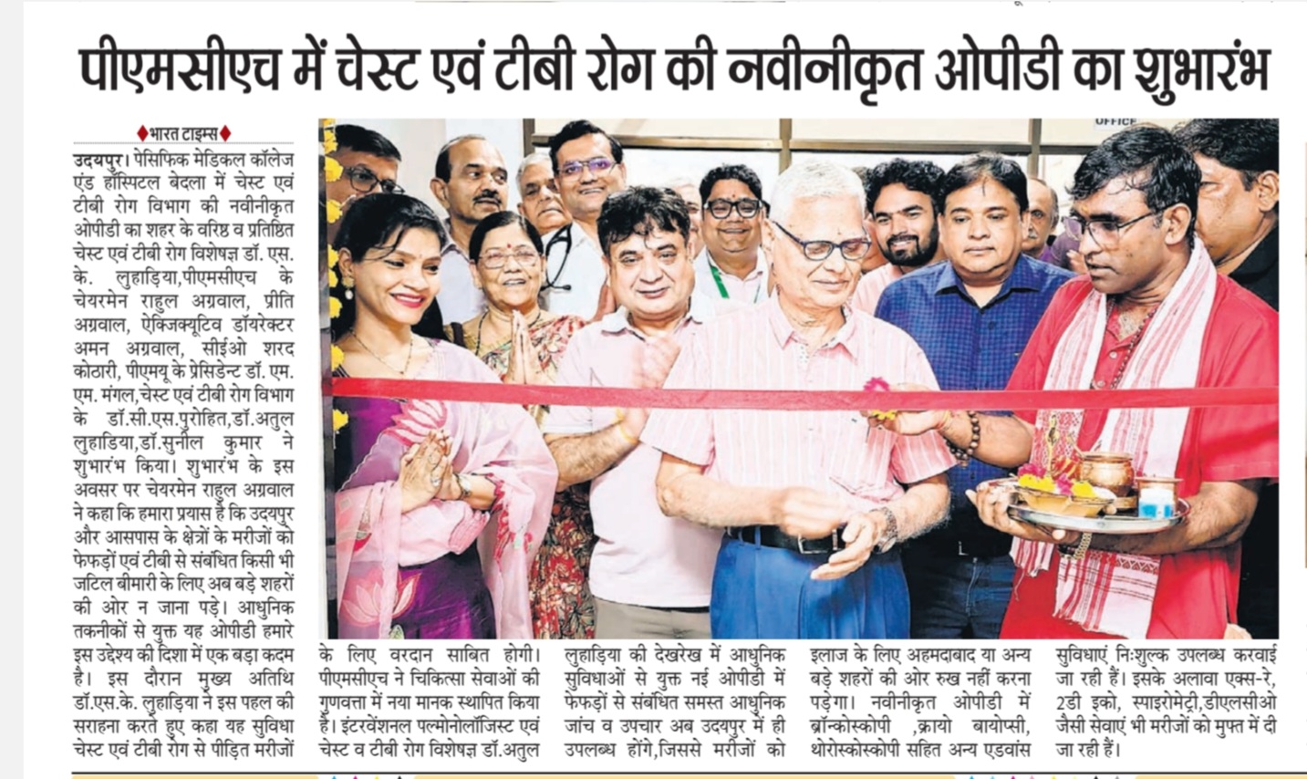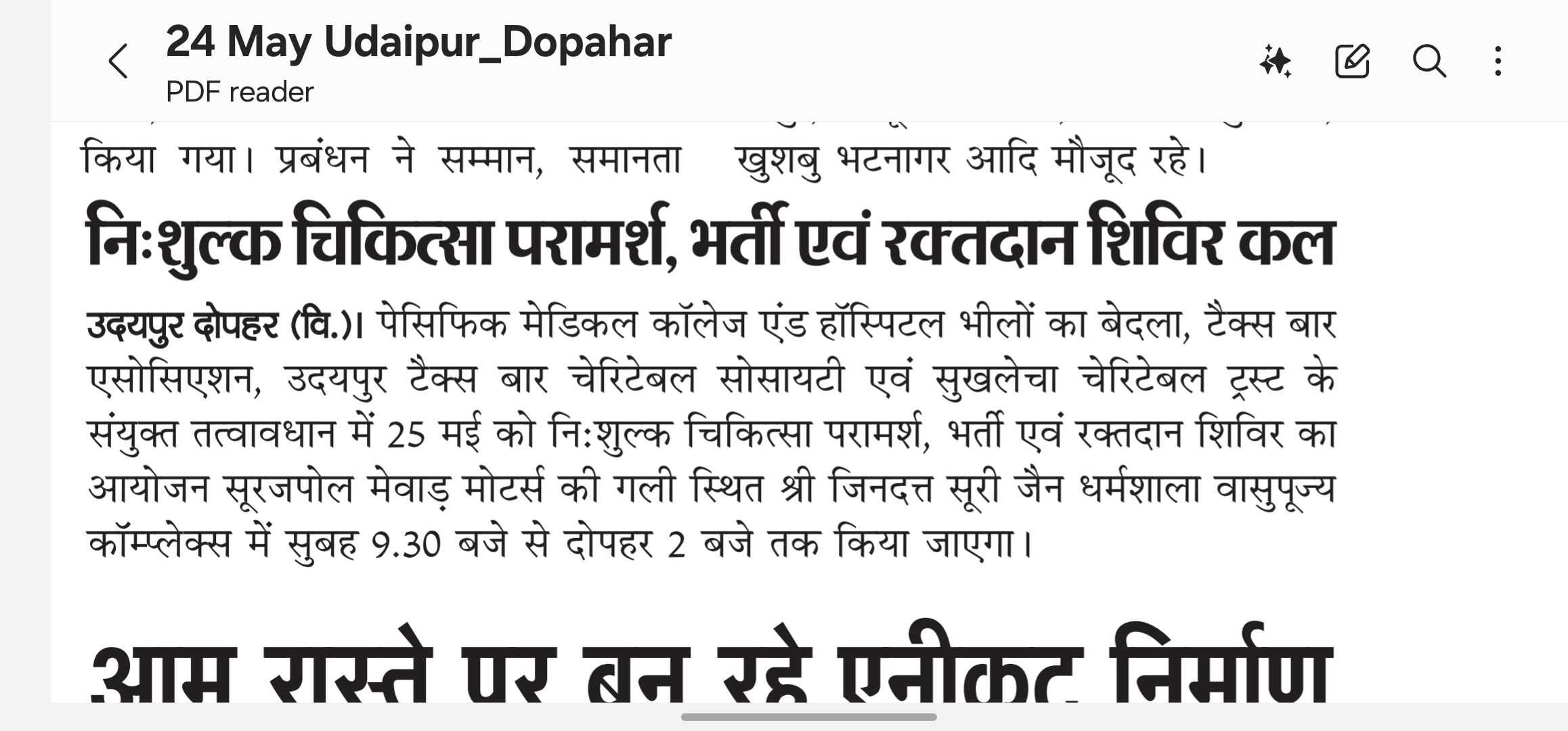 рдкреЗрд╕рд┐рдлрд┐рдХ рдореЗрдбрд┐рдХрд▓ рдХреЙрд▓реЗрдЬ рдПрдВрдб рд╣реЙрд╕реНрдкрд┐рдЯрд▓, рднреАрд▓реЛрдВ рдХрд╛ рдмреЗрджрд▓рд╛ рдПрд╡рдВ рд╢реНрд░реА рдЕрдЧреНрд░рд╡рд╛рд▓ рджрд┐рдЧрдВрдмрд░ рдЬреИрди рдкрдВрдЪрд╛рдпрдд рдХреЗ рд╕рд╛рде рд╕рдВрдпреБрдХреНрдд рд╡рд┐рд╢рд╛рд▓ рдирд┐рд╢реБрд▓реНрдХ рдЪрд┐рдХрд┐рддреНрд╕рд╛ рдкрд░рд╛рдорд░реНрд╢,рдЬрд╛рдВрдЪ рдПрд╡рдВ рднрд░реНрддреА рд╢рд┐рд╡рд┐рд░ 29 рдЬреВрди рдХреЛ рд╢реНрд░реА 1008 рд╕реБрдорддрд┐ рдирд╛рде рдЕрдЧреНрд░рд╡рд╛рд▓ рджрд┐рдЧрдВрдмрд░ рдЬреИрди рдордВрджрд┐рд░ (рдЬреИрди рдмреЛрд░реНрдбрд┐рдЧ) рдзрд╛рдирдордВрдбреА рдЙрджрдпрдкреБрд░ рдХрд┐рдпрд╛ рдЬрд╛рдПрдЧрд╛ред рд╢рд┐рд╡рд┐рд░ рдХреБрдВрддреБрдХреБрдорд╛рд░рдЬреА рдЧрдгрдкрддреЛрдд, рдорд╣реЗрдВрджреНрд░рдЬреА рдЯрд╛рдпрд╛ рдПрд╡рдВ рдкрд╛рд░рд╕рдЬреА рд╕рд┐рдВрдШрд╡реА рджреНрд╡рд╛рд░рд╛ рдкреНрд░рд╛рддрдГ 9.30 рдмрдЬреЗ рдХрд┐рдпрд╛ рдЬрд╛рдПрдЧрд╛ред рдкреАрдПрдорд╕реАрдПрдЪ рдХреЗ рдРрдХреНрдЬрд┐рдХреНрдпреВрдЯрд┐рд╡ рдбреЙрдпрд░реЗрдХреНрдЯрд░ рдЕрдорди рдЕрдЧреНрд░рд╡рд╛рд▓ рдиреЗ рдЙрджрдШрд╛рдЯрди рдмрддрд╛рдпрд╛ рд╢рд┐рд╡рд┐рд░ рдореЗрдВ рдирд┐рд╢реБрд▓реНрдХ рдкрд░рд╛рдорд░реНрд╢ рдПрд╡рдВ рдмреНрд▓рдб рдкреНрд░реЗрд╢рд░ рдХреА рдЬрд╛рдВрдЪ рдХреЗ рд╕рд╛рде рд╣реА рд╢реБрдЧрд░, рдХреЛрд▓реЗрд╕реНрдЯреНрд░реЙрд▓, рд▓реАрд╡рд░, рдХрд┐рдбрдиреА, рдерд╛рдпрд░рд╛рдЗрдб, рдпреВрд░рд┐рдХ рдПрд╕рд┐рдб, рд╕реАрдмреАрд╕реА, рд╕рд┐рд░рдо рдкреАрдПрд╕рдП, рдпреВрд░реАрди рдЖрджрд┐ рдХреА рдЬреЙрдЪ рдирд┐рд╢реБрд▓реНрдХ рдХрд░рд╛рдИ рдЬрд╛рдПрдЧреАред рдЪрдпрдирд┐рдд рд░реЛрдЧрд┐рдпреЛрдВ рдХреЗ рд▓рд┐рдП рдЗрдХреЛ, рдЯреАрдПрдордЯреА, рд╕реЛрдиреЛрдЧреНрд░рд╛рдлреА, рдПрдХреНрд╕рд░реЗ, рдореИрдореЛрдЧреНрд░рд╛рдлреА, рдкреИрдВрдк рд╕реНрдореАрдпрд░ рдЖрджрд┐ рдХреА рдЬрд╛рдВрдЪ рдХреА рдЬрд╛рдПрдЧреАред рд╢рд┐рд╡рд┐рд░ рдореЗрдВ рдбреЙ. рдЕрддреБрд▓ рд▓реБрд╣рд╛рдбрд╝рд┐рдпрд╛, рдбреЙ. рд╕реА.рдкреА. рдкреБрд░реЛрд╣рд┐рдд, рдбреЙ. рдЕрдиреБрд░реЛрдз рд╢рд╛рдВрдбрд┐рд▓реНрдп, рдбреЙ. рд╣рдиреБрд╡рдВрдд рд╕рд┐рдВрд╣ рд░рд╛рдареМрдбрд╝, рдбреЙ. рдирд░реЗрдВрджреНрд░ рдорд▓, рдбреЙ. рдкреБрдиреАрдд,рдбреЙ.рдзрд╡рд▓ рдбреЙ. рдордпрдВрдХ рдЖрдореЗрдЯрд╛, рдбреЙ. рд░реЛрдиреА рдмрд╛рд▓рд╛, рдбреЙ. рд░рд╛рдо рдорд╣рд╛рдЬрди, рдбреЙ. рдордиреЛрдЬ рдЪреБрдВрдбрд╛рд╡рдд, рдбреЙ. рд╕реМрд░рдн рдЧреБрдкреНрддрд╛, рдбреЙ. рд╢рд░реНрдорд╛, рдЕрднрд┐рдЬреАрдд рдХрд╛рдХреЗ, рдбреЙ. рд░рд╛рдЬрдХреБрдорд╛рд░ рд╡рд░реНрдорд╛ рд╕рд╣рд┐рдд рдЕрдиреНрдп рдореЗрдбрд┐рдХрд▓ рд╕реНрдЯреЙрдл рдХреА рдкреВрд░реА рдЯреАрдо рдЕрдкрдиреА рдЙрддреНрдХреГрд╖реНрдЯ рд╕реЗрд╡рд╛рдПрдВ рджреЗрдиреЗ рдХреЗ рд▓рд┐рдП рддрддреНрдкрд░ рд░рд╣реЗрдЧреА ред рд╢рд┐рд╡рд┐рд░ рд╕рдВрдпреЛрдЬрдХ рдорд┐рддреЗрд╢ рдПрд╡ рдЕрдЬрдп рдиреЗ рдмрддрд╛рдпрд╛ рдХрд┐ рдЪрдпрдирд┐рдд рд░реЛрдЧрд┐рдпреЛ рдХреЗ рд▓рд┐рдП рд╡рд┐рд╢реЗрд╖ рдирд┐рд╢реБрд▓реНрдХ рд╕рд░реНрдЬрд┐рдХрд▓ рд╕реЗрд╡рд╛рдУ рдХреЗ рддрд╣рдд рдореЛрддрд┐рдпрд╛рдмрд┐рдВрдж рдСрдкрд░реЗрд╢рди (рд▓реЗрдВрд╕ рд╕рд╣рд┐рдд),рд╣рд░реНрдирд┐рдпрд╛, рдЕрдкреЗрдВрдбрд┐рдХреНрд╕, рдирд╛рдХ рдХрд╛р