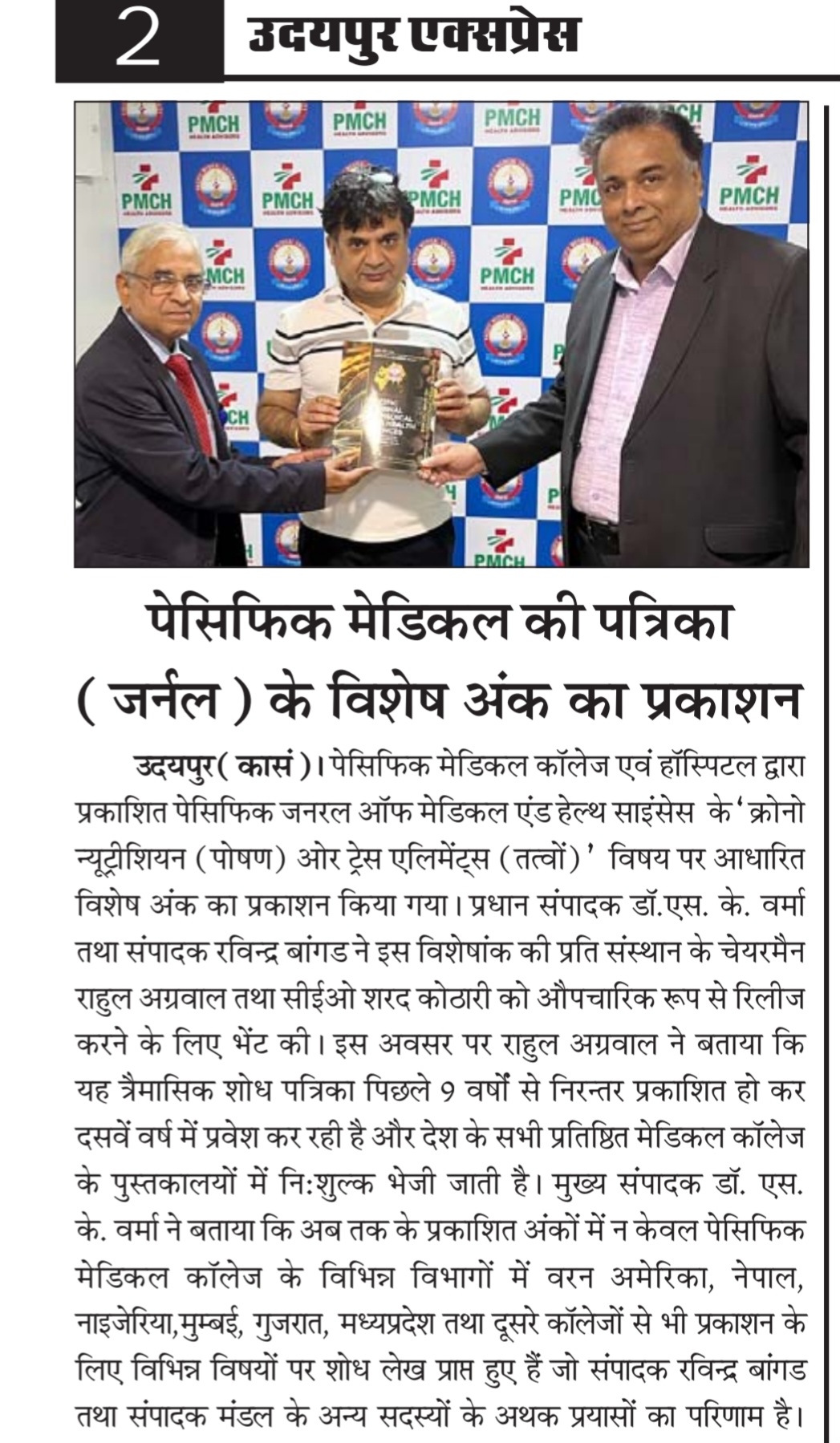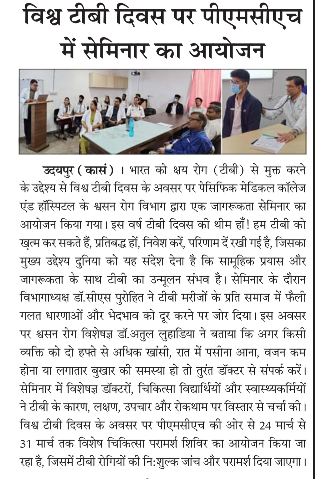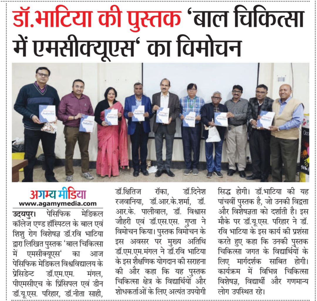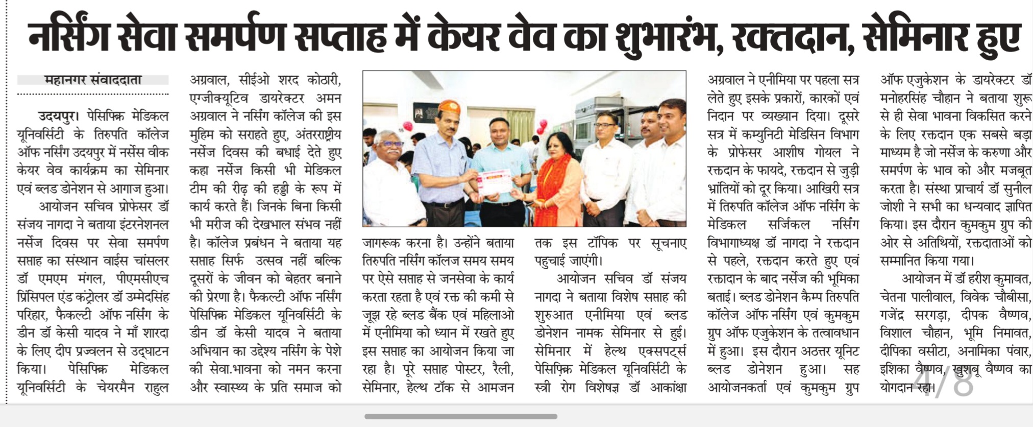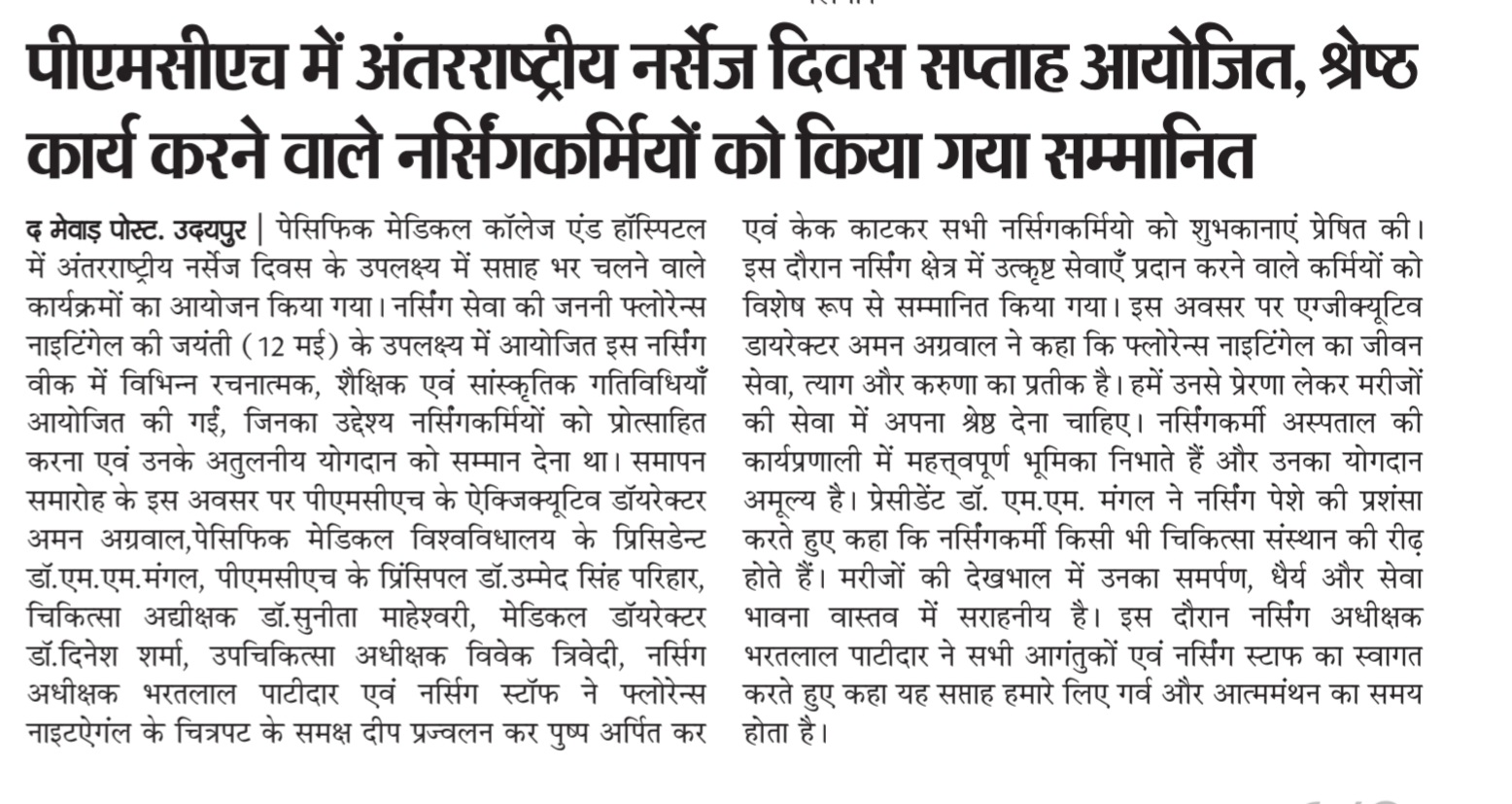рдкреЗрд╕рд┐рдлрд┐рдХ рдореЗрдбрд┐рдХрд▓ рдХреЙрд▓реЗрдЬ рдПрдВрдб рд╣реЙрд╕реНрдкрд┐рдЯрд▓, рднреАрд▓реЛрдВ рдХрд╛ рдмреЗрджрд▓рд╛ рдПрд╡рдВ рд╢реНрд░реА рдЕрдЧреНрд░рд╡рд╛рд▓ рджрд┐рдЧрдВрдмрд░ рдЬреИрди рдкрдВрдЪрд╛рдпрдд рдХреЗ рд╕рд╛рде рд╕рдВрдпреБрдХреНрдд рд╡рд┐рд╢рд╛рд▓ рдирд┐рд╢реБрд▓реНрдХ рдЪрд┐рдХрд┐рддреНрд╕рд╛ рдкрд░рд╛рдорд░реНрд╢,рдЬрд╛рдВрдЪ рдПрд╡рдВ рднрд░реНрддреА рд╢рд┐рд╡рд┐рд░ 29 рдЬреВрди рдХреЛ рд╢реНрд░реА 1008 рд╕реБрдорддрд┐ рдирд╛рде рдЕрдЧреНрд░рд╡рд╛рд▓ рджрд┐рдЧрдВрдмрд░ рдЬреИрди рдордВрджрд┐рд░ (рдЬреИрди рдмреЛрд░реНрдбрд┐рдЧ) рдзрд╛рдирдордВрдбреА рдЙрджрдпрдкреБрд░ рдХрд┐рдпрд╛ рдЬрд╛рдПрдЧрд╛ред рд╢рд┐рд╡рд┐рд░ рдХреБрдВрддреБрдХреБрдорд╛рд░рдЬреА рдЧрдгрдкрддреЛрдд, рдорд╣реЗрдВрджреНрд░рдЬреА рдЯрд╛рдпрд╛ рдПрд╡рдВ рдкрд╛рд░рд╕рдЬреА рд╕рд┐рдВрдШрд╡реА рджреНрд╡рд╛рд░рд╛ рдкреНрд░рд╛рддрдГ 9.30 рдмрдЬреЗ рдХрд┐рдпрд╛ рдЬрд╛рдПрдЧрд╛ред рдкреАрдПрдорд╕реАрдПрдЪ рдХреЗ рдРрдХреНрдЬрд┐рдХреНрдпреВрдЯрд┐рд╡ рдбреЙрдпрд░реЗрдХреНрдЯрд░ рдЕрдорди рдЕрдЧреНрд░рд╡рд╛рд▓ рдиреЗ рдЙрджрдШрд╛рдЯрди рдмрддрд╛рдпрд╛ рд╢рд┐рд╡рд┐рд░ рдореЗрдВ рдирд┐рд╢реБрд▓реНрдХ рдкрд░рд╛рдорд░реНрд╢ рдПрд╡рдВ рдмреНрд▓рдб рдкреНрд░реЗрд╢рд░ рдХреА рдЬрд╛рдВрдЪ рдХреЗ рд╕рд╛рде рд╣реА рд╢реБрдЧрд░, рдХреЛрд▓реЗрд╕реНрдЯреНрд░реЙрд▓, рд▓реАрд╡рд░, рдХрд┐рдбрдиреА, рдерд╛рдпрд░рд╛рдЗрдб, рдпреВрд░рд┐рдХ рдПрд╕рд┐рдб, рд╕реАрдмреАрд╕реА, рд╕рд┐рд░рдо рдкреАрдПрд╕рдП, рдпреВрд░реАрди рдЖрджрд┐ рдХреА рдЬреЙрдЪ рдирд┐рд╢реБрд▓реНрдХ рдХрд░рд╛рдИ рдЬрд╛рдПрдЧреАред рдЪрдпрдирд┐рдд рд░реЛрдЧрд┐рдпреЛрдВ рдХреЗ рд▓рд┐рдП рдЗрдХреЛ, рдЯреАрдПрдордЯреА, рд╕реЛрдиреЛрдЧреНрд░рд╛рдлреА, рдПрдХреНрд╕рд░реЗ, рдореИрдореЛрдЧреНрд░рд╛рдлреА, рдкреИрдВрдк рд╕реНрдореАрдпрд░ рдЖрджрд┐ рдХреА рдЬрд╛рдВрдЪ рдХреА рдЬрд╛рдПрдЧреАред рд╢рд┐рд╡рд┐рд░ рдореЗрдВ рдбреЙ. рдЕрддреБрд▓ рд▓реБрд╣рд╛рдбрд╝рд┐рдпрд╛, рдбреЙ. рд╕реА.рдкреА. рдкреБрд░реЛрд╣рд┐рдд, рдбреЙ. рдЕрдиреБрд░реЛрдз рд╢рд╛рдВрдбрд┐рд▓реНрдп, рдбреЙ. рд╣рдиреБрд╡рдВрдд рд╕рд┐рдВрд╣ рд░рд╛рдареМрдбрд╝, рдбреЙ. рдирд░реЗрдВрджреНрд░ рдорд▓, рдбреЙ. рдкреБрдиреАрдд,рдбреЙ.рдзрд╡рд▓ рдбреЙ. рдордпрдВрдХ рдЖрдореЗрдЯрд╛, рдбреЙ. рд░реЛрдиреА рдмрд╛рд▓рд╛, рдбреЙ. рд░рд╛рдо рдорд╣рд╛рдЬрди, рдбреЙ. рдордиреЛрдЬ рдЪреБрдВрдбрд╛рд╡рдд, рдбреЙ. рд╕реМрд░рдн рдЧреБрдкреНрддрд╛, рдбреЙ. рд╢рд░реНрдорд╛, рдЕрднрд┐рдЬреАрдд рдХрд╛рдХреЗ, рдбреЙ. рд░рд╛рдЬрдХреБрдорд╛рд░ рд╡рд░реНрдорд╛ рд╕рд╣рд┐рдд рдЕрдиреНрдп рдореЗрдбрд┐рдХрд▓ рд╕реНрдЯреЙрдл рдХреА рдкреВрд░реА рдЯреАрдо рдЕрдкрдиреА рдЙрддреНрдХреГрд╖реНрдЯ рд╕реЗрд╡рд╛рдПрдВ рджреЗрдиреЗ рдХреЗ рд▓рд┐рдП рддрддреНрдкрд░ рд░рд╣реЗрдЧреА ред рд╢рд┐рд╡рд┐рд░ рд╕рдВрдпреЛрдЬрдХ рдорд┐рддреЗрд╢ рдПрд╡ рдЕрдЬрдп рдиреЗ рдмрддрд╛рдпрд╛ рдХрд┐ рдЪрдпрдирд┐рдд рд░реЛрдЧрд┐рдпреЛ рдХреЗ рд▓рд┐рдП рд╡рд┐рд╢реЗрд╖ рдирд┐рд╢реБрд▓реНрдХ рд╕рд░реНрдЬрд┐рдХрд▓ рд╕реЗрд╡рд╛рдУ рдХреЗ рддрд╣рдд рдореЛрддрд┐рдпрд╛рдмрд┐рдВрдж рдСрдкрд░реЗрд╢рди (рд▓реЗрдВрд╕ рд╕рд╣рд┐рдд),рд╣рд░реНрдирд┐рдпрд╛, рдЕрдкреЗрдВрдбрд┐рдХреНрд╕, рдирд╛рдХ рдХрд╛р