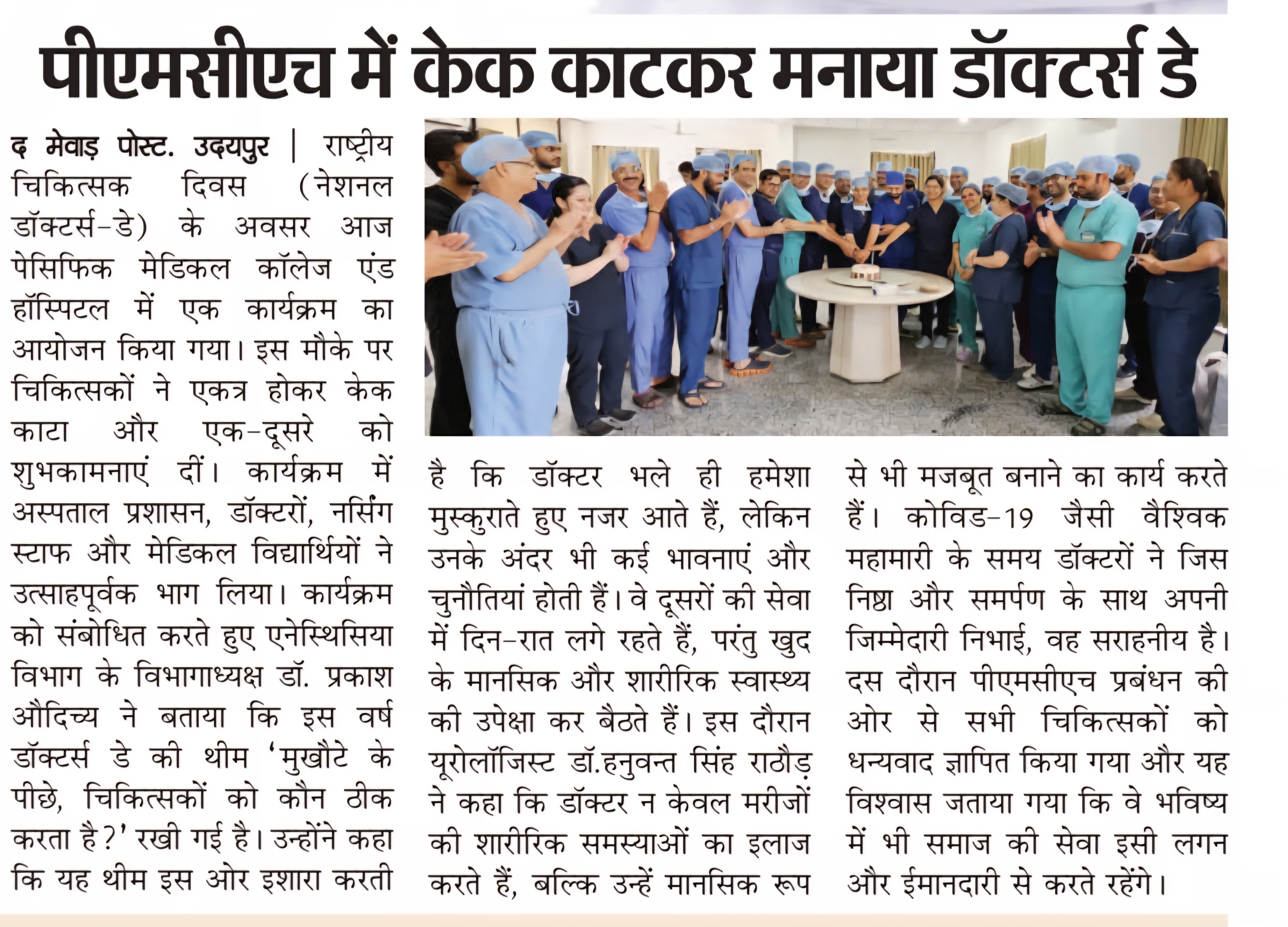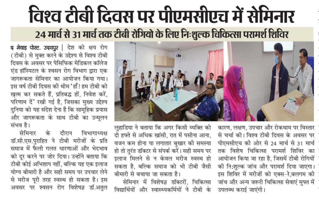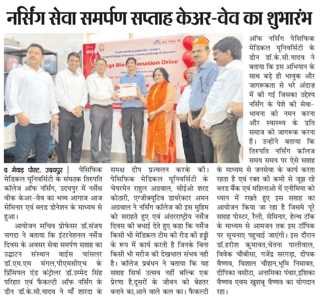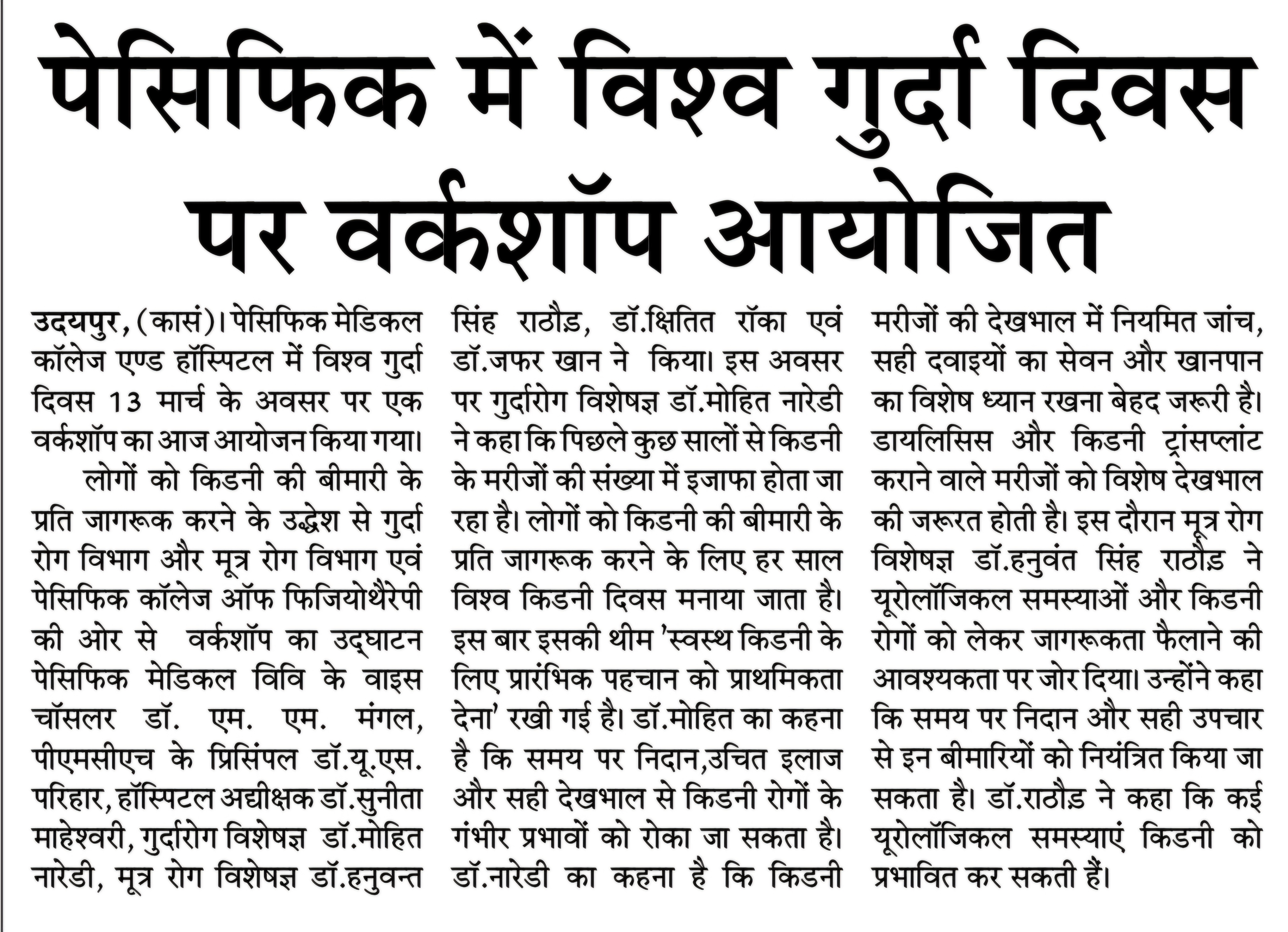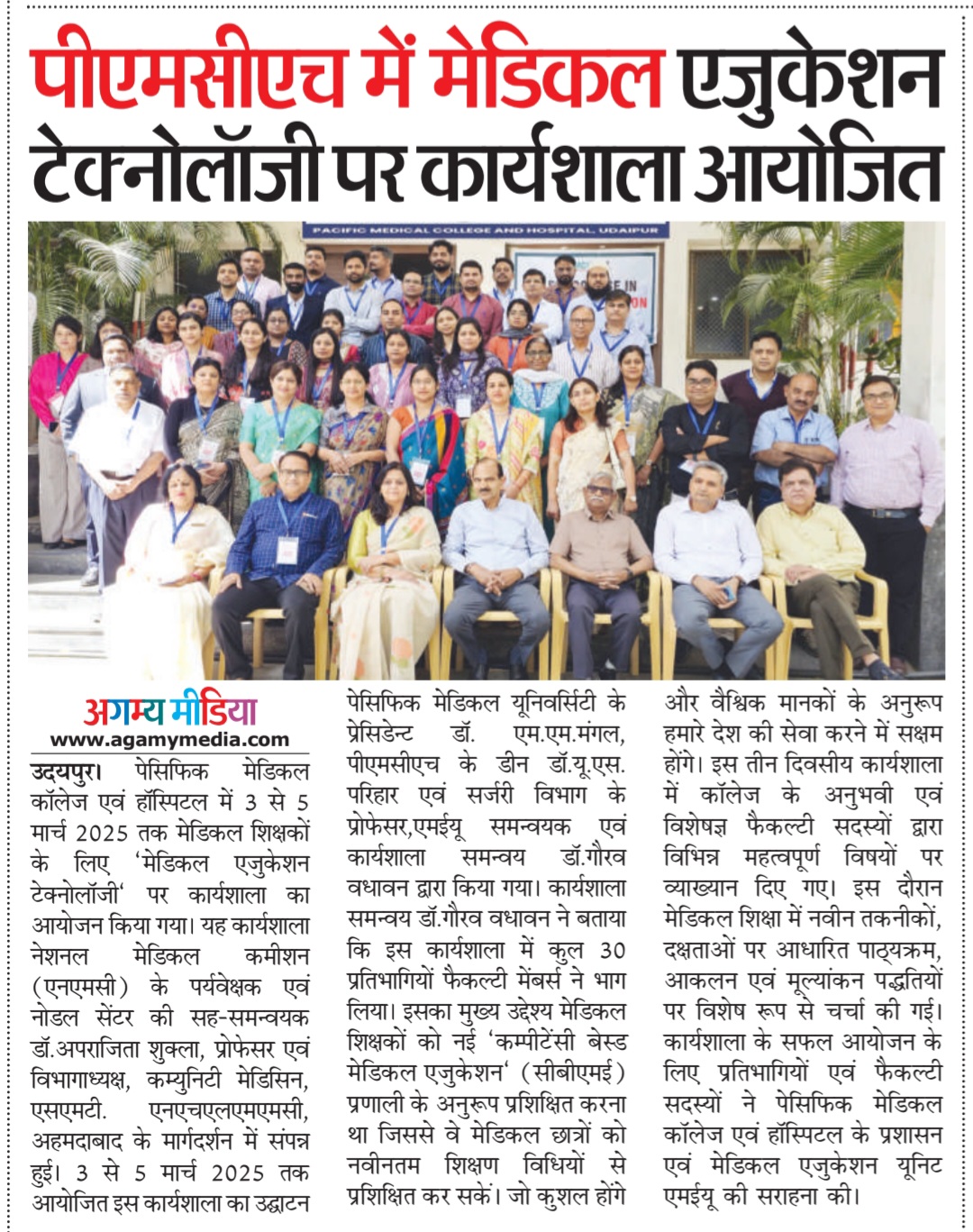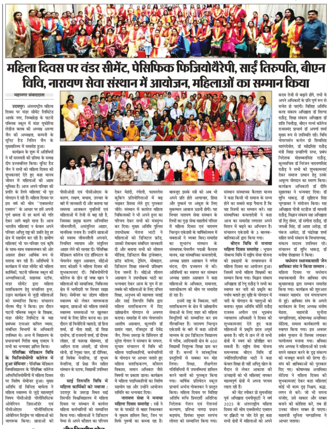 рдкреЗрд╕рд┐рдлрд┐рдХ рдореЗрдбрд┐рдХрд▓ рдХреЙрд▓реЗрдЬ рдПрдВрдб рд╣реЙрд╕реНрдкрд┐рдЯрд▓, рднреАрд▓реЛрдВ рдХрд╛ рдмреЗрджрд▓рд╛ рдПрд╡рдВ рд╢реНрд░реА рдЕрдЧреНрд░рд╡рд╛рд▓ рджрд┐рдЧрдВрдмрд░ рдЬреИрди рдкрдВрдЪрд╛рдпрдд рдХреЗ рд╕рд╛рде рд╕рдВрдпреБрдХреНрдд рд╡рд┐рд╢рд╛рд▓ рдирд┐рд╢реБрд▓реНрдХ рдЪрд┐рдХрд┐рддреНрд╕рд╛ рдкрд░рд╛рдорд░реНрд╢,рдЬрд╛рдВрдЪ рдПрд╡рдВ рднрд░реНрддреА рд╢рд┐рд╡рд┐рд░ 29 рдЬреВрди рдХреЛ рд╢реНрд░реА 1008 рд╕реБрдорддрд┐ рдирд╛рде рдЕрдЧреНрд░рд╡рд╛рд▓ рджрд┐рдЧрдВрдмрд░ рдЬреИрди рдордВрджрд┐рд░ (рдЬреИрди рдмреЛрд░реНрдбрд┐рдЧ) рдзрд╛рдирдордВрдбреА рдЙрджрдпрдкреБрд░ рдХрд┐рдпрд╛ рдЬрд╛рдПрдЧрд╛ред рд╢рд┐рд╡рд┐рд░ рдХреБрдВрддреБрдХреБрдорд╛рд░рдЬреА рдЧрдгрдкрддреЛрдд, рдорд╣реЗрдВрджреНрд░рдЬреА рдЯрд╛рдпрд╛ рдПрд╡рдВ рдкрд╛рд░рд╕рдЬреА рд╕рд┐рдВрдШрд╡реА рджреНрд╡рд╛рд░рд╛ рдкреНрд░рд╛рддрдГ 9.30 рдмрдЬреЗ рдХрд┐рдпрд╛ рдЬрд╛рдПрдЧрд╛ред рдкреАрдПрдорд╕реАрдПрдЪ рдХреЗ рдРрдХреНрдЬрд┐рдХреНрдпреВрдЯрд┐рд╡ рдбреЙрдпрд░реЗрдХреНрдЯрд░ рдЕрдорди рдЕрдЧреНрд░рд╡рд╛рд▓ рдиреЗ рдЙрджрдШрд╛рдЯрди рдмрддрд╛рдпрд╛ рд╢рд┐рд╡рд┐рд░ рдореЗрдВ рдирд┐рд╢реБрд▓реНрдХ рдкрд░рд╛рдорд░реНрд╢ рдПрд╡рдВ рдмреНрд▓рдб рдкреНрд░реЗрд╢рд░ рдХреА рдЬрд╛рдВрдЪ рдХреЗ рд╕рд╛рде рд╣реА рд╢реБрдЧрд░, рдХреЛрд▓реЗрд╕реНрдЯреНрд░реЙрд▓, рд▓реАрд╡рд░, рдХрд┐рдбрдиреА, рдерд╛рдпрд░рд╛рдЗрдб, рдпреВрд░рд┐рдХ рдПрд╕рд┐рдб, рд╕реАрдмреАрд╕реА, рд╕рд┐рд░рдо рдкреАрдПрд╕рдП, рдпреВрд░реАрди рдЖрджрд┐ рдХреА рдЬреЙрдЪ рдирд┐рд╢реБрд▓реНрдХ рдХрд░рд╛рдИ рдЬрд╛рдПрдЧреАред рдЪрдпрдирд┐рдд рд░реЛрдЧрд┐рдпреЛрдВ рдХреЗ рд▓рд┐рдП рдЗрдХреЛ, рдЯреАрдПрдордЯреА, рд╕реЛрдиреЛрдЧреНрд░рд╛рдлреА, рдПрдХреНрд╕рд░реЗ, рдореИрдореЛрдЧреНрд░рд╛рдлреА, рдкреИрдВрдк рд╕реНрдореАрдпрд░ рдЖрджрд┐ рдХреА рдЬрд╛рдВрдЪ рдХреА рдЬрд╛рдПрдЧреАред рд╢рд┐рд╡рд┐рд░ рдореЗрдВ рдбреЙ. рдЕрддреБрд▓ рд▓реБрд╣рд╛рдбрд╝рд┐рдпрд╛, рдбреЙ. рд╕реА.рдкреА. рдкреБрд░реЛрд╣рд┐рдд, рдбреЙ. рдЕрдиреБрд░реЛрдз рд╢рд╛рдВрдбрд┐рд▓реНрдп, рдбреЙ. рд╣рдиреБрд╡рдВрдд рд╕рд┐рдВрд╣ рд░рд╛рдареМрдбрд╝, рдбреЙ. рдирд░реЗрдВрджреНрд░ рдорд▓, рдбреЙ. рдкреБрдиреАрдд,рдбреЙ.рдзрд╡рд▓ рдбреЙ. рдордпрдВрдХ рдЖрдореЗрдЯрд╛, рдбреЙ. рд░реЛрдиреА рдмрд╛рд▓рд╛, рдбреЙ. рд░рд╛рдо рдорд╣рд╛рдЬрди, рдбреЙ. рдордиреЛрдЬ рдЪреБрдВрдбрд╛рд╡рдд, рдбреЙ. рд╕реМрд░рдн рдЧреБрдкреНрддрд╛, рдбреЙ. рд╢рд░реНрдорд╛, рдЕрднрд┐рдЬреАрдд рдХрд╛рдХреЗ, рдбреЙ. рд░рд╛рдЬрдХреБрдорд╛рд░ рд╡рд░реНрдорд╛ рд╕рд╣рд┐рдд рдЕрдиреНрдп рдореЗрдбрд┐рдХрд▓ рд╕реНрдЯреЙрдл рдХреА рдкреВрд░реА рдЯреАрдо рдЕрдкрдиреА рдЙрддреНрдХреГрд╖реНрдЯ рд╕реЗрд╡рд╛рдПрдВ рджреЗрдиреЗ рдХреЗ рд▓рд┐рдП рддрддреНрдкрд░ рд░рд╣реЗрдЧреА ред рд╢рд┐рд╡рд┐рд░ рд╕рдВрдпреЛрдЬрдХ рдорд┐рддреЗрд╢ рдПрд╡ рдЕрдЬрдп рдиреЗ рдмрддрд╛рдпрд╛ рдХрд┐ рдЪрдпрдирд┐рдд рд░реЛрдЧрд┐рдпреЛ рдХреЗ рд▓рд┐рдП рд╡рд┐рд╢реЗрд╖ рдирд┐рд╢реБрд▓реНрдХ рд╕рд░реНрдЬрд┐рдХрд▓ рд╕реЗрд╡рд╛рдУ рдХреЗ рддрд╣рдд рдореЛрддрд┐рдпрд╛рдмрд┐рдВрдж рдСрдкрд░реЗрд╢рди (рд▓реЗрдВрд╕ рд╕рд╣рд┐рдд),рд╣рд░реНрдирд┐рдпрд╛, рдЕрдкреЗрдВрдбрд┐рдХреНрд╕, рдирд╛рдХ рдХрд╛р