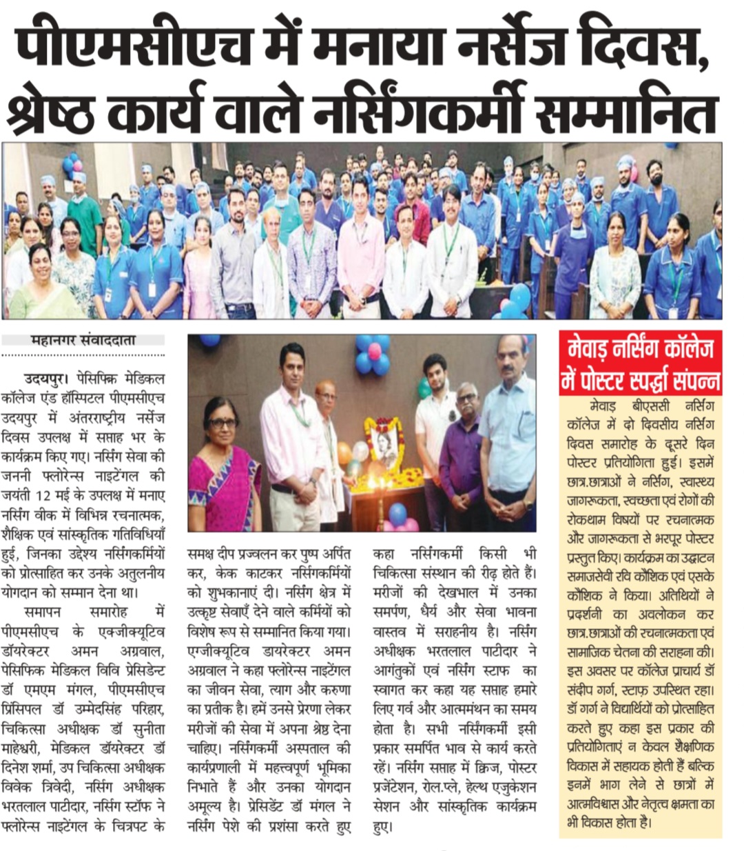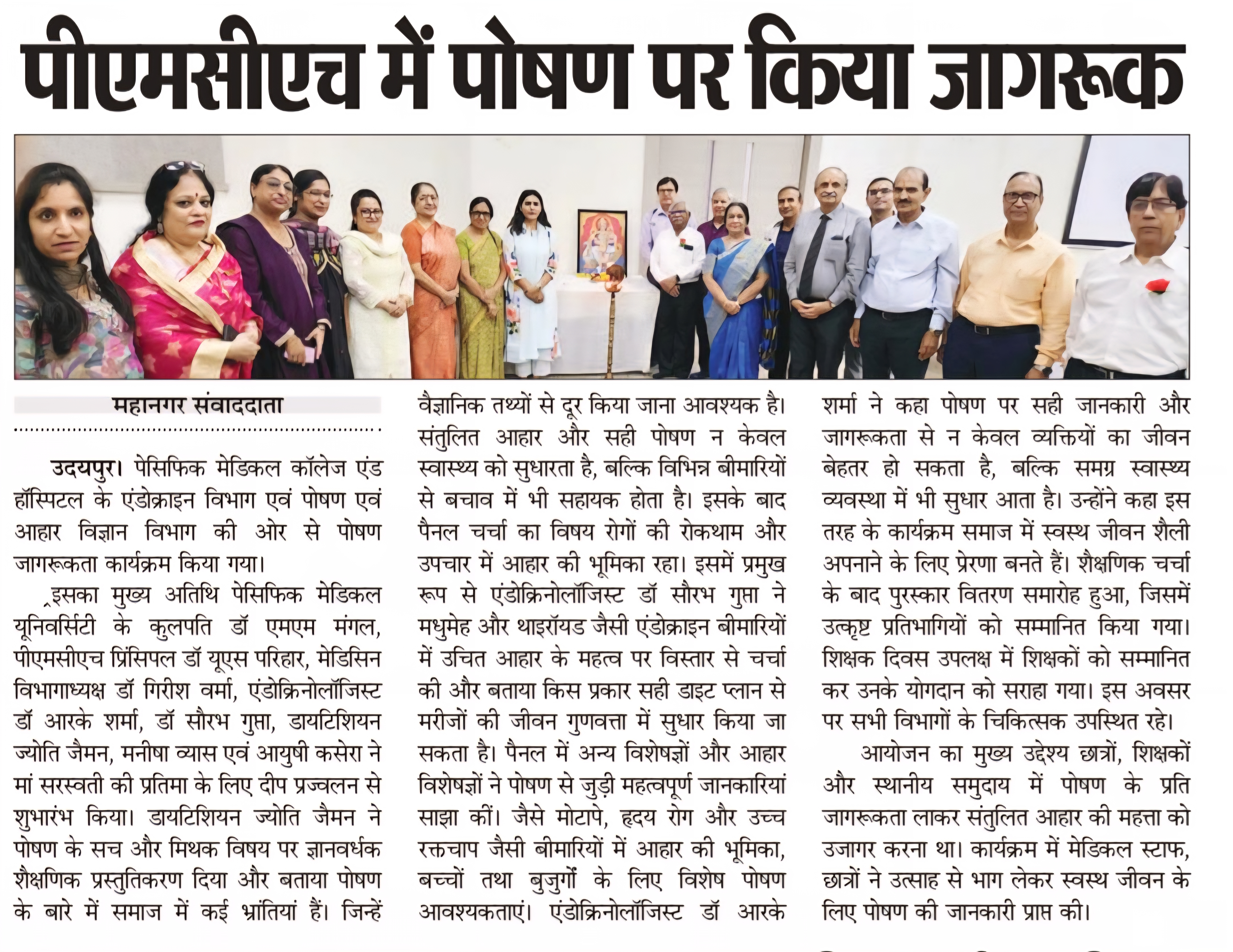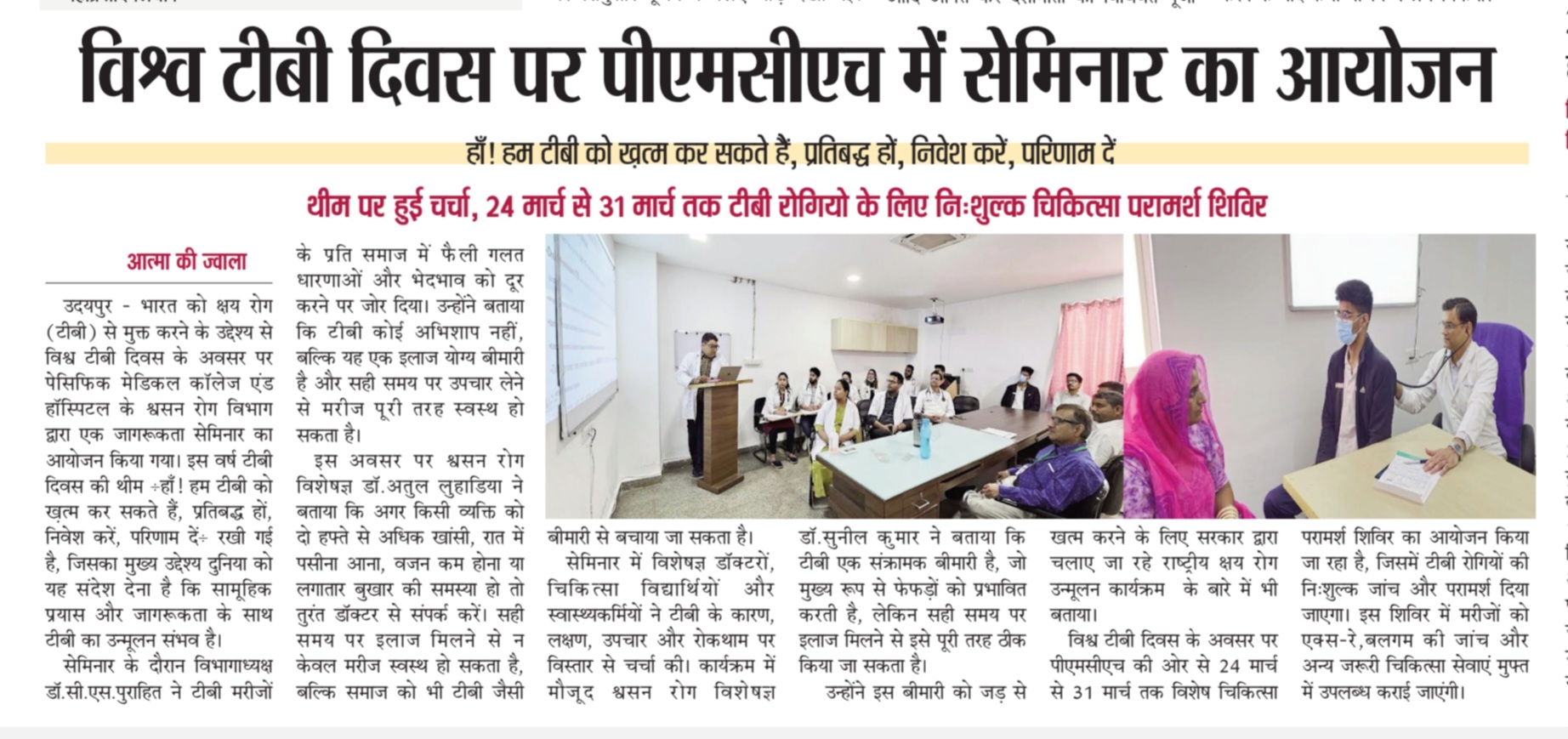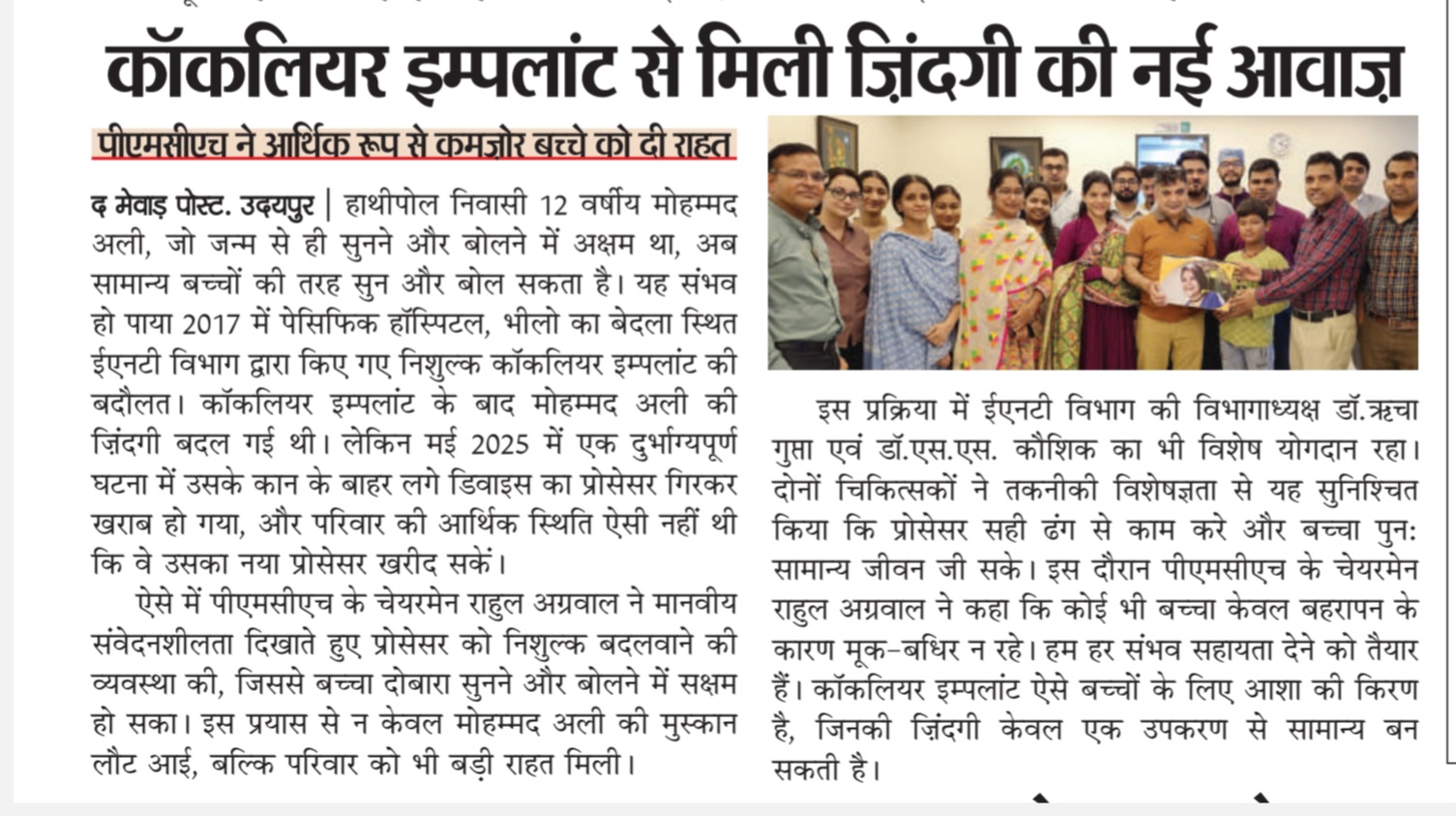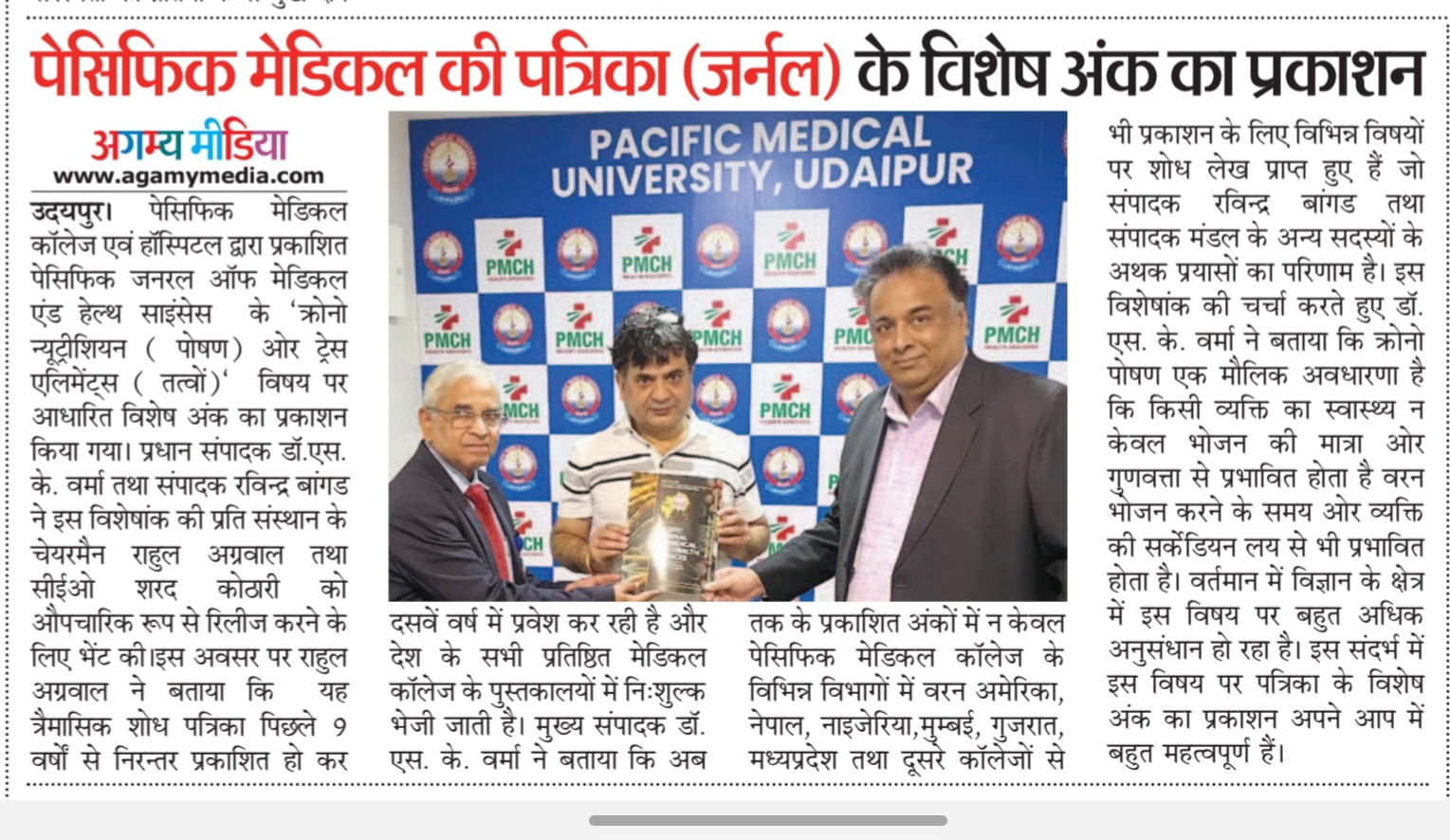 рдкреЗрд╕рд┐рдлрд┐рдХ рдореЗрдбрд┐рдХрд▓ рдХреЙрд▓реЗрдЬ рдПрдВрдб рд╣реЙрд╕реНрдкрд┐рдЯрд▓, рднреАрд▓реЛрдВ рдХрд╛ рдмреЗрджрд▓рд╛ рдПрд╡рдВ рд╢реНрд░реА рдЕрдЧреНрд░рд╡рд╛рд▓ рджрд┐рдЧрдВрдмрд░ рдЬреИрди рдкрдВрдЪрд╛рдпрдд рдХреЗ рд╕рд╛рде рд╕рдВрдпреБрдХреНрдд рд╡рд┐рд╢рд╛рд▓ рдирд┐рд╢реБрд▓реНрдХ рдЪрд┐рдХрд┐рддреНрд╕рд╛ рдкрд░рд╛рдорд░реНрд╢,рдЬрд╛рдВрдЪ рдПрд╡рдВ рднрд░реНрддреА рд╢рд┐рд╡рд┐рд░ 29 рдЬреВрди рдХреЛ рд╢реНрд░реА 1008 рд╕реБрдорддрд┐ рдирд╛рде рдЕрдЧреНрд░рд╡рд╛рд▓ рджрд┐рдЧрдВрдмрд░ рдЬреИрди рдордВрджрд┐рд░ (рдЬреИрди рдмреЛрд░реНрдбрд┐рдЧ) рдзрд╛рдирдордВрдбреА рдЙрджрдпрдкреБрд░ рдХрд┐рдпрд╛ рдЬрд╛рдПрдЧрд╛ред рд╢рд┐рд╡рд┐рд░ рдХреБрдВрддреБрдХреБрдорд╛рд░рдЬреА рдЧрдгрдкрддреЛрдд, рдорд╣реЗрдВрджреНрд░рдЬреА рдЯрд╛рдпрд╛ рдПрд╡рдВ рдкрд╛рд░рд╕рдЬреА рд╕рд┐рдВрдШрд╡реА рджреНрд╡рд╛рд░рд╛ рдкреНрд░рд╛рддрдГ 9.30 рдмрдЬреЗ рдХрд┐рдпрд╛ рдЬрд╛рдПрдЧрд╛ред рдкреАрдПрдорд╕реАрдПрдЪ рдХреЗ рдРрдХреНрдЬрд┐рдХреНрдпреВрдЯрд┐рд╡ рдбреЙрдпрд░реЗрдХреНрдЯрд░ рдЕрдорди рдЕрдЧреНрд░рд╡рд╛рд▓ рдиреЗ рдЙрджрдШрд╛рдЯрди рдмрддрд╛рдпрд╛ рд╢рд┐рд╡рд┐рд░ рдореЗрдВ рдирд┐рд╢реБрд▓реНрдХ рдкрд░рд╛рдорд░реНрд╢ рдПрд╡рдВ рдмреНрд▓рдб рдкреНрд░реЗрд╢рд░ рдХреА рдЬрд╛рдВрдЪ рдХреЗ рд╕рд╛рде рд╣реА рд╢реБрдЧрд░, рдХреЛрд▓реЗрд╕реНрдЯреНрд░реЙрд▓, рд▓реАрд╡рд░, рдХрд┐рдбрдиреА, рдерд╛рдпрд░рд╛рдЗрдб, рдпреВрд░рд┐рдХ рдПрд╕рд┐рдб, рд╕реАрдмреАрд╕реА, рд╕рд┐рд░рдо рдкреАрдПрд╕рдП, рдпреВрд░реАрди рдЖрджрд┐ рдХреА рдЬреЙрдЪ рдирд┐рд╢реБрд▓реНрдХ рдХрд░рд╛рдИ рдЬрд╛рдПрдЧреАред рдЪрдпрдирд┐рдд рд░реЛрдЧрд┐рдпреЛрдВ рдХреЗ рд▓рд┐рдП рдЗрдХреЛ, рдЯреАрдПрдордЯреА, рд╕реЛрдиреЛрдЧреНрд░рд╛рдлреА, рдПрдХреНрд╕рд░реЗ, рдореИрдореЛрдЧреНрд░рд╛рдлреА, рдкреИрдВрдк рд╕реНрдореАрдпрд░ рдЖрджрд┐ рдХреА рдЬрд╛рдВрдЪ рдХреА рдЬрд╛рдПрдЧреАред рд╢рд┐рд╡рд┐рд░ рдореЗрдВ рдбреЙ. рдЕрддреБрд▓ рд▓реБрд╣рд╛рдбрд╝рд┐рдпрд╛, рдбреЙ. рд╕реА.рдкреА. рдкреБрд░реЛрд╣рд┐рдд, рдбреЙ. рдЕрдиреБрд░реЛрдз рд╢рд╛рдВрдбрд┐рд▓реНрдп, рдбреЙ. рд╣рдиреБрд╡рдВрдд рд╕рд┐рдВрд╣ рд░рд╛рдареМрдбрд╝, рдбреЙ. рдирд░реЗрдВрджреНрд░ рдорд▓, рдбреЙ. рдкреБрдиреАрдд,рдбреЙ.рдзрд╡рд▓ рдбреЙ. рдордпрдВрдХ рдЖрдореЗрдЯрд╛, рдбреЙ. рд░реЛрдиреА рдмрд╛рд▓рд╛, рдбреЙ. рд░рд╛рдо рдорд╣рд╛рдЬрди, рдбреЙ. рдордиреЛрдЬ рдЪреБрдВрдбрд╛рд╡рдд, рдбреЙ. рд╕реМрд░рдн рдЧреБрдкреНрддрд╛, рдбреЙ. рд╢рд░реНрдорд╛, рдЕрднрд┐рдЬреАрдд рдХрд╛рдХреЗ, рдбреЙ. рд░рд╛рдЬрдХреБрдорд╛рд░ рд╡рд░реНрдорд╛ рд╕рд╣рд┐рдд рдЕрдиреНрдп рдореЗрдбрд┐рдХрд▓ рд╕реНрдЯреЙрдл рдХреА рдкреВрд░реА рдЯреАрдо рдЕрдкрдиреА рдЙрддреНрдХреГрд╖реНрдЯ рд╕реЗрд╡рд╛рдПрдВ рджреЗрдиреЗ рдХреЗ рд▓рд┐рдП рддрддреНрдкрд░ рд░рд╣реЗрдЧреА ред рд╢рд┐рд╡рд┐рд░ рд╕рдВрдпреЛрдЬрдХ рдорд┐рддреЗрд╢ рдПрд╡ рдЕрдЬрдп рдиреЗ рдмрддрд╛рдпрд╛ рдХрд┐ рдЪрдпрдирд┐рдд рд░реЛрдЧрд┐рдпреЛ рдХреЗ рд▓рд┐рдП рд╡рд┐рд╢реЗрд╖ рдирд┐рд╢реБрд▓реНрдХ рд╕рд░реНрдЬрд┐рдХрд▓ рд╕реЗрд╡рд╛рдУ рдХреЗ рддрд╣рдд рдореЛрддрд┐рдпрд╛рдмрд┐рдВрдж рдСрдкрд░реЗрд╢рди (рд▓реЗрдВрд╕ рд╕рд╣рд┐рдд),рд╣рд░реНрдирд┐рдпрд╛, рдЕрдкреЗрдВрдбрд┐рдХреНрд╕, рдирд╛рдХ рдХрд╛р