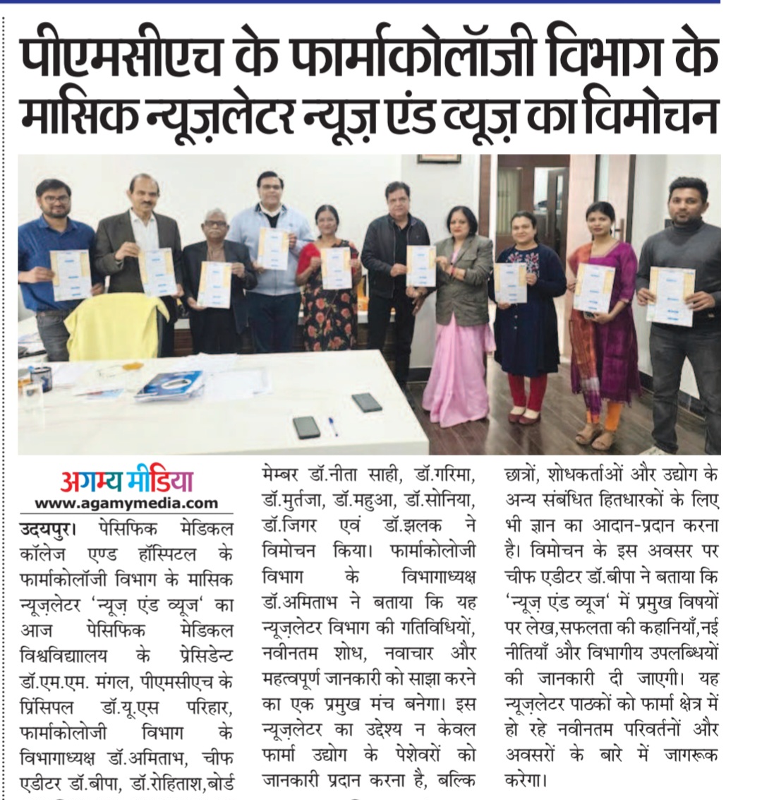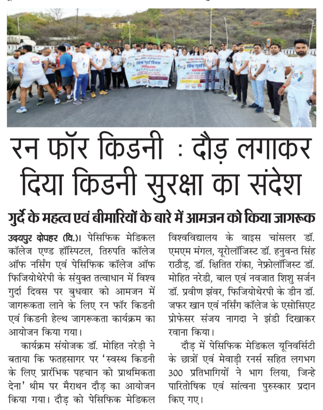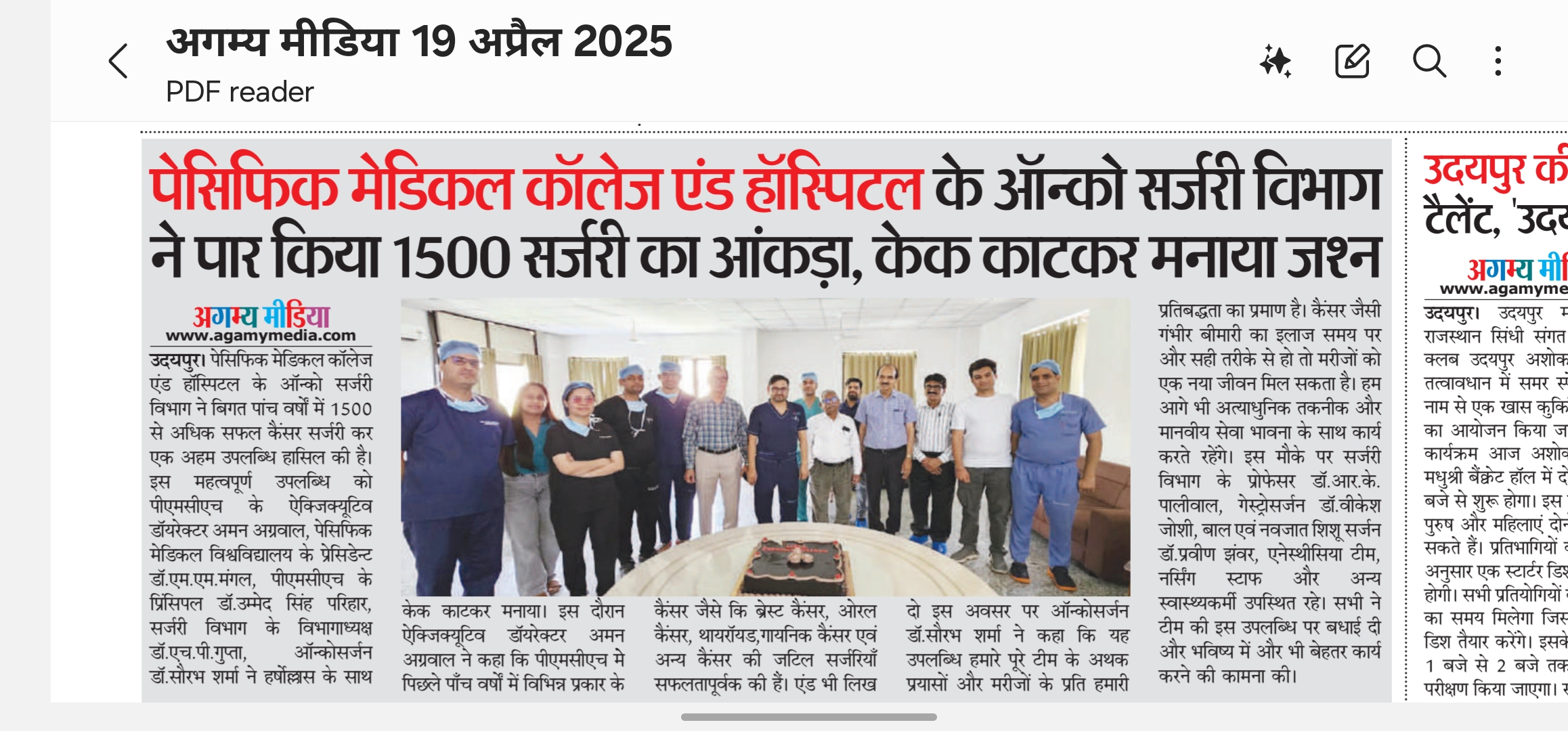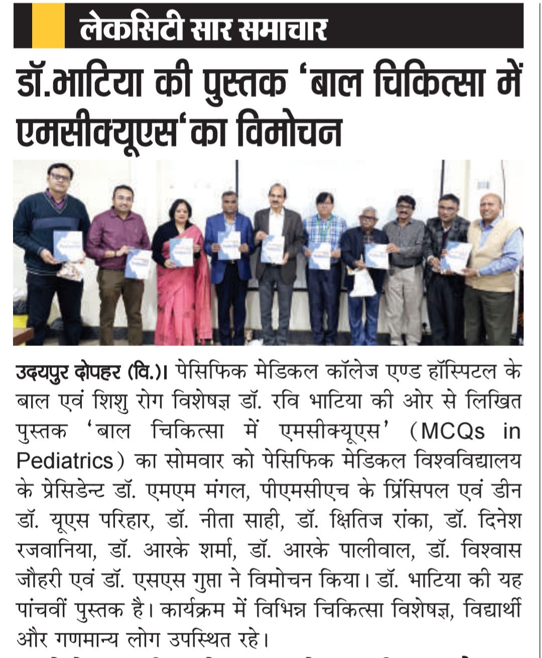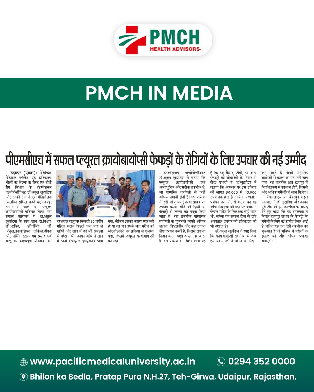 рдкреЗрд╕рд┐рдлрд┐рдХ рдореЗрдбрд┐рдХрд▓ рдХреЙрд▓реЗрдЬ рдПрдВрдб рд╣реЙрд╕реНрдкрд┐рдЯрд▓, рднреАрд▓реЛрдВ рдХрд╛ рдмреЗрджрд▓рд╛ рдПрд╡рдВ рд╢реНрд░реА рдЕрдЧреНрд░рд╡рд╛рд▓ рджрд┐рдЧрдВрдмрд░ рдЬреИрди рдкрдВрдЪрд╛рдпрдд рдХреЗ рд╕рд╛рде рд╕рдВрдпреБрдХреНрдд рд╡рд┐рд╢рд╛рд▓ рдирд┐рд╢реБрд▓реНрдХ рдЪрд┐рдХрд┐рддреНрд╕рд╛ рдкрд░рд╛рдорд░реНрд╢,рдЬрд╛рдВрдЪ рдПрд╡рдВ рднрд░реНрддреА рд╢рд┐рд╡рд┐рд░ 29 рдЬреВрди рдХреЛ рд╢реНрд░реА 1008 рд╕реБрдорддрд┐ рдирд╛рде рдЕрдЧреНрд░рд╡рд╛рд▓ рджрд┐рдЧрдВрдмрд░ рдЬреИрди рдордВрджрд┐рд░ (рдЬреИрди рдмреЛрд░реНрдбрд┐рдЧ) рдзрд╛рдирдордВрдбреА рдЙрджрдпрдкреБрд░ рдХрд┐рдпрд╛ рдЬрд╛рдПрдЧрд╛ред рд╢рд┐рд╡рд┐рд░ рдХреБрдВрддреБрдХреБрдорд╛рд░рдЬреА рдЧрдгрдкрддреЛрдд, рдорд╣реЗрдВрджреНрд░рдЬреА рдЯрд╛рдпрд╛ рдПрд╡рдВ рдкрд╛рд░рд╕рдЬреА рд╕рд┐рдВрдШрд╡реА рджреНрд╡рд╛рд░рд╛ рдкреНрд░рд╛рддрдГ 9.30 рдмрдЬреЗ рдХрд┐рдпрд╛ рдЬрд╛рдПрдЧрд╛ред рдкреАрдПрдорд╕реАрдПрдЪ рдХреЗ рдРрдХреНрдЬрд┐рдХреНрдпреВрдЯрд┐рд╡ рдбреЙрдпрд░реЗрдХреНрдЯрд░ рдЕрдорди рдЕрдЧреНрд░рд╡рд╛рд▓ рдиреЗ рдЙрджрдШрд╛рдЯрди рдмрддрд╛рдпрд╛ рд╢рд┐рд╡рд┐рд░ рдореЗрдВ рдирд┐рд╢реБрд▓реНрдХ рдкрд░рд╛рдорд░реНрд╢ рдПрд╡рдВ рдмреНрд▓рдб рдкреНрд░реЗрд╢рд░ рдХреА рдЬрд╛рдВрдЪ рдХреЗ рд╕рд╛рде рд╣реА рд╢реБрдЧрд░, рдХреЛрд▓реЗрд╕реНрдЯреНрд░реЙрд▓, рд▓реАрд╡рд░, рдХрд┐рдбрдиреА, рдерд╛рдпрд░рд╛рдЗрдб, рдпреВрд░рд┐рдХ рдПрд╕рд┐рдб, рд╕реАрдмреАрд╕реА, рд╕рд┐рд░рдо рдкреАрдПрд╕рдП, рдпреВрд░реАрди рдЖрджрд┐ рдХреА рдЬреЙрдЪ рдирд┐рд╢реБрд▓реНрдХ рдХрд░рд╛рдИ рдЬрд╛рдПрдЧреАред рдЪрдпрдирд┐рдд рд░реЛрдЧрд┐рдпреЛрдВ рдХреЗ рд▓рд┐рдП рдЗрдХреЛ, рдЯреАрдПрдордЯреА, рд╕реЛрдиреЛрдЧреНрд░рд╛рдлреА, рдПрдХреНрд╕рд░реЗ, рдореИрдореЛрдЧреНрд░рд╛рдлреА, рдкреИрдВрдк рд╕реНрдореАрдпрд░ рдЖрджрд┐ рдХреА рдЬрд╛рдВрдЪ рдХреА рдЬрд╛рдПрдЧреАред рд╢рд┐рд╡рд┐рд░ рдореЗрдВ рдбреЙ. рдЕрддреБрд▓ рд▓реБрд╣рд╛рдбрд╝рд┐рдпрд╛, рдбреЙ. рд╕реА.рдкреА. рдкреБрд░реЛрд╣рд┐рдд, рдбреЙ. рдЕрдиреБрд░реЛрдз рд╢рд╛рдВрдбрд┐рд▓реНрдп, рдбреЙ. рд╣рдиреБрд╡рдВрдд рд╕рд┐рдВрд╣ рд░рд╛рдареМрдбрд╝, рдбреЙ. рдирд░реЗрдВрджреНрд░ рдорд▓, рдбреЙ. рдкреБрдиреАрдд,рдбреЙ.рдзрд╡рд▓ рдбреЙ. рдордпрдВрдХ рдЖрдореЗрдЯрд╛, рдбреЙ. рд░реЛрдиреА рдмрд╛рд▓рд╛, рдбреЙ. рд░рд╛рдо рдорд╣рд╛рдЬрди, рдбреЙ. рдордиреЛрдЬ рдЪреБрдВрдбрд╛рд╡рдд, рдбреЙ. рд╕реМрд░рдн рдЧреБрдкреНрддрд╛, рдбреЙ. рд╢рд░реНрдорд╛, рдЕрднрд┐рдЬреАрдд рдХрд╛рдХреЗ, рдбреЙ. рд░рд╛рдЬрдХреБрдорд╛рд░ рд╡рд░реНрдорд╛ рд╕рд╣рд┐рдд рдЕрдиреНрдп рдореЗрдбрд┐рдХрд▓ рд╕реНрдЯреЙрдл рдХреА рдкреВрд░реА рдЯреАрдо рдЕрдкрдиреА рдЙрддреНрдХреГрд╖реНрдЯ рд╕реЗрд╡рд╛рдПрдВ рджреЗрдиреЗ рдХреЗ рд▓рд┐рдП рддрддреНрдкрд░ рд░рд╣реЗрдЧреА ред рд╢рд┐рд╡рд┐рд░ рд╕рдВрдпреЛрдЬрдХ рдорд┐рддреЗрд╢ рдПрд╡ рдЕрдЬрдп рдиреЗ рдмрддрд╛рдпрд╛ рдХрд┐ рдЪрдпрдирд┐рдд рд░реЛрдЧрд┐рдпреЛ рдХреЗ рд▓рд┐рдП рд╡рд┐рд╢реЗрд╖ рдирд┐рд╢реБрд▓реНрдХ рд╕рд░реНрдЬрд┐рдХрд▓ рд╕реЗрд╡рд╛рдУ рдХреЗ рддрд╣рдд рдореЛрддрд┐рдпрд╛рдмрд┐рдВрдж рдСрдкрд░реЗрд╢рди (рд▓реЗрдВрд╕ рд╕рд╣рд┐рдд),рд╣рд░реНрдирд┐рдпрд╛, рдЕрдкреЗрдВрдбрд┐рдХреНрд╕, рдирд╛рдХ рдХрд╛р