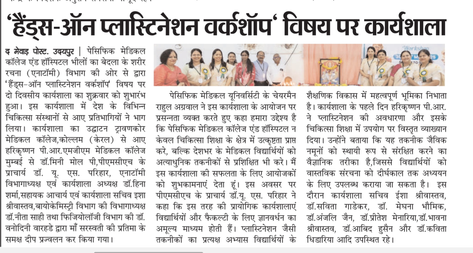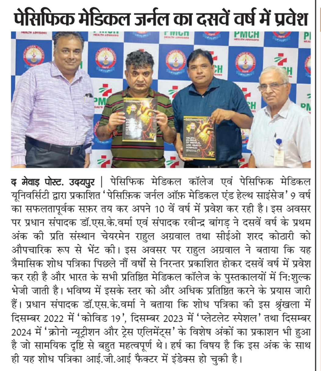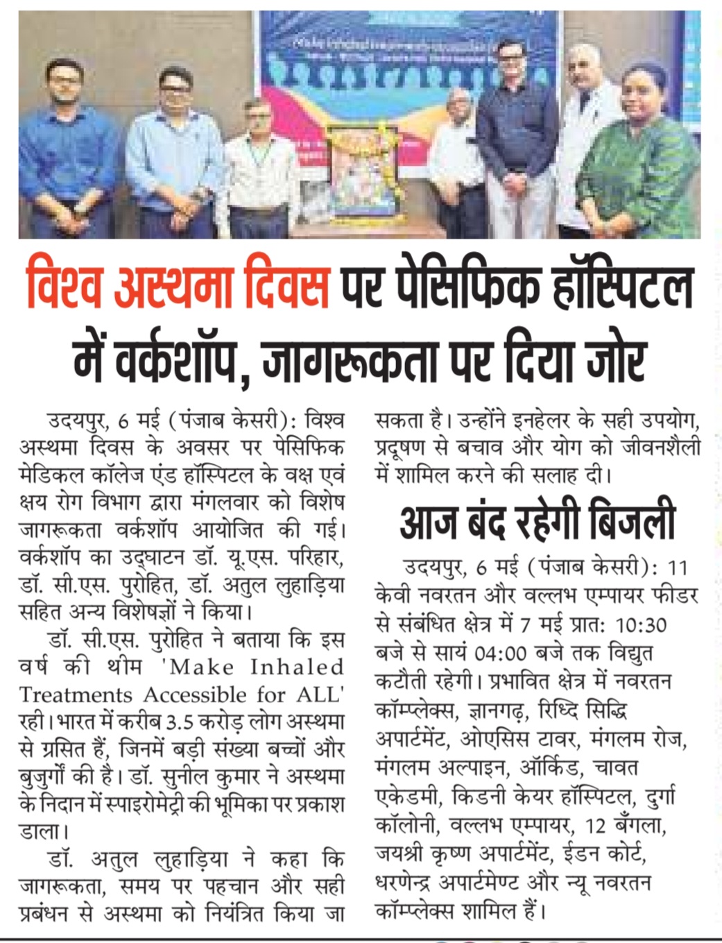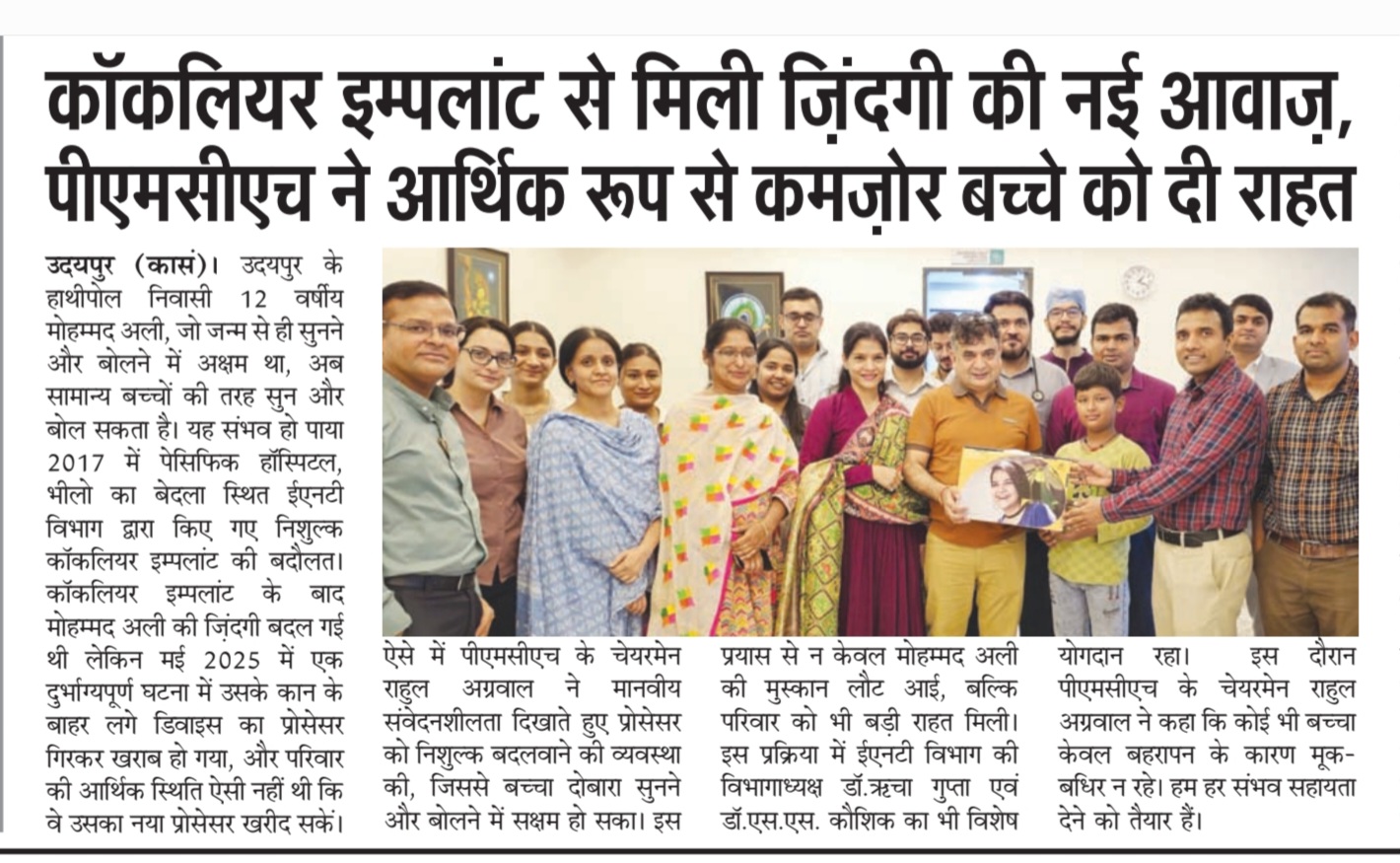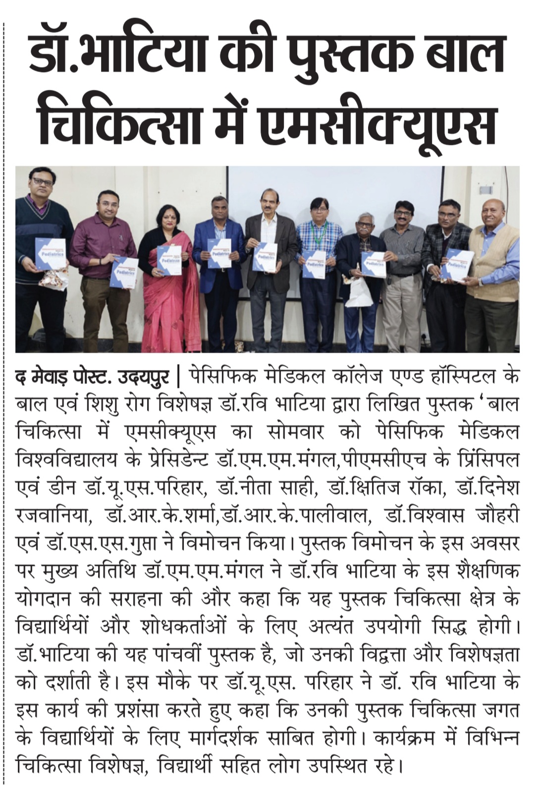 рдкреЗрд╕рд┐рдлрд┐рдХ рдореЗрдбрд┐рдХрд▓ рдХреЙрд▓реЗрдЬ рдПрдВрдб рд╣реЙрд╕реНрдкрд┐рдЯрд▓, рднреАрд▓реЛрдВ рдХрд╛ рдмреЗрджрд▓рд╛ рдПрд╡рдВ рд╢реНрд░реА рдЕрдЧреНрд░рд╡рд╛рд▓ рджрд┐рдЧрдВрдмрд░ рдЬреИрди рдкрдВрдЪрд╛рдпрдд рдХреЗ рд╕рд╛рде рд╕рдВрдпреБрдХреНрдд рд╡рд┐рд╢рд╛рд▓ рдирд┐рд╢реБрд▓реНрдХ рдЪрд┐рдХрд┐рддреНрд╕рд╛ рдкрд░рд╛рдорд░реНрд╢,рдЬрд╛рдВрдЪ рдПрд╡рдВ рднрд░реНрддреА рд╢рд┐рд╡рд┐рд░ 29 рдЬреВрди рдХреЛ рд╢реНрд░реА 1008 рд╕реБрдорддрд┐ рдирд╛рде рдЕрдЧреНрд░рд╡рд╛рд▓ рджрд┐рдЧрдВрдмрд░ рдЬреИрди рдордВрджрд┐рд░ (рдЬреИрди рдмреЛрд░реНрдбрд┐рдЧ) рдзрд╛рдирдордВрдбреА рдЙрджрдпрдкреБрд░ рдХрд┐рдпрд╛ рдЬрд╛рдПрдЧрд╛ред рд╢рд┐рд╡рд┐рд░ рдХреБрдВрддреБрдХреБрдорд╛рд░рдЬреА рдЧрдгрдкрддреЛрдд, рдорд╣реЗрдВрджреНрд░рдЬреА рдЯрд╛рдпрд╛ рдПрд╡рдВ рдкрд╛рд░рд╕рдЬреА рд╕рд┐рдВрдШрд╡реА рджреНрд╡рд╛рд░рд╛ рдкреНрд░рд╛рддрдГ 9.30 рдмрдЬреЗ рдХрд┐рдпрд╛ рдЬрд╛рдПрдЧрд╛ред рдкреАрдПрдорд╕реАрдПрдЪ рдХреЗ рдРрдХреНрдЬрд┐рдХреНрдпреВрдЯрд┐рд╡ рдбреЙрдпрд░реЗрдХреНрдЯрд░ рдЕрдорди рдЕрдЧреНрд░рд╡рд╛рд▓ рдиреЗ рдЙрджрдШрд╛рдЯрди рдмрддрд╛рдпрд╛ рд╢рд┐рд╡рд┐рд░ рдореЗрдВ рдирд┐рд╢реБрд▓реНрдХ рдкрд░рд╛рдорд░реНрд╢ рдПрд╡рдВ рдмреНрд▓рдб рдкреНрд░реЗрд╢рд░ рдХреА рдЬрд╛рдВрдЪ рдХреЗ рд╕рд╛рде рд╣реА рд╢реБрдЧрд░, рдХреЛрд▓реЗрд╕реНрдЯреНрд░реЙрд▓, рд▓реАрд╡рд░, рдХрд┐рдбрдиреА, рдерд╛рдпрд░рд╛рдЗрдб, рдпреВрд░рд┐рдХ рдПрд╕рд┐рдб, рд╕реАрдмреАрд╕реА, рд╕рд┐рд░рдо рдкреАрдПрд╕рдП, рдпреВрд░реАрди рдЖрджрд┐ рдХреА рдЬреЙрдЪ рдирд┐рд╢реБрд▓реНрдХ рдХрд░рд╛рдИ рдЬрд╛рдПрдЧреАред рдЪрдпрдирд┐рдд рд░реЛрдЧрд┐рдпреЛрдВ рдХреЗ рд▓рд┐рдП рдЗрдХреЛ, рдЯреАрдПрдордЯреА, рд╕реЛрдиреЛрдЧреНрд░рд╛рдлреА, рдПрдХреНрд╕рд░реЗ, рдореИрдореЛрдЧреНрд░рд╛рдлреА, рдкреИрдВрдк рд╕реНрдореАрдпрд░ рдЖрджрд┐ рдХреА рдЬрд╛рдВрдЪ рдХреА рдЬрд╛рдПрдЧреАред рд╢рд┐рд╡рд┐рд░ рдореЗрдВ рдбреЙ. рдЕрддреБрд▓ рд▓реБрд╣рд╛рдбрд╝рд┐рдпрд╛, рдбреЙ. рд╕реА.рдкреА. рдкреБрд░реЛрд╣рд┐рдд, рдбреЙ. рдЕрдиреБрд░реЛрдз рд╢рд╛рдВрдбрд┐рд▓реНрдп, рдбреЙ. рд╣рдиреБрд╡рдВрдд рд╕рд┐рдВрд╣ рд░рд╛рдареМрдбрд╝, рдбреЙ. рдирд░реЗрдВрджреНрд░ рдорд▓, рдбреЙ. рдкреБрдиреАрдд,рдбреЙ.рдзрд╡рд▓ рдбреЙ. рдордпрдВрдХ рдЖрдореЗрдЯрд╛, рдбреЙ. рд░реЛрдиреА рдмрд╛рд▓рд╛, рдбреЙ. рд░рд╛рдо рдорд╣рд╛рдЬрди, рдбреЙ. рдордиреЛрдЬ рдЪреБрдВрдбрд╛рд╡рдд, рдбреЙ. рд╕реМрд░рдн рдЧреБрдкреНрддрд╛, рдбреЙ. рд╢рд░реНрдорд╛, рдЕрднрд┐рдЬреАрдд рдХрд╛рдХреЗ, рдбреЙ. рд░рд╛рдЬрдХреБрдорд╛рд░ рд╡рд░реНрдорд╛ рд╕рд╣рд┐рдд рдЕрдиреНрдп рдореЗрдбрд┐рдХрд▓ рд╕реНрдЯреЙрдл рдХреА рдкреВрд░реА рдЯреАрдо рдЕрдкрдиреА рдЙрддреНрдХреГрд╖реНрдЯ рд╕реЗрд╡рд╛рдПрдВ рджреЗрдиреЗ рдХреЗ рд▓рд┐рдП рддрддреНрдкрд░ рд░рд╣реЗрдЧреА ред рд╢рд┐рд╡рд┐рд░ рд╕рдВрдпреЛрдЬрдХ рдорд┐рддреЗрд╢ рдПрд╡ рдЕрдЬрдп рдиреЗ рдмрддрд╛рдпрд╛ рдХрд┐ рдЪрдпрдирд┐рдд рд░реЛрдЧрд┐рдпреЛ рдХреЗ рд▓рд┐рдП рд╡рд┐рд╢реЗрд╖ рдирд┐рд╢реБрд▓реНрдХ рд╕рд░реНрдЬрд┐рдХрд▓ рд╕реЗрд╡рд╛рдУ рдХреЗ рддрд╣рдд рдореЛрддрд┐рдпрд╛рдмрд┐рдВрдж рдСрдкрд░реЗрд╢рди (рд▓реЗрдВрд╕ рд╕рд╣рд┐рдд),рд╣рд░реНрдирд┐рдпрд╛, рдЕрдкреЗрдВрдбрд┐рдХреНрд╕, рдирд╛рдХ рдХрд╛р