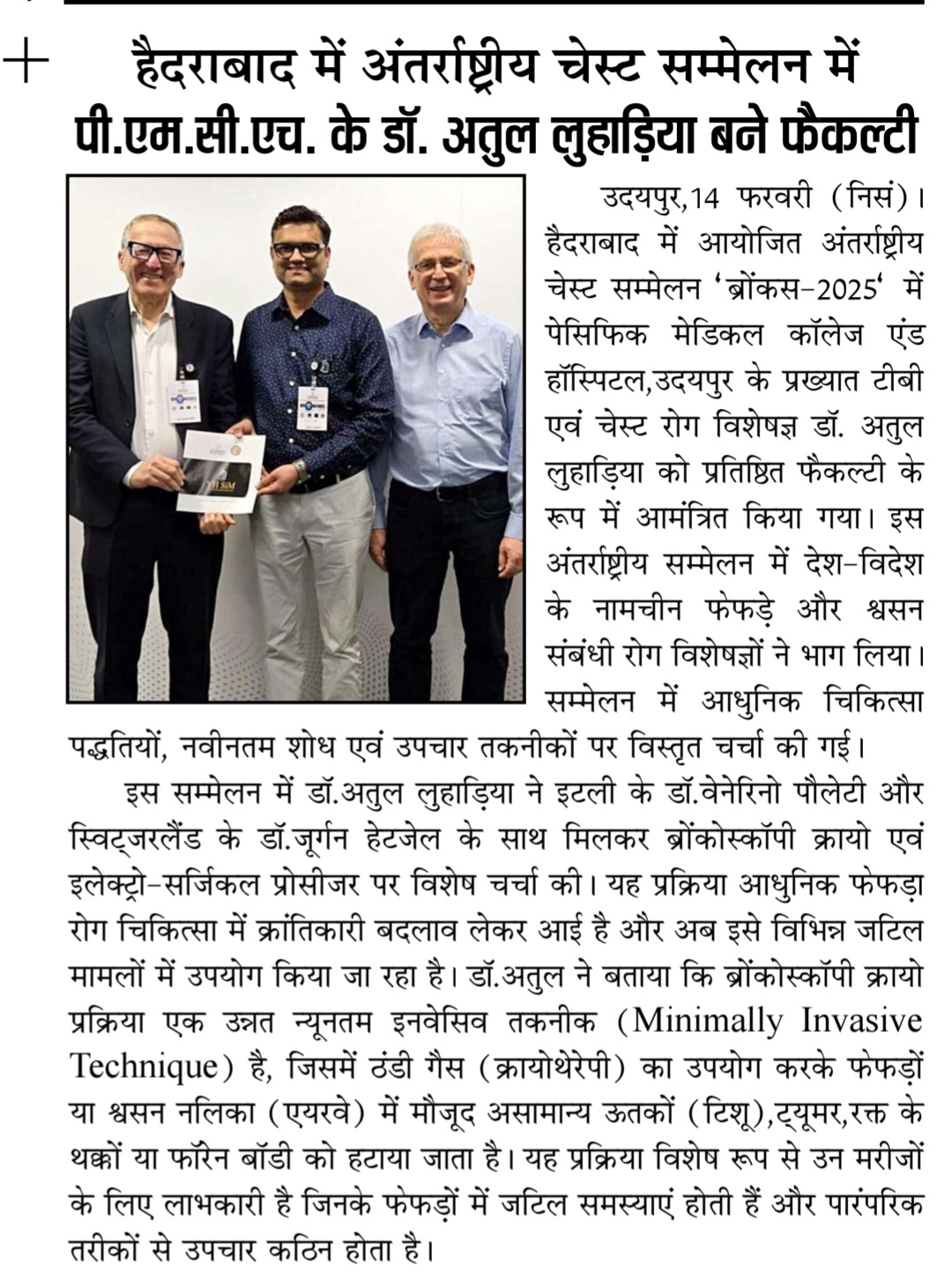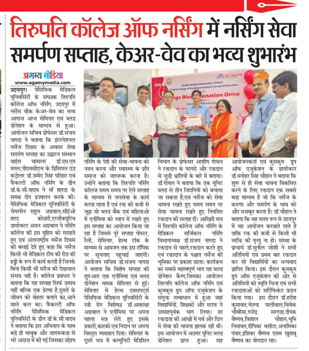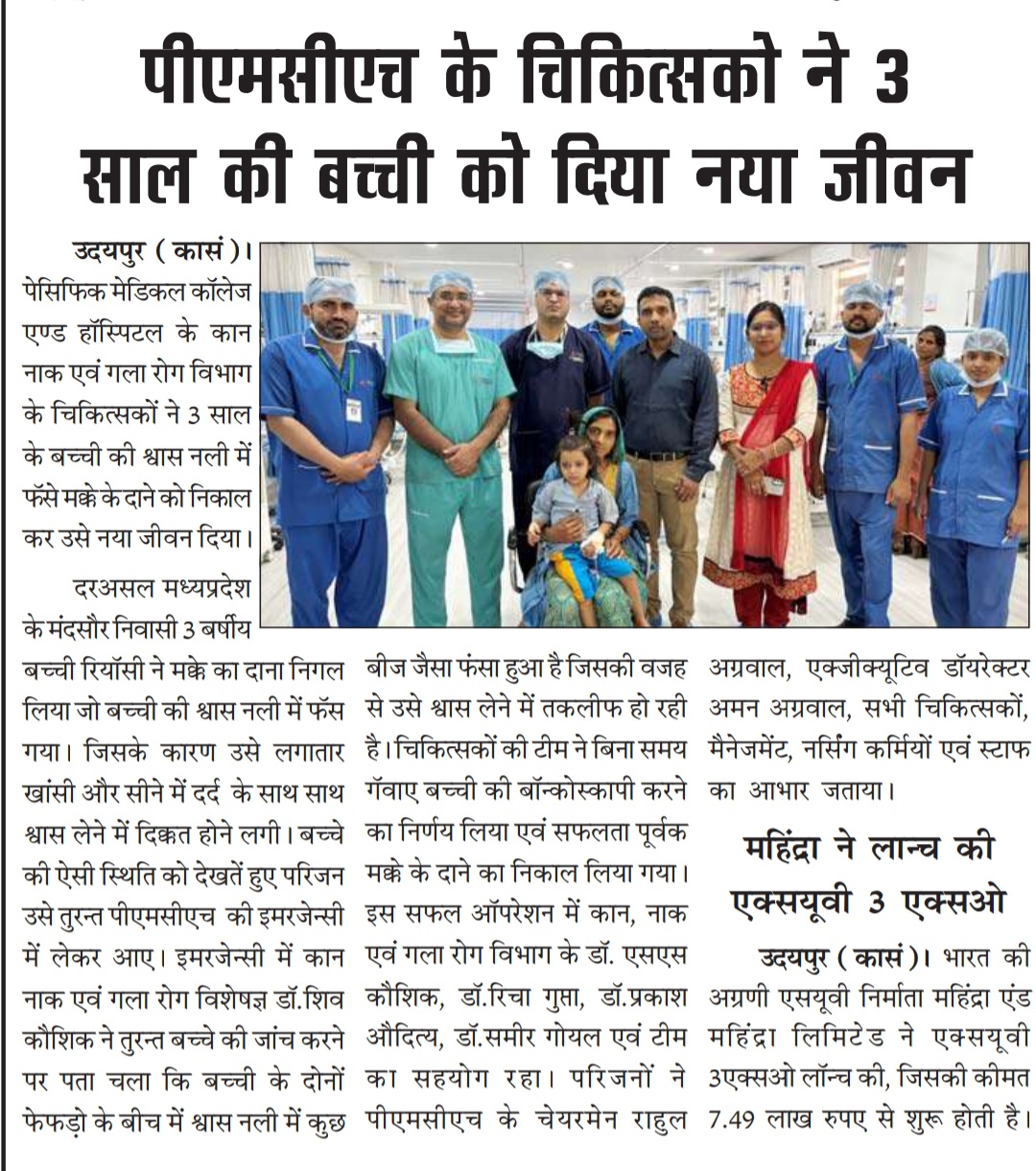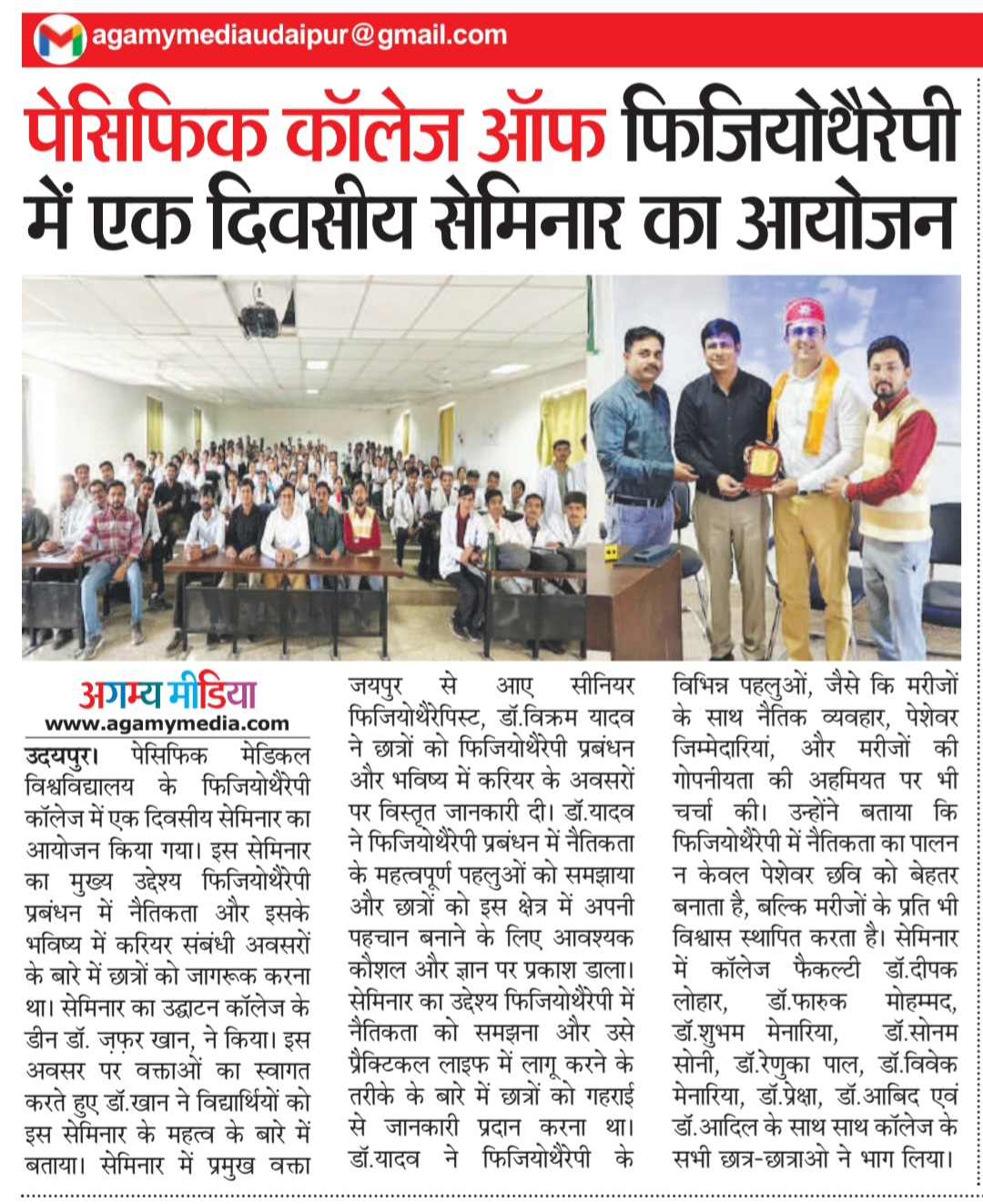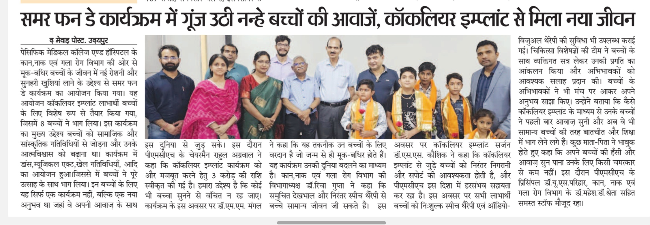 рдкреЗрд╕рд┐рдлрд┐рдХ рдореЗрдбрд┐рдХрд▓ рдХреЙрд▓реЗрдЬ рдПрдВрдб рд╣реЙрд╕реНрдкрд┐рдЯрд▓, рднреАрд▓реЛрдВ рдХрд╛ рдмреЗрджрд▓рд╛ рдПрд╡рдВ рд╢реНрд░реА рдЕрдЧреНрд░рд╡рд╛рд▓ рджрд┐рдЧрдВрдмрд░ рдЬреИрди рдкрдВрдЪрд╛рдпрдд рдХреЗ рд╕рд╛рде рд╕рдВрдпреБрдХреНрдд рд╡рд┐рд╢рд╛рд▓ рдирд┐рд╢реБрд▓реНрдХ рдЪрд┐рдХрд┐рддреНрд╕рд╛ рдкрд░рд╛рдорд░реНрд╢,рдЬрд╛рдВрдЪ рдПрд╡рдВ рднрд░реНрддреА рд╢рд┐рд╡рд┐рд░ 29 рдЬреВрди рдХреЛ рд╢реНрд░реА 1008 рд╕реБрдорддрд┐ рдирд╛рде рдЕрдЧреНрд░рд╡рд╛рд▓ рджрд┐рдЧрдВрдмрд░ рдЬреИрди рдордВрджрд┐рд░ (рдЬреИрди рдмреЛрд░реНрдбрд┐рдЧ) рдзрд╛рдирдордВрдбреА рдЙрджрдпрдкреБрд░ рдХрд┐рдпрд╛ рдЬрд╛рдПрдЧрд╛ред рд╢рд┐рд╡рд┐рд░ рдХреБрдВрддреБрдХреБрдорд╛рд░рдЬреА рдЧрдгрдкрддреЛрдд, рдорд╣реЗрдВрджреНрд░рдЬреА рдЯрд╛рдпрд╛ рдПрд╡рдВ рдкрд╛рд░рд╕рдЬреА рд╕рд┐рдВрдШрд╡реА рджреНрд╡рд╛рд░рд╛ рдкреНрд░рд╛рддрдГ 9.30 рдмрдЬреЗ рдХрд┐рдпрд╛ рдЬрд╛рдПрдЧрд╛ред рдкреАрдПрдорд╕реАрдПрдЪ рдХреЗ рдРрдХреНрдЬрд┐рдХреНрдпреВрдЯрд┐рд╡ рдбреЙрдпрд░реЗрдХреНрдЯрд░ рдЕрдорди рдЕрдЧреНрд░рд╡рд╛рд▓ рдиреЗ рдЙрджрдШрд╛рдЯрди рдмрддрд╛рдпрд╛ рд╢рд┐рд╡рд┐рд░ рдореЗрдВ рдирд┐рд╢реБрд▓реНрдХ рдкрд░рд╛рдорд░реНрд╢ рдПрд╡рдВ рдмреНрд▓рдб рдкреНрд░реЗрд╢рд░ рдХреА рдЬрд╛рдВрдЪ рдХреЗ рд╕рд╛рде рд╣реА рд╢реБрдЧрд░, рдХреЛрд▓реЗрд╕реНрдЯреНрд░реЙрд▓, рд▓реАрд╡рд░, рдХрд┐рдбрдиреА, рдерд╛рдпрд░рд╛рдЗрдб, рдпреВрд░рд┐рдХ рдПрд╕рд┐рдб, рд╕реАрдмреАрд╕реА, рд╕рд┐рд░рдо рдкреАрдПрд╕рдП, рдпреВрд░реАрди рдЖрджрд┐ рдХреА рдЬреЙрдЪ рдирд┐рд╢реБрд▓реНрдХ рдХрд░рд╛рдИ рдЬрд╛рдПрдЧреАред рдЪрдпрдирд┐рдд рд░реЛрдЧрд┐рдпреЛрдВ рдХреЗ рд▓рд┐рдП рдЗрдХреЛ, рдЯреАрдПрдордЯреА, рд╕реЛрдиреЛрдЧреНрд░рд╛рдлреА, рдПрдХреНрд╕рд░реЗ, рдореИрдореЛрдЧреНрд░рд╛рдлреА, рдкреИрдВрдк рд╕реНрдореАрдпрд░ рдЖрджрд┐ рдХреА рдЬрд╛рдВрдЪ рдХреА рдЬрд╛рдПрдЧреАред рд╢рд┐рд╡рд┐рд░ рдореЗрдВ рдбреЙ. рдЕрддреБрд▓ рд▓реБрд╣рд╛рдбрд╝рд┐рдпрд╛, рдбреЙ. рд╕реА.рдкреА. рдкреБрд░реЛрд╣рд┐рдд, рдбреЙ. рдЕрдиреБрд░реЛрдз рд╢рд╛рдВрдбрд┐рд▓реНрдп, рдбреЙ. рд╣рдиреБрд╡рдВрдд рд╕рд┐рдВрд╣ рд░рд╛рдареМрдбрд╝, рдбреЙ. рдирд░реЗрдВрджреНрд░ рдорд▓, рдбреЙ. рдкреБрдиреАрдд,рдбреЙ.рдзрд╡рд▓ рдбреЙ. рдордпрдВрдХ рдЖрдореЗрдЯрд╛, рдбреЙ. рд░реЛрдиреА рдмрд╛рд▓рд╛, рдбреЙ. рд░рд╛рдо рдорд╣рд╛рдЬрди, рдбреЙ. рдордиреЛрдЬ рдЪреБрдВрдбрд╛рд╡рдд, рдбреЙ. рд╕реМрд░рдн рдЧреБрдкреНрддрд╛, рдбреЙ. рд╢рд░реНрдорд╛, рдЕрднрд┐рдЬреАрдд рдХрд╛рдХреЗ, рдбреЙ. рд░рд╛рдЬрдХреБрдорд╛рд░ рд╡рд░реНрдорд╛ рд╕рд╣рд┐рдд рдЕрдиреНрдп рдореЗрдбрд┐рдХрд▓ рд╕реНрдЯреЙрдл рдХреА рдкреВрд░реА рдЯреАрдо рдЕрдкрдиреА рдЙрддреНрдХреГрд╖реНрдЯ рд╕реЗрд╡рд╛рдПрдВ рджреЗрдиреЗ рдХреЗ рд▓рд┐рдП рддрддреНрдкрд░ рд░рд╣реЗрдЧреА ред рд╢рд┐рд╡рд┐рд░ рд╕рдВрдпреЛрдЬрдХ рдорд┐рддреЗрд╢ рдПрд╡ рдЕрдЬрдп рдиреЗ рдмрддрд╛рдпрд╛ рдХрд┐ рдЪрдпрдирд┐рдд рд░реЛрдЧрд┐рдпреЛ рдХреЗ рд▓рд┐рдП рд╡рд┐рд╢реЗрд╖ рдирд┐рд╢реБрд▓реНрдХ рд╕рд░реНрдЬрд┐рдХрд▓ рд╕реЗрд╡рд╛рдУ рдХреЗ рддрд╣рдд рдореЛрддрд┐рдпрд╛рдмрд┐рдВрдж рдСрдкрд░реЗрд╢рди (рд▓реЗрдВрд╕ рд╕рд╣рд┐рдд),рд╣рд░реНрдирд┐рдпрд╛, рдЕрдкреЗрдВрдбрд┐рдХреНрд╕, рдирд╛рдХ рдХрд╛р