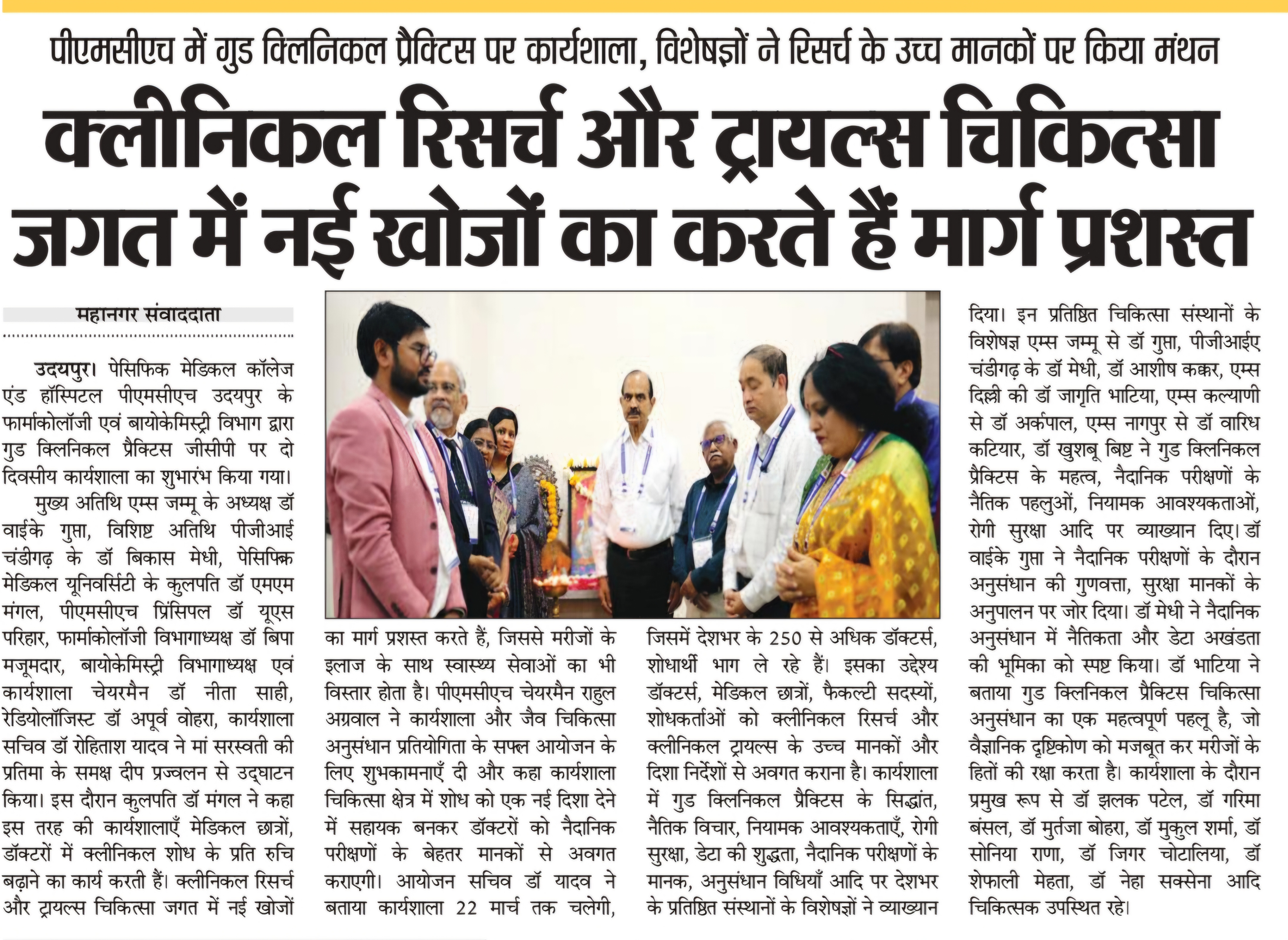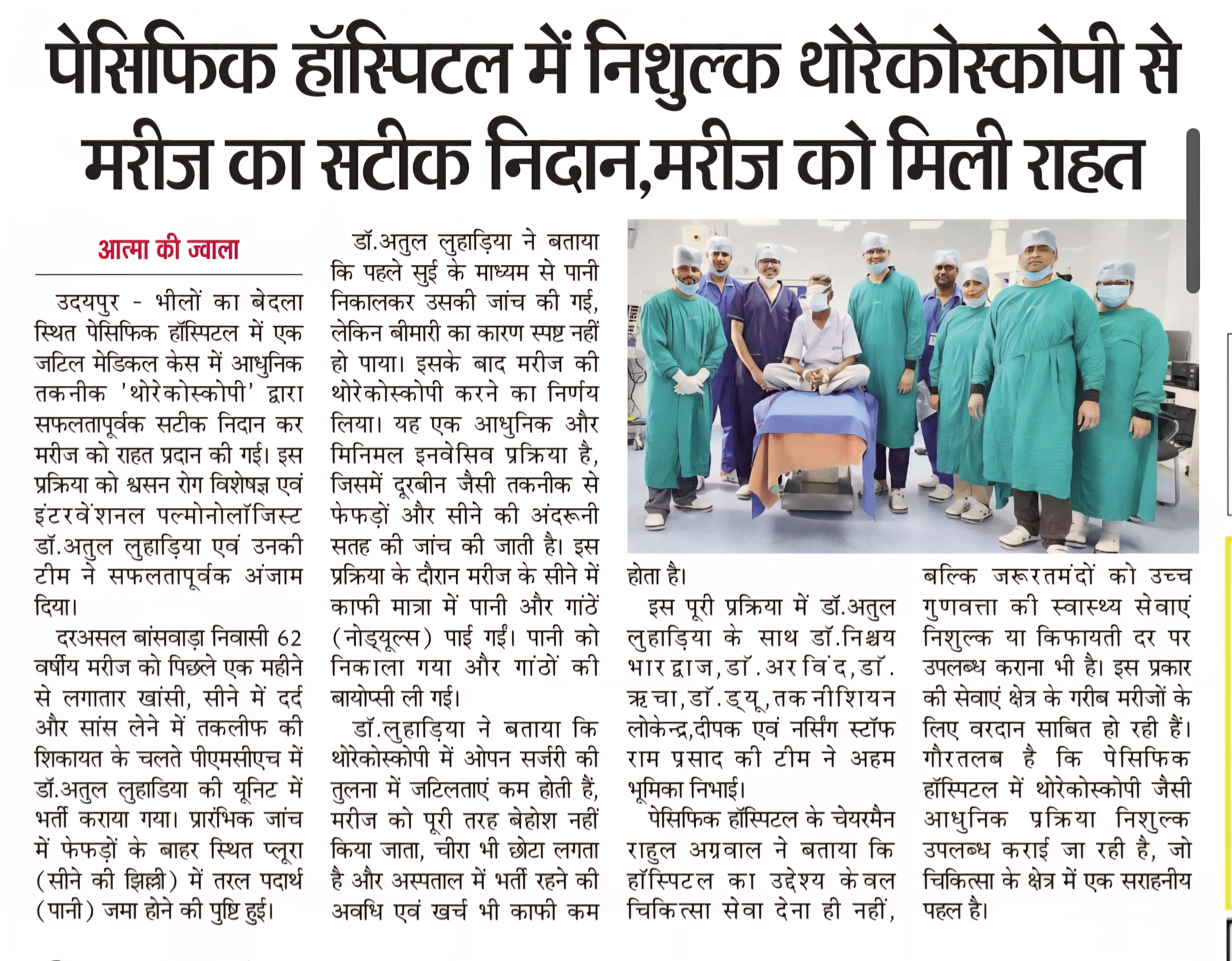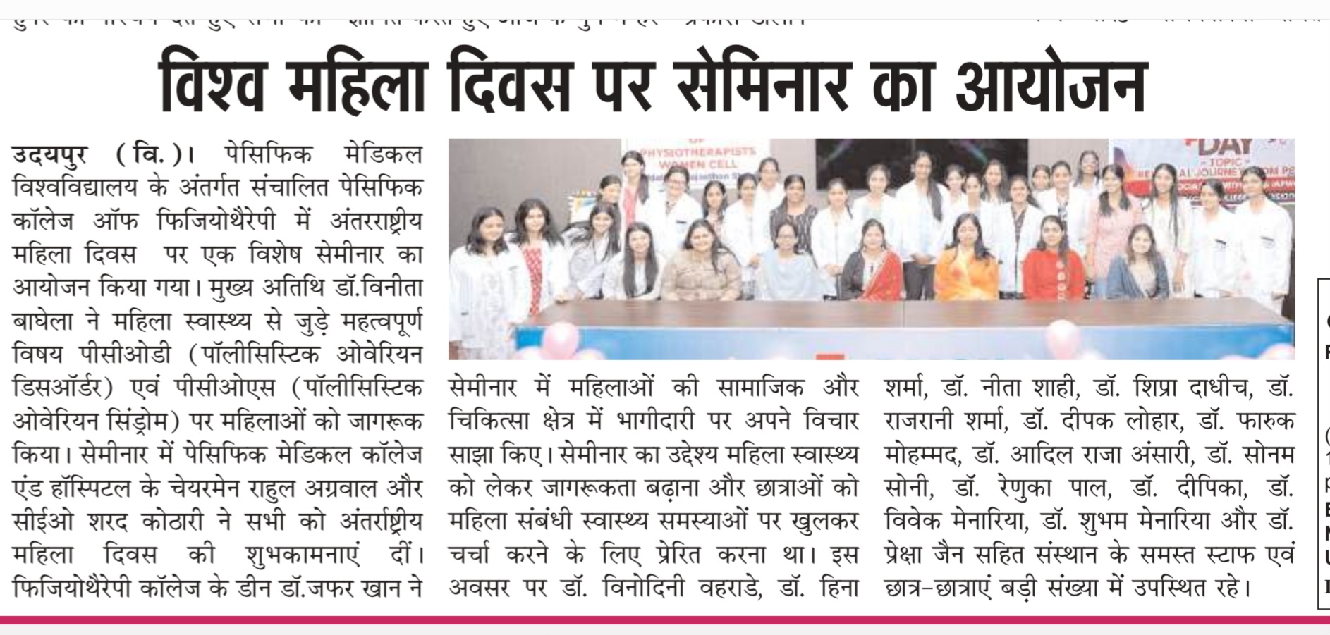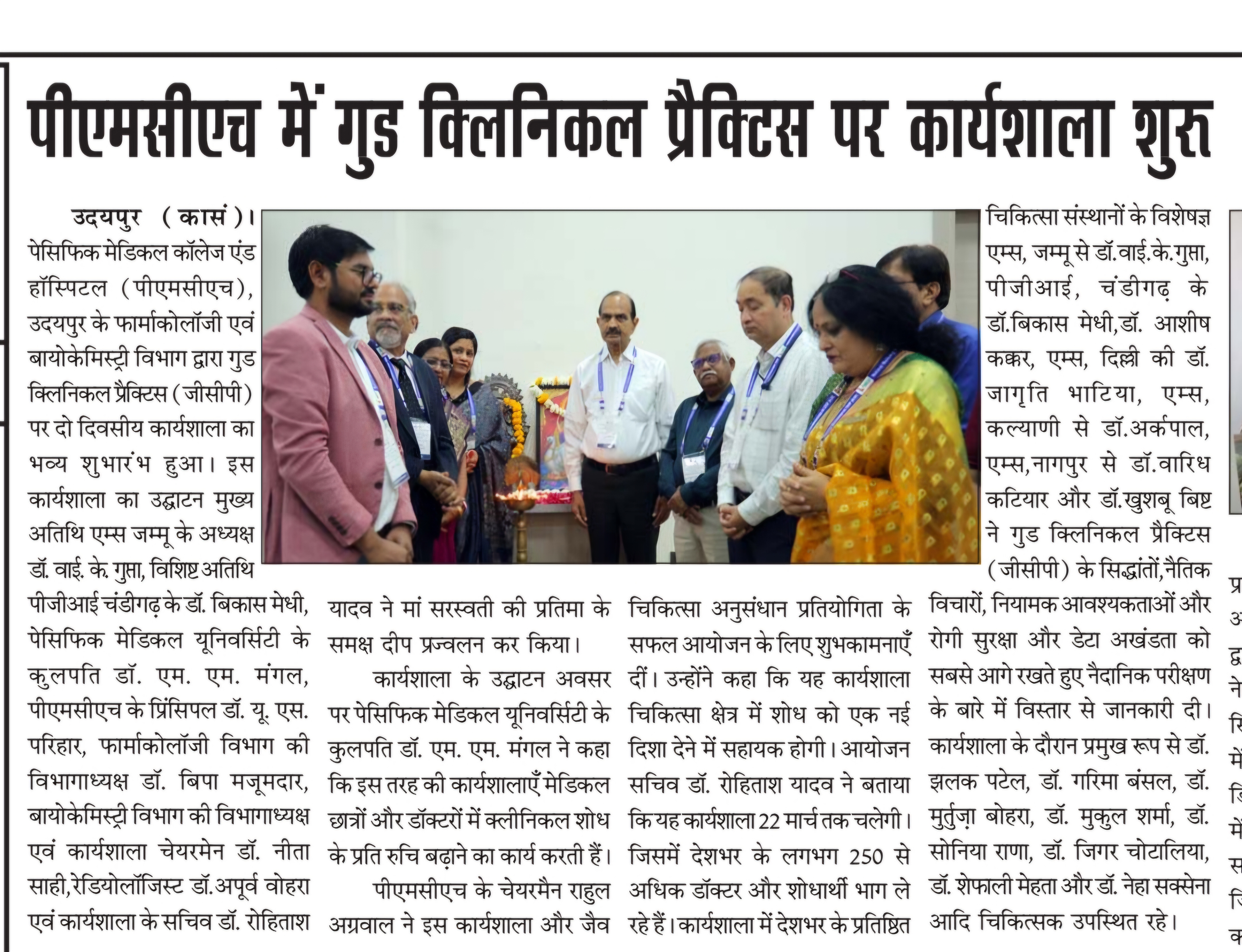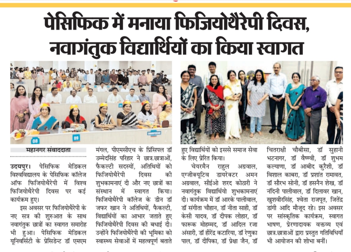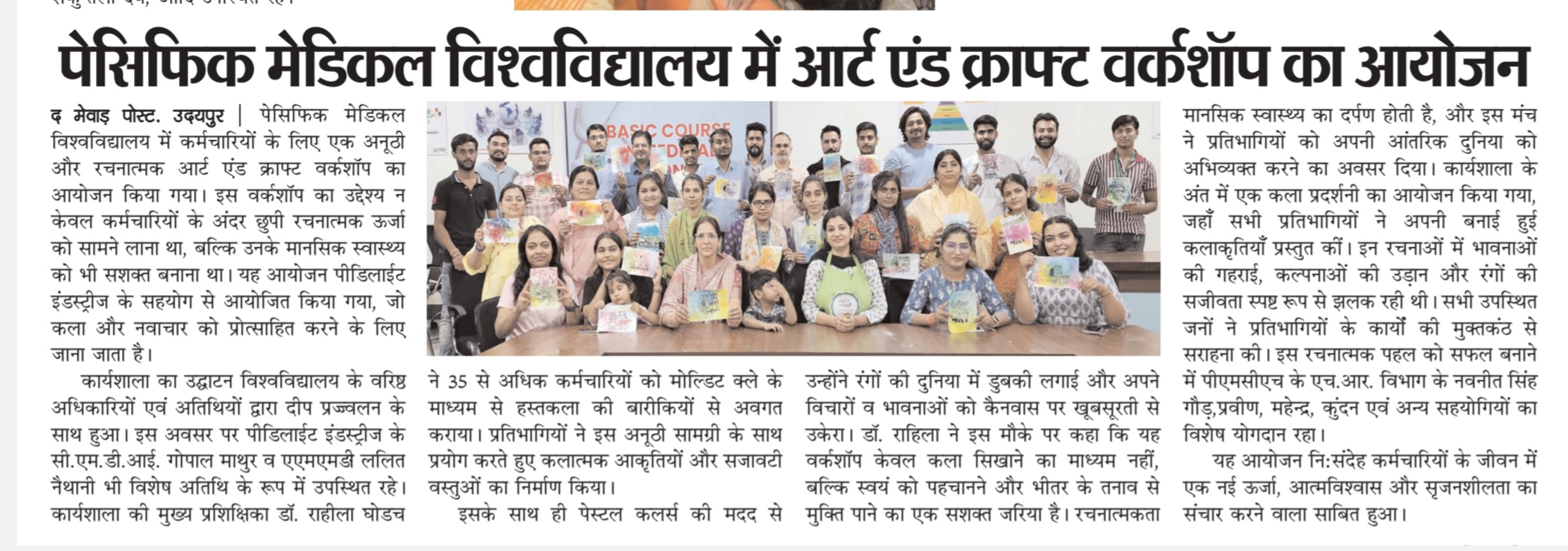 рдкреЗрд╕рд┐рдлрд┐рдХ рдореЗрдбрд┐рдХрд▓ рдХреЙрд▓реЗрдЬ рдПрдВрдб рд╣реЙрд╕реНрдкрд┐рдЯрд▓, рднреАрд▓реЛрдВ рдХрд╛ рдмреЗрджрд▓рд╛ рдПрд╡рдВ рд╢реНрд░реА рдЕрдЧреНрд░рд╡рд╛рд▓ рджрд┐рдЧрдВрдмрд░ рдЬреИрди рдкрдВрдЪрд╛рдпрдд рдХреЗ рд╕рд╛рде рд╕рдВрдпреБрдХреНрдд рд╡рд┐рд╢рд╛рд▓ рдирд┐рд╢реБрд▓реНрдХ рдЪрд┐рдХрд┐рддреНрд╕рд╛ рдкрд░рд╛рдорд░реНрд╢,рдЬрд╛рдВрдЪ рдПрд╡рдВ рднрд░реНрддреА рд╢рд┐рд╡рд┐рд░ 29 рдЬреВрди рдХреЛ рд╢реНрд░реА 1008 рд╕реБрдорддрд┐ рдирд╛рде рдЕрдЧреНрд░рд╡рд╛рд▓ рджрд┐рдЧрдВрдмрд░ рдЬреИрди рдордВрджрд┐рд░ (рдЬреИрди рдмреЛрд░реНрдбрд┐рдЧ) рдзрд╛рдирдордВрдбреА рдЙрджрдпрдкреБрд░ рдХрд┐рдпрд╛ рдЬрд╛рдПрдЧрд╛ред рд╢рд┐рд╡рд┐рд░ рдХреБрдВрддреБрдХреБрдорд╛рд░рдЬреА рдЧрдгрдкрддреЛрдд, рдорд╣реЗрдВрджреНрд░рдЬреА рдЯрд╛рдпрд╛ рдПрд╡рдВ рдкрд╛рд░рд╕рдЬреА рд╕рд┐рдВрдШрд╡реА рджреНрд╡рд╛рд░рд╛ рдкреНрд░рд╛рддрдГ 9.30 рдмрдЬреЗ рдХрд┐рдпрд╛ рдЬрд╛рдПрдЧрд╛ред рдкреАрдПрдорд╕реАрдПрдЪ рдХреЗ рдРрдХреНрдЬрд┐рдХреНрдпреВрдЯрд┐рд╡ рдбреЙрдпрд░реЗрдХреНрдЯрд░ рдЕрдорди рдЕрдЧреНрд░рд╡рд╛рд▓ рдиреЗ рдЙрджрдШрд╛рдЯрди рдмрддрд╛рдпрд╛ рд╢рд┐рд╡рд┐рд░ рдореЗрдВ рдирд┐рд╢реБрд▓реНрдХ рдкрд░рд╛рдорд░реНрд╢ рдПрд╡рдВ рдмреНрд▓рдб рдкреНрд░реЗрд╢рд░ рдХреА рдЬрд╛рдВрдЪ рдХреЗ рд╕рд╛рде рд╣реА рд╢реБрдЧрд░, рдХреЛрд▓реЗрд╕реНрдЯреНрд░реЙрд▓, рд▓реАрд╡рд░, рдХрд┐рдбрдиреА, рдерд╛рдпрд░рд╛рдЗрдб, рдпреВрд░рд┐рдХ рдПрд╕рд┐рдб, рд╕реАрдмреАрд╕реА, рд╕рд┐рд░рдо рдкреАрдПрд╕рдП, рдпреВрд░реАрди рдЖрджрд┐ рдХреА рдЬреЙрдЪ рдирд┐рд╢реБрд▓реНрдХ рдХрд░рд╛рдИ рдЬрд╛рдПрдЧреАред рдЪрдпрдирд┐рдд рд░реЛрдЧрд┐рдпреЛрдВ рдХреЗ рд▓рд┐рдП рдЗрдХреЛ, рдЯреАрдПрдордЯреА, рд╕реЛрдиреЛрдЧреНрд░рд╛рдлреА, рдПрдХреНрд╕рд░реЗ, рдореИрдореЛрдЧреНрд░рд╛рдлреА, рдкреИрдВрдк рд╕реНрдореАрдпрд░ рдЖрджрд┐ рдХреА рдЬрд╛рдВрдЪ рдХреА рдЬрд╛рдПрдЧреАред рд╢рд┐рд╡рд┐рд░ рдореЗрдВ рдбреЙ. рдЕрддреБрд▓ рд▓реБрд╣рд╛рдбрд╝рд┐рдпрд╛, рдбреЙ. рд╕реА.рдкреА. рдкреБрд░реЛрд╣рд┐рдд, рдбреЙ. рдЕрдиреБрд░реЛрдз рд╢рд╛рдВрдбрд┐рд▓реНрдп, рдбреЙ. рд╣рдиреБрд╡рдВрдд рд╕рд┐рдВрд╣ рд░рд╛рдареМрдбрд╝, рдбреЙ. рдирд░реЗрдВрджреНрд░ рдорд▓, рдбреЙ. рдкреБрдиреАрдд,рдбреЙ.рдзрд╡рд▓ рдбреЙ. рдордпрдВрдХ рдЖрдореЗрдЯрд╛, рдбреЙ. рд░реЛрдиреА рдмрд╛рд▓рд╛, рдбреЙ. рд░рд╛рдо рдорд╣рд╛рдЬрди, рдбреЙ. рдордиреЛрдЬ рдЪреБрдВрдбрд╛рд╡рдд, рдбреЙ. рд╕реМрд░рдн рдЧреБрдкреНрддрд╛, рдбреЙ. рд╢рд░реНрдорд╛, рдЕрднрд┐рдЬреАрдд рдХрд╛рдХреЗ, рдбреЙ. рд░рд╛рдЬрдХреБрдорд╛рд░ рд╡рд░реНрдорд╛ рд╕рд╣рд┐рдд рдЕрдиреНрдп рдореЗрдбрд┐рдХрд▓ рд╕реНрдЯреЙрдл рдХреА рдкреВрд░реА рдЯреАрдо рдЕрдкрдиреА рдЙрддреНрдХреГрд╖реНрдЯ рд╕реЗрд╡рд╛рдПрдВ рджреЗрдиреЗ рдХреЗ рд▓рд┐рдП рддрддреНрдкрд░ рд░рд╣реЗрдЧреА ред рд╢рд┐рд╡рд┐рд░ рд╕рдВрдпреЛрдЬрдХ рдорд┐рддреЗрд╢ рдПрд╡ рдЕрдЬрдп рдиреЗ рдмрддрд╛рдпрд╛ рдХрд┐ рдЪрдпрдирд┐рдд рд░реЛрдЧрд┐рдпреЛ рдХреЗ рд▓рд┐рдП рд╡рд┐рд╢реЗрд╖ рдирд┐рд╢реБрд▓реНрдХ рд╕рд░реНрдЬрд┐рдХрд▓ рд╕реЗрд╡рд╛рдУ рдХреЗ рддрд╣рдд рдореЛрддрд┐рдпрд╛рдмрд┐рдВрдж рдСрдкрд░реЗрд╢рди (рд▓реЗрдВрд╕ рд╕рд╣рд┐рдд),рд╣рд░реНрдирд┐рдпрд╛, рдЕрдкреЗрдВрдбрд┐рдХреНрд╕, рдирд╛рдХ рдХрд╛р