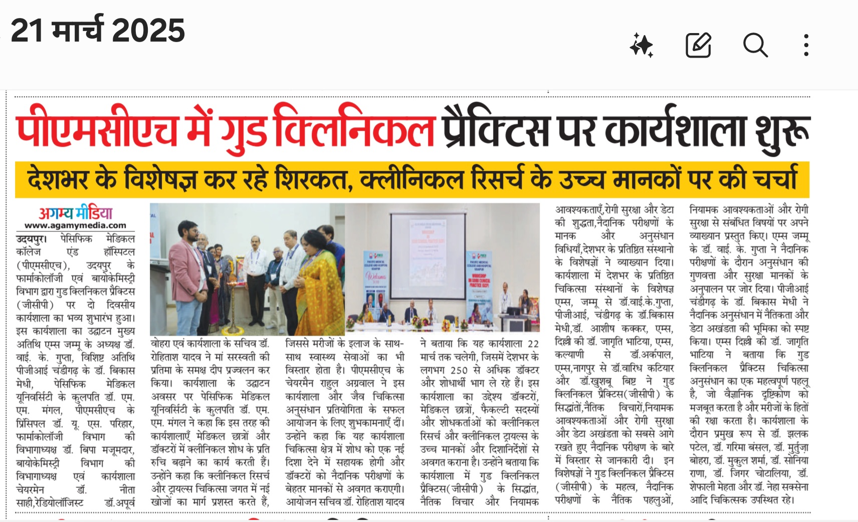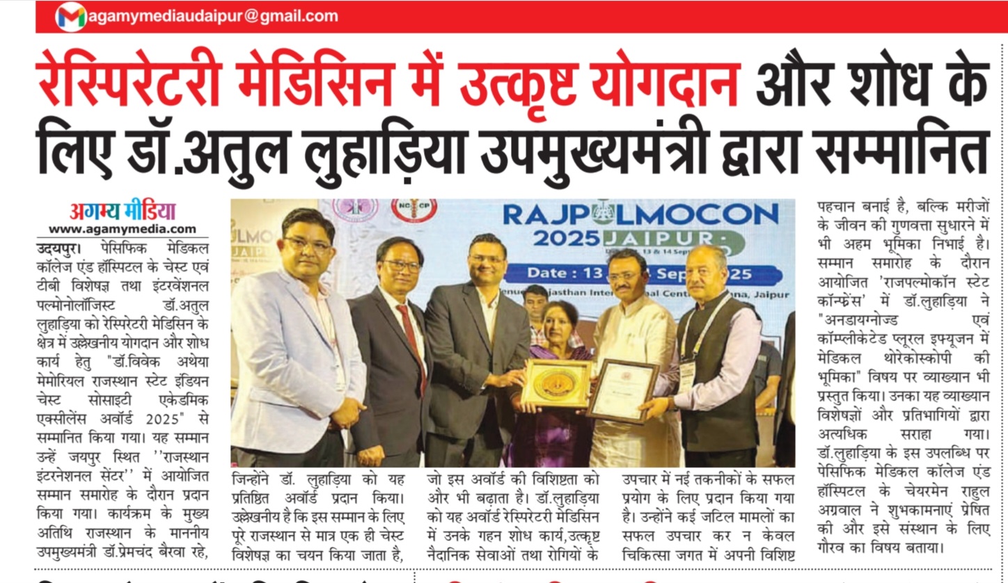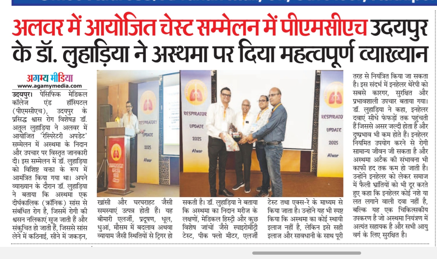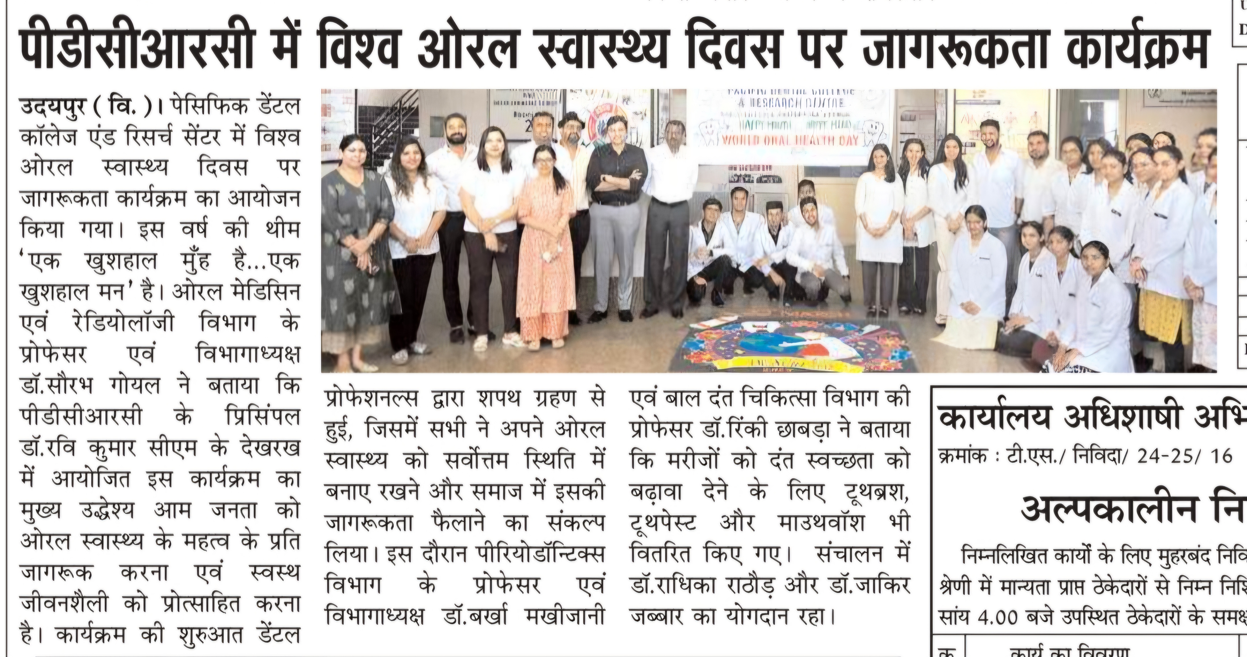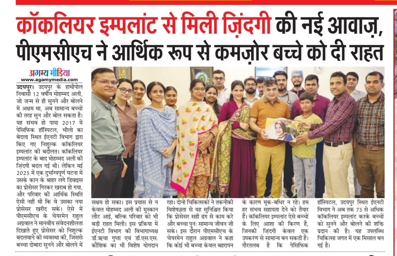 рдкреЗрд╕рд┐рдлрд┐рдХ рдореЗрдбрд┐рдХрд▓ рдХреЙрд▓реЗрдЬ рдПрдВрдб рд╣реЙрд╕реНрдкрд┐рдЯрд▓, рднреАрд▓реЛрдВ рдХрд╛ рдмреЗрджрд▓рд╛ рдПрд╡рдВ рд╢реНрд░реА рдЕрдЧреНрд░рд╡рд╛рд▓ рджрд┐рдЧрдВрдмрд░ рдЬреИрди рдкрдВрдЪрд╛рдпрдд рдХреЗ рд╕рд╛рде рд╕рдВрдпреБрдХреНрдд рд╡рд┐рд╢рд╛рд▓ рдирд┐рд╢реБрд▓реНрдХ рдЪрд┐рдХрд┐рддреНрд╕рд╛ рдкрд░рд╛рдорд░реНрд╢,рдЬрд╛рдВрдЪ рдПрд╡рдВ рднрд░реНрддреА рд╢рд┐рд╡рд┐рд░ 29 рдЬреВрди рдХреЛ рд╢реНрд░реА 1008 рд╕реБрдорддрд┐ рдирд╛рде рдЕрдЧреНрд░рд╡рд╛рд▓ рджрд┐рдЧрдВрдмрд░ рдЬреИрди рдордВрджрд┐рд░ (рдЬреИрди рдмреЛрд░реНрдбрд┐рдЧ) рдзрд╛рдирдордВрдбреА рдЙрджрдпрдкреБрд░ рдХрд┐рдпрд╛ рдЬрд╛рдПрдЧрд╛ред рд╢рд┐рд╡рд┐рд░ рдХреБрдВрддреБрдХреБрдорд╛рд░рдЬреА рдЧрдгрдкрддреЛрдд, рдорд╣реЗрдВрджреНрд░рдЬреА рдЯрд╛рдпрд╛ рдПрд╡рдВ рдкрд╛рд░рд╕рдЬреА рд╕рд┐рдВрдШрд╡реА рджреНрд╡рд╛рд░рд╛ рдкреНрд░рд╛рддрдГ 9.30 рдмрдЬреЗ рдХрд┐рдпрд╛ рдЬрд╛рдПрдЧрд╛ред рдкреАрдПрдорд╕реАрдПрдЪ рдХреЗ рдРрдХреНрдЬрд┐рдХреНрдпреВрдЯрд┐рд╡ рдбреЙрдпрд░реЗрдХреНрдЯрд░ рдЕрдорди рдЕрдЧреНрд░рд╡рд╛рд▓ рдиреЗ рдЙрджрдШрд╛рдЯрди рдмрддрд╛рдпрд╛ рд╢рд┐рд╡рд┐рд░ рдореЗрдВ рдирд┐рд╢реБрд▓реНрдХ рдкрд░рд╛рдорд░реНрд╢ рдПрд╡рдВ рдмреНрд▓рдб рдкреНрд░реЗрд╢рд░ рдХреА рдЬрд╛рдВрдЪ рдХреЗ рд╕рд╛рде рд╣реА рд╢реБрдЧрд░, рдХреЛрд▓реЗрд╕реНрдЯреНрд░реЙрд▓, рд▓реАрд╡рд░, рдХрд┐рдбрдиреА, рдерд╛рдпрд░рд╛рдЗрдб, рдпреВрд░рд┐рдХ рдПрд╕рд┐рдб, рд╕реАрдмреАрд╕реА, рд╕рд┐рд░рдо рдкреАрдПрд╕рдП, рдпреВрд░реАрди рдЖрджрд┐ рдХреА рдЬреЙрдЪ рдирд┐рд╢реБрд▓реНрдХ рдХрд░рд╛рдИ рдЬрд╛рдПрдЧреАред рдЪрдпрдирд┐рдд рд░реЛрдЧрд┐рдпреЛрдВ рдХреЗ рд▓рд┐рдП рдЗрдХреЛ, рдЯреАрдПрдордЯреА, рд╕реЛрдиреЛрдЧреНрд░рд╛рдлреА, рдПрдХреНрд╕рд░реЗ, рдореИрдореЛрдЧреНрд░рд╛рдлреА, рдкреИрдВрдк рд╕реНрдореАрдпрд░ рдЖрджрд┐ рдХреА рдЬрд╛рдВрдЪ рдХреА рдЬрд╛рдПрдЧреАред рд╢рд┐рд╡рд┐рд░ рдореЗрдВ рдбреЙ. рдЕрддреБрд▓ рд▓реБрд╣рд╛рдбрд╝рд┐рдпрд╛, рдбреЙ. рд╕реА.рдкреА. рдкреБрд░реЛрд╣рд┐рдд, рдбреЙ. рдЕрдиреБрд░реЛрдз рд╢рд╛рдВрдбрд┐рд▓реНрдп, рдбреЙ. рд╣рдиреБрд╡рдВрдд рд╕рд┐рдВрд╣ рд░рд╛рдареМрдбрд╝, рдбреЙ. рдирд░реЗрдВрджреНрд░ рдорд▓, рдбреЙ. рдкреБрдиреАрдд,рдбреЙ.рдзрд╡рд▓ рдбреЙ. рдордпрдВрдХ рдЖрдореЗрдЯрд╛, рдбреЙ. рд░реЛрдиреА рдмрд╛рд▓рд╛, рдбреЙ. рд░рд╛рдо рдорд╣рд╛рдЬрди, рдбреЙ. рдордиреЛрдЬ рдЪреБрдВрдбрд╛рд╡рдд, рдбреЙ. рд╕реМрд░рдн рдЧреБрдкреНрддрд╛, рдбреЙ. рд╢рд░реНрдорд╛, рдЕрднрд┐рдЬреАрдд рдХрд╛рдХреЗ, рдбреЙ. рд░рд╛рдЬрдХреБрдорд╛рд░ рд╡рд░реНрдорд╛ рд╕рд╣рд┐рдд рдЕрдиреНрдп рдореЗрдбрд┐рдХрд▓ рд╕реНрдЯреЙрдл рдХреА рдкреВрд░реА рдЯреАрдо рдЕрдкрдиреА рдЙрддреНрдХреГрд╖реНрдЯ рд╕реЗрд╡рд╛рдПрдВ рджреЗрдиреЗ рдХреЗ рд▓рд┐рдП рддрддреНрдкрд░ рд░рд╣реЗрдЧреА ред рд╢рд┐рд╡рд┐рд░ рд╕рдВрдпреЛрдЬрдХ рдорд┐рддреЗрд╢ рдПрд╡ рдЕрдЬрдп рдиреЗ рдмрддрд╛рдпрд╛ рдХрд┐ рдЪрдпрдирд┐рдд рд░реЛрдЧрд┐рдпреЛ рдХреЗ рд▓рд┐рдП рд╡рд┐рд╢реЗрд╖ рдирд┐рд╢реБрд▓реНрдХ рд╕рд░реНрдЬрд┐рдХрд▓ рд╕реЗрд╡рд╛рдУ рдХреЗ рддрд╣рдд рдореЛрддрд┐рдпрд╛рдмрд┐рдВрдж рдСрдкрд░реЗрд╢рди (рд▓реЗрдВрд╕ рд╕рд╣рд┐рдд),рд╣рд░реНрдирд┐рдпрд╛, рдЕрдкреЗрдВрдбрд┐рдХреНрд╕, рдирд╛рдХ рдХрд╛р