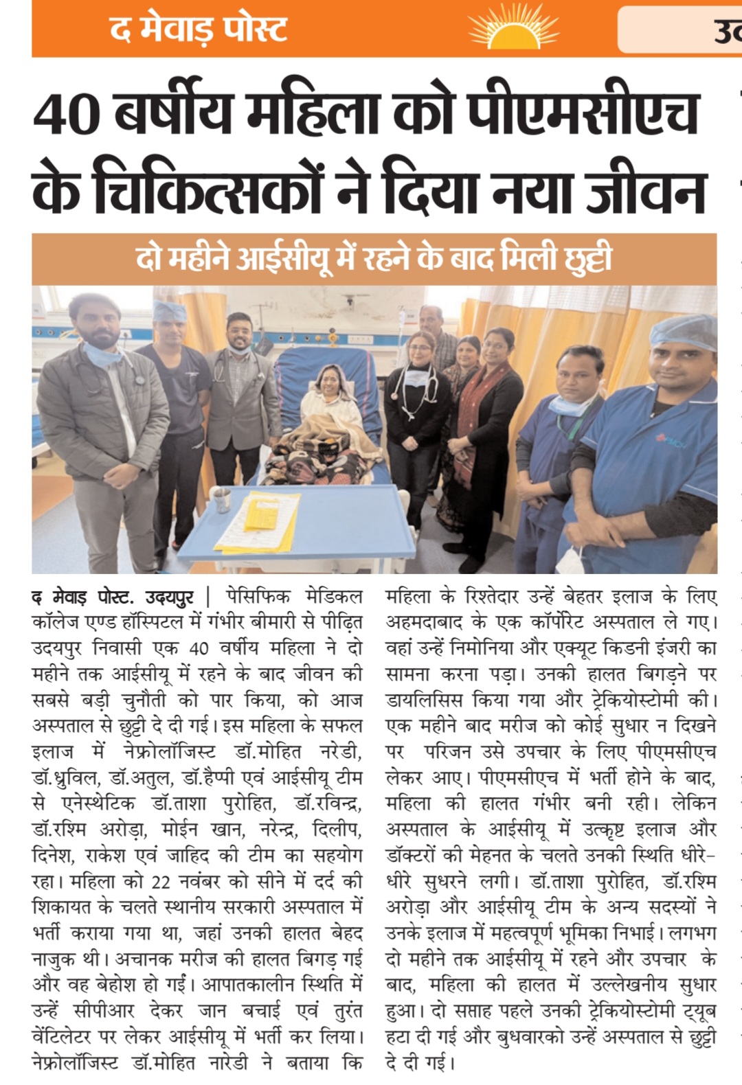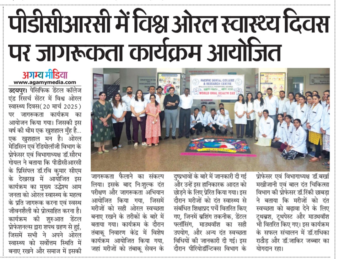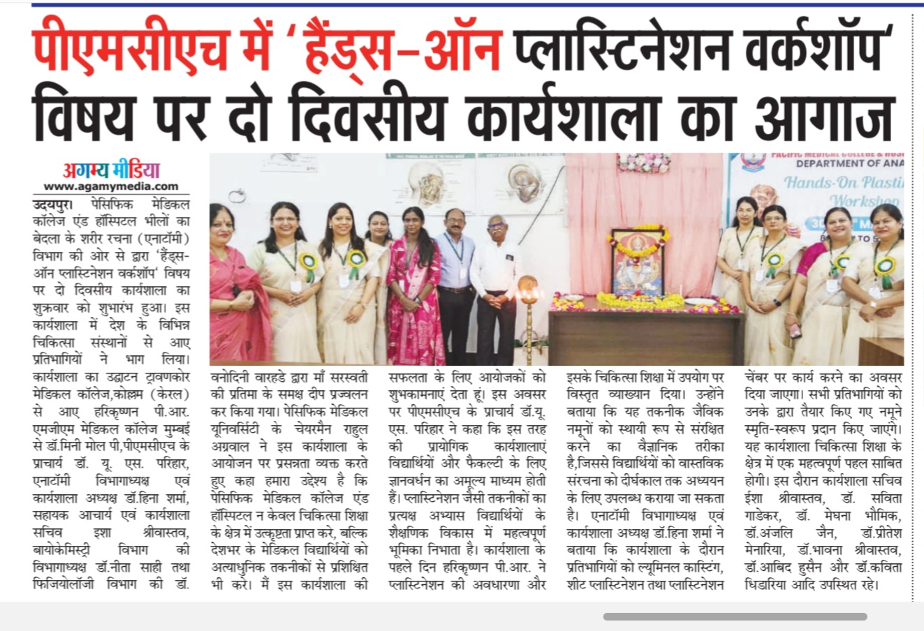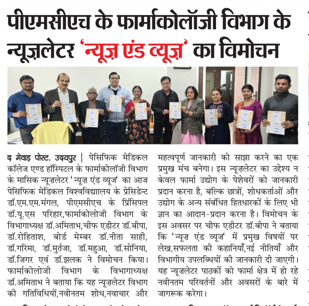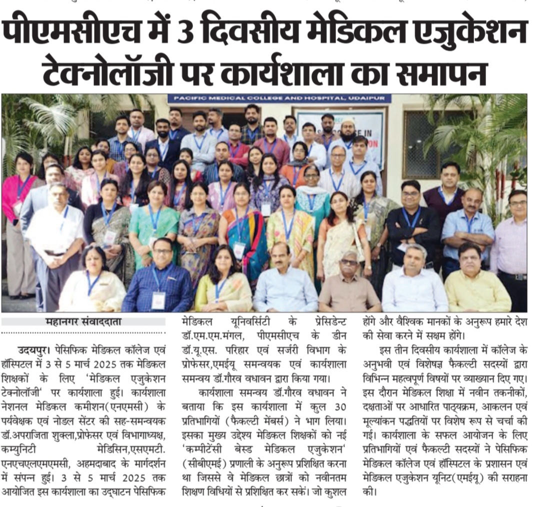 рдкреЗрд╕рд┐рдлрд┐рдХ рдореЗрдбрд┐рдХрд▓ рдХреЙрд▓реЗрдЬ рдПрдВрдб рд╣реЙрд╕реНрдкрд┐рдЯрд▓, рднреАрд▓реЛрдВ рдХрд╛ рдмреЗрджрд▓рд╛ рдПрд╡рдВ рд╢реНрд░реА рдЕрдЧреНрд░рд╡рд╛рд▓ рджрд┐рдЧрдВрдмрд░ рдЬреИрди рдкрдВрдЪрд╛рдпрдд рдХреЗ рд╕рд╛рде рд╕рдВрдпреБрдХреНрдд рд╡рд┐рд╢рд╛рд▓ рдирд┐рд╢реБрд▓реНрдХ рдЪрд┐рдХрд┐рддреНрд╕рд╛ рдкрд░рд╛рдорд░реНрд╢,рдЬрд╛рдВрдЪ рдПрд╡рдВ рднрд░реНрддреА рд╢рд┐рд╡рд┐рд░ 29 рдЬреВрди рдХреЛ рд╢реНрд░реА 1008 рд╕реБрдорддрд┐ рдирд╛рде рдЕрдЧреНрд░рд╡рд╛рд▓ рджрд┐рдЧрдВрдмрд░ рдЬреИрди рдордВрджрд┐рд░ (рдЬреИрди рдмреЛрд░реНрдбрд┐рдЧ) рдзрд╛рдирдордВрдбреА рдЙрджрдпрдкреБрд░ рдХрд┐рдпрд╛ рдЬрд╛рдПрдЧрд╛ред рд╢рд┐рд╡рд┐рд░ рдХреБрдВрддреБрдХреБрдорд╛рд░рдЬреА рдЧрдгрдкрддреЛрдд, рдорд╣реЗрдВрджреНрд░рдЬреА рдЯрд╛рдпрд╛ рдПрд╡рдВ рдкрд╛рд░рд╕рдЬреА рд╕рд┐рдВрдШрд╡реА рджреНрд╡рд╛рд░рд╛ рдкреНрд░рд╛рддрдГ 9.30 рдмрдЬреЗ рдХрд┐рдпрд╛ рдЬрд╛рдПрдЧрд╛ред рдкреАрдПрдорд╕реАрдПрдЪ рдХреЗ рдРрдХреНрдЬрд┐рдХреНрдпреВрдЯрд┐рд╡ рдбреЙрдпрд░реЗрдХреНрдЯрд░ рдЕрдорди рдЕрдЧреНрд░рд╡рд╛рд▓ рдиреЗ рдЙрджрдШрд╛рдЯрди рдмрддрд╛рдпрд╛ рд╢рд┐рд╡рд┐рд░ рдореЗрдВ рдирд┐рд╢реБрд▓реНрдХ рдкрд░рд╛рдорд░реНрд╢ рдПрд╡рдВ рдмреНрд▓рдб рдкреНрд░реЗрд╢рд░ рдХреА рдЬрд╛рдВрдЪ рдХреЗ рд╕рд╛рде рд╣реА рд╢реБрдЧрд░, рдХреЛрд▓реЗрд╕реНрдЯреНрд░реЙрд▓, рд▓реАрд╡рд░, рдХрд┐рдбрдиреА, рдерд╛рдпрд░рд╛рдЗрдб, рдпреВрд░рд┐рдХ рдПрд╕рд┐рдб, рд╕реАрдмреАрд╕реА, рд╕рд┐рд░рдо рдкреАрдПрд╕рдП, рдпреВрд░реАрди рдЖрджрд┐ рдХреА рдЬреЙрдЪ рдирд┐рд╢реБрд▓реНрдХ рдХрд░рд╛рдИ рдЬрд╛рдПрдЧреАред рдЪрдпрдирд┐рдд рд░реЛрдЧрд┐рдпреЛрдВ рдХреЗ рд▓рд┐рдП рдЗрдХреЛ, рдЯреАрдПрдордЯреА, рд╕реЛрдиреЛрдЧреНрд░рд╛рдлреА, рдПрдХреНрд╕рд░реЗ, рдореИрдореЛрдЧреНрд░рд╛рдлреА, рдкреИрдВрдк рд╕реНрдореАрдпрд░ рдЖрджрд┐ рдХреА рдЬрд╛рдВрдЪ рдХреА рдЬрд╛рдПрдЧреАред рд╢рд┐рд╡рд┐рд░ рдореЗрдВ рдбреЙ. рдЕрддреБрд▓ рд▓реБрд╣рд╛рдбрд╝рд┐рдпрд╛, рдбреЙ. рд╕реА.рдкреА. рдкреБрд░реЛрд╣рд┐рдд, рдбреЙ. рдЕрдиреБрд░реЛрдз рд╢рд╛рдВрдбрд┐рд▓реНрдп, рдбреЙ. рд╣рдиреБрд╡рдВрдд рд╕рд┐рдВрд╣ рд░рд╛рдареМрдбрд╝, рдбреЙ. рдирд░реЗрдВрджреНрд░ рдорд▓, рдбреЙ. рдкреБрдиреАрдд,рдбреЙ.рдзрд╡рд▓ рдбреЙ. рдордпрдВрдХ рдЖрдореЗрдЯрд╛, рдбреЙ. рд░реЛрдиреА рдмрд╛рд▓рд╛, рдбреЙ. рд░рд╛рдо рдорд╣рд╛рдЬрди, рдбреЙ. рдордиреЛрдЬ рдЪреБрдВрдбрд╛рд╡рдд, рдбреЙ. рд╕реМрд░рдн рдЧреБрдкреНрддрд╛, рдбреЙ. рд╢рд░реНрдорд╛, рдЕрднрд┐рдЬреАрдд рдХрд╛рдХреЗ, рдбреЙ. рд░рд╛рдЬрдХреБрдорд╛рд░ рд╡рд░реНрдорд╛ рд╕рд╣рд┐рдд рдЕрдиреНрдп рдореЗрдбрд┐рдХрд▓ рд╕реНрдЯреЙрдл рдХреА рдкреВрд░реА рдЯреАрдо рдЕрдкрдиреА рдЙрддреНрдХреГрд╖реНрдЯ рд╕реЗрд╡рд╛рдПрдВ рджреЗрдиреЗ рдХреЗ рд▓рд┐рдП рддрддреНрдкрд░ рд░рд╣реЗрдЧреА ред рд╢рд┐рд╡рд┐рд░ рд╕рдВрдпреЛрдЬрдХ рдорд┐рддреЗрд╢ рдПрд╡ рдЕрдЬрдп рдиреЗ рдмрддрд╛рдпрд╛ рдХрд┐ рдЪрдпрдирд┐рдд рд░реЛрдЧрд┐рдпреЛ рдХреЗ рд▓рд┐рдП рд╡рд┐рд╢реЗрд╖ рдирд┐рд╢реБрд▓реНрдХ рд╕рд░реНрдЬрд┐рдХрд▓ рд╕реЗрд╡рд╛рдУ рдХреЗ рддрд╣рдд рдореЛрддрд┐рдпрд╛рдмрд┐рдВрдж рдСрдкрд░реЗрд╢рди (рд▓реЗрдВрд╕ рд╕рд╣рд┐рдд),рд╣рд░реНрдирд┐рдпрд╛, рдЕрдкреЗрдВрдбрд┐рдХреНрд╕, рдирд╛рдХ рдХрд╛р