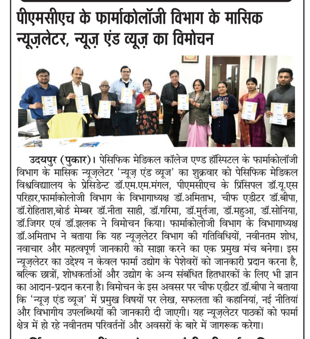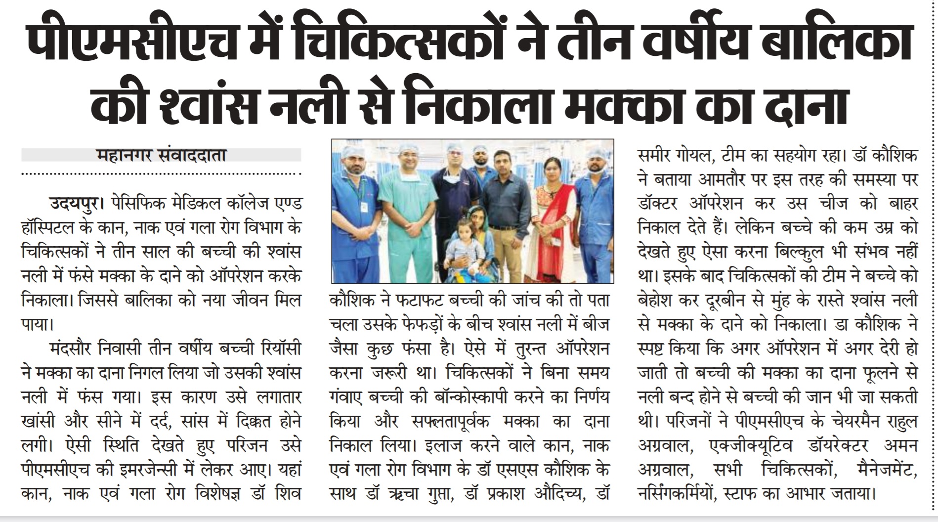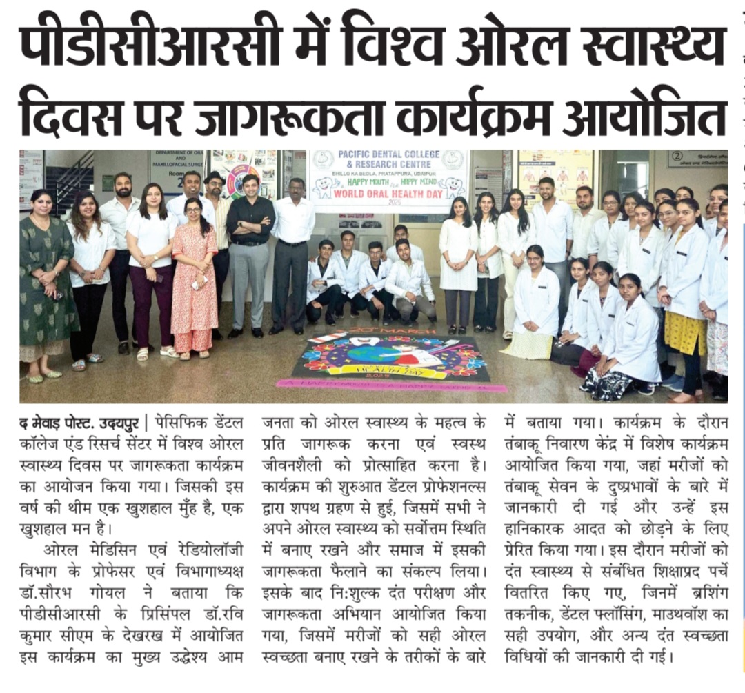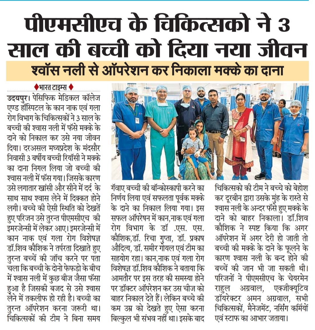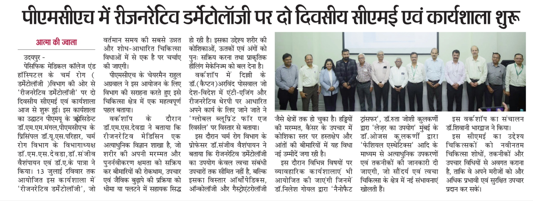 рдкреЗрд╕рд┐рдлрд┐рдХ рдореЗрдбрд┐рдХрд▓ рдХреЙрд▓реЗрдЬ рдПрдВрдб рд╣реЙрд╕реНрдкрд┐рдЯрд▓, рднреАрд▓реЛрдВ рдХрд╛ рдмреЗрджрд▓рд╛ рдПрд╡рдВ рд╢реНрд░реА рдЕрдЧреНрд░рд╡рд╛рд▓ рджрд┐рдЧрдВрдмрд░ рдЬреИрди рдкрдВрдЪрд╛рдпрдд рдХреЗ рд╕рд╛рде рд╕рдВрдпреБрдХреНрдд рд╡рд┐рд╢рд╛рд▓ рдирд┐рд╢реБрд▓реНрдХ рдЪрд┐рдХрд┐рддреНрд╕рд╛ рдкрд░рд╛рдорд░реНрд╢,рдЬрд╛рдВрдЪ рдПрд╡рдВ рднрд░реНрддреА рд╢рд┐рд╡рд┐рд░ 29 рдЬреВрди рдХреЛ рд╢реНрд░реА 1008 рд╕реБрдорддрд┐ рдирд╛рде рдЕрдЧреНрд░рд╡рд╛рд▓ рджрд┐рдЧрдВрдмрд░ рдЬреИрди рдордВрджрд┐рд░ (рдЬреИрди рдмреЛрд░реНрдбрд┐рдЧ) рдзрд╛рдирдордВрдбреА рдЙрджрдпрдкреБрд░ рдХрд┐рдпрд╛ рдЬрд╛рдПрдЧрд╛ред рд╢рд┐рд╡рд┐рд░ рдХреБрдВрддреБрдХреБрдорд╛рд░рдЬреА рдЧрдгрдкрддреЛрдд, рдорд╣реЗрдВрджреНрд░рдЬреА рдЯрд╛рдпрд╛ рдПрд╡рдВ рдкрд╛рд░рд╕рдЬреА рд╕рд┐рдВрдШрд╡реА рджреНрд╡рд╛рд░рд╛ рдкреНрд░рд╛рддрдГ 9.30 рдмрдЬреЗ рдХрд┐рдпрд╛ рдЬрд╛рдПрдЧрд╛ред рдкреАрдПрдорд╕реАрдПрдЪ рдХреЗ рдРрдХреНрдЬрд┐рдХреНрдпреВрдЯрд┐рд╡ рдбреЙрдпрд░реЗрдХреНрдЯрд░ рдЕрдорди рдЕрдЧреНрд░рд╡рд╛рд▓ рдиреЗ рдЙрджрдШрд╛рдЯрди рдмрддрд╛рдпрд╛ рд╢рд┐рд╡рд┐рд░ рдореЗрдВ рдирд┐рд╢реБрд▓реНрдХ рдкрд░рд╛рдорд░реНрд╢ рдПрд╡рдВ рдмреНрд▓рдб рдкреНрд░реЗрд╢рд░ рдХреА рдЬрд╛рдВрдЪ рдХреЗ рд╕рд╛рде рд╣реА рд╢реБрдЧрд░, рдХреЛрд▓реЗрд╕реНрдЯреНрд░реЙрд▓, рд▓реАрд╡рд░, рдХрд┐рдбрдиреА, рдерд╛рдпрд░рд╛рдЗрдб, рдпреВрд░рд┐рдХ рдПрд╕рд┐рдб, рд╕реАрдмреАрд╕реА, рд╕рд┐рд░рдо рдкреАрдПрд╕рдП, рдпреВрд░реАрди рдЖрджрд┐ рдХреА рдЬреЙрдЪ рдирд┐рд╢реБрд▓реНрдХ рдХрд░рд╛рдИ рдЬрд╛рдПрдЧреАред рдЪрдпрдирд┐рдд рд░реЛрдЧрд┐рдпреЛрдВ рдХреЗ рд▓рд┐рдП рдЗрдХреЛ, рдЯреАрдПрдордЯреА, рд╕реЛрдиреЛрдЧреНрд░рд╛рдлреА, рдПрдХреНрд╕рд░реЗ, рдореИрдореЛрдЧреНрд░рд╛рдлреА, рдкреИрдВрдк рд╕реНрдореАрдпрд░ рдЖрджрд┐ рдХреА рдЬрд╛рдВрдЪ рдХреА рдЬрд╛рдПрдЧреАред рд╢рд┐рд╡рд┐рд░ рдореЗрдВ рдбреЙ. рдЕрддреБрд▓ рд▓реБрд╣рд╛рдбрд╝рд┐рдпрд╛, рдбреЙ. рд╕реА.рдкреА. рдкреБрд░реЛрд╣рд┐рдд, рдбреЙ. рдЕрдиреБрд░реЛрдз рд╢рд╛рдВрдбрд┐рд▓реНрдп, рдбреЙ. рд╣рдиреБрд╡рдВрдд рд╕рд┐рдВрд╣ рд░рд╛рдареМрдбрд╝, рдбреЙ. рдирд░реЗрдВрджреНрд░ рдорд▓, рдбреЙ. рдкреБрдиреАрдд,рдбреЙ.рдзрд╡рд▓ рдбреЙ. рдордпрдВрдХ рдЖрдореЗрдЯрд╛, рдбреЙ. рд░реЛрдиреА рдмрд╛рд▓рд╛, рдбреЙ. рд░рд╛рдо рдорд╣рд╛рдЬрди, рдбреЙ. рдордиреЛрдЬ рдЪреБрдВрдбрд╛рд╡рдд, рдбреЙ. рд╕реМрд░рдн рдЧреБрдкреНрддрд╛, рдбреЙ. рд╢рд░реНрдорд╛, рдЕрднрд┐рдЬреАрдд рдХрд╛рдХреЗ, рдбреЙ. рд░рд╛рдЬрдХреБрдорд╛рд░ рд╡рд░реНрдорд╛ рд╕рд╣рд┐рдд рдЕрдиреНрдп рдореЗрдбрд┐рдХрд▓ рд╕реНрдЯреЙрдл рдХреА рдкреВрд░реА рдЯреАрдо рдЕрдкрдиреА рдЙрддреНрдХреГрд╖реНрдЯ рд╕реЗрд╡рд╛рдПрдВ рджреЗрдиреЗ рдХреЗ рд▓рд┐рдП рддрддреНрдкрд░ рд░рд╣реЗрдЧреА ред рд╢рд┐рд╡рд┐рд░ рд╕рдВрдпреЛрдЬрдХ рдорд┐рддреЗрд╢ рдПрд╡ рдЕрдЬрдп рдиреЗ рдмрддрд╛рдпрд╛ рдХрд┐ рдЪрдпрдирд┐рдд рд░реЛрдЧрд┐рдпреЛ рдХреЗ рд▓рд┐рдП рд╡рд┐рд╢реЗрд╖ рдирд┐рд╢реБрд▓реНрдХ рд╕рд░реНрдЬрд┐рдХрд▓ рд╕реЗрд╡рд╛рдУ рдХреЗ рддрд╣рдд рдореЛрддрд┐рдпрд╛рдмрд┐рдВрдж рдСрдкрд░реЗрд╢рди (рд▓реЗрдВрд╕ рд╕рд╣рд┐рдд),рд╣рд░реНрдирд┐рдпрд╛, рдЕрдкреЗрдВрдбрд┐рдХреНрд╕, рдирд╛рдХ рдХрд╛р