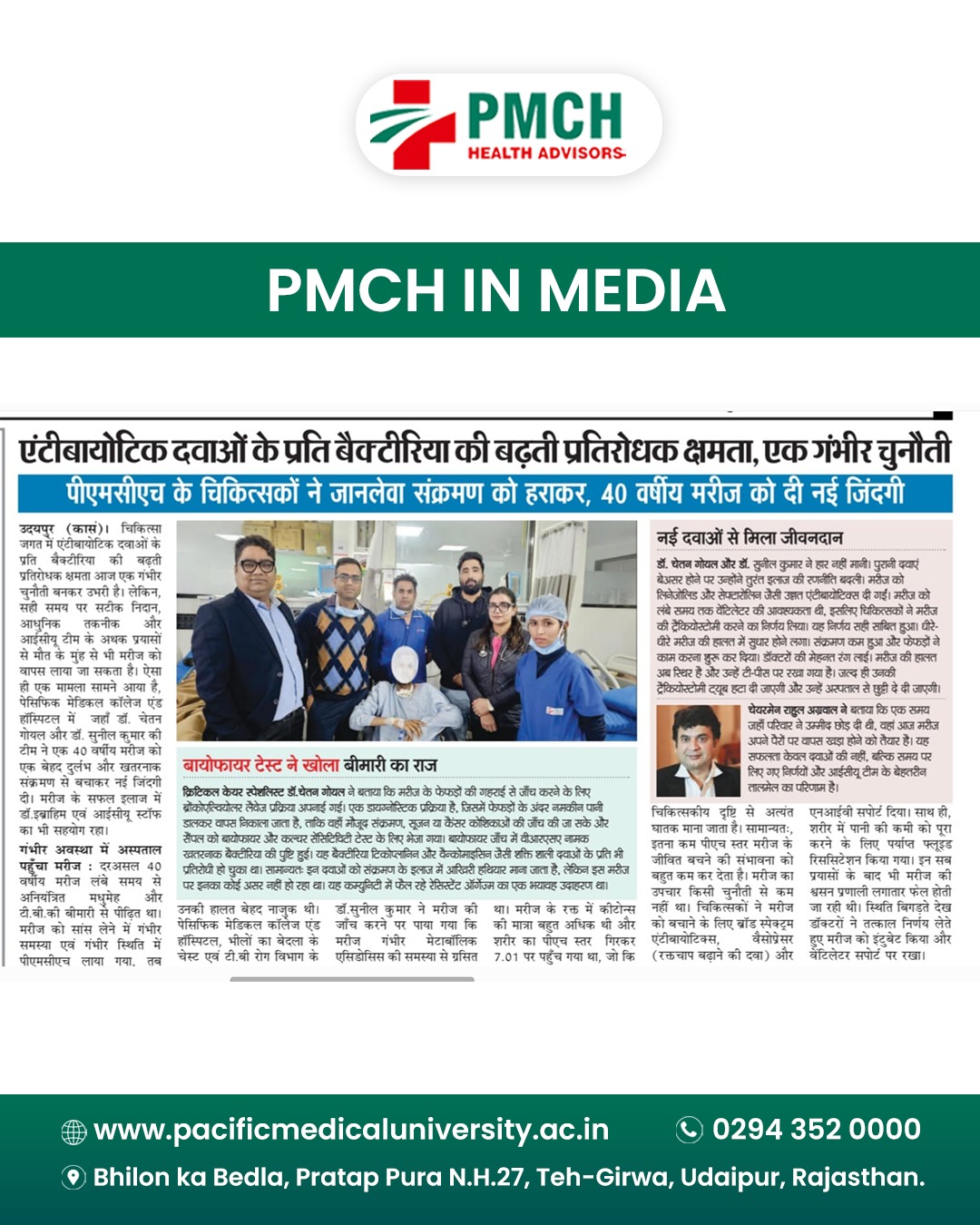 рдЪрд┐рдХрд┐рддреНрд╕рд╛ рдЬрдЧрдд рдореЗрдВ рдПрдВрдЯреАрдмрд╛рдпреЛрдЯрд┐рдХ рджрд╡рд╛рдУрдВ рдХреЗ рдкреНрд░рддрд┐ рдмреИрдХреНрдЯреАрд░рд┐рдпрд╛ рдХреА рдмрдврд╝рддреА рдкреНрд░рддрд┐рд░реЛрдзрдХ рдХреНрд╖рдорддрд╛ рдЖрдЬ рдПрдХ рдЧрдВрднреАрд░ рдЪреБрдиреМрддреА рдмрдирдХрд░ рдЙрднрд░реА рд╣реИред рд▓реЗрдХрд┐рди, рд╕рд╣реА рд╕рдордп рдкрд░ рд╕рдЯреАрдХ рдирд┐рджрд╛рди, рдЖрдзреБрдирд┐рдХ рддрдХрдиреАрдХ рдФрд░ рдЖрдИрд╕реАрдпреВ рдЯреАрдо рдХреЗ рдЕрдердХ рдкреНрд░рдпрд╛рд╕реЛрдВ рд╕реЗ рдореМрдд рдХреЗ рдореБрдВрд╣ рд╕реЗ рднреА рдорд░реАрдЬ рдХреЛ рд╡рд╛рдкрд╕ рд▓рд╛рдпрд╛ рдЬрд╛ рд╕рдХрддрд╛ рд╣реИред рдРрд╕рд╛ рд╣реА рдПрдХ рдорд╛рдорд▓рд╛ рд╕рд╛рдордиреЗ рдЖрдпрд╛ рд╣реИ, рдкреЗрд╕рд┐рдлрд┐рдХ рдореЗрдбрд┐рдХрд▓ рдХреЙрд▓реЗрдЬ рдПрдВрдб рд╣реЙрд╕реНрдкрд┐рдЯрд▓ рдореЗрдВ рдЬрд╣рд╛рдБ рдбреЙ. рдЪреЗрддрди рдЧреЛрдпрд▓ рдФрд░ рдбреЙ. рд╕реБрдиреАрд▓ рдХреБрдорд╛рд░ рдХреА рдЯреАрдо рдиреЗ рдПрдХ 40 рд╡рд░реНрд╖реАрдп рдорд░реАрдЬ рдХреЛ рдПрдХ рдмреЗрд╣рдж рджреБрд░реНрд▓рдн рдФрд░ рдЦрддрд░рдирд╛рдХ рд╕рдВрдХреНрд░рдордг рд╕реЗ рдмрдЪрд╛рдХрд░ рдирдИ рдЬрд┐рдВрджрдЧреА рджреАред рдорд░реАрдЬ рдХреЗ рд╕рдлрд▓ рдЗрд▓рд╛рдЬ рдореЗрдВ рдбреЙ.рдЗрдмреНрд░рд╛рд╣рд┐рдо рдПрд╡рдВ рдЖрдИрд╕реАрдпреВ рд╕реНрдЯреЙрдл рдХрд╛ рднреА рд╕рд╣рдпреЛрдЧ рд░рд╣рд╛ред рдЧрдВрднреАрд░ рдЕрд╡рд╕реНрдерд╛ рдореЗрдВ рдЕрд╕реНрдкрддрд╛рд▓ рдкрд╣реБрдБрдЪрд╛ рдорд░реАрдЬ : рджрд░рдЕрд╕рд▓ 40 рд╡рд░реНрд╖реАрдп рдорд░реАрдЬ рд▓рдВрдмреЗ рд╕рдордп рд╕реЗ рдЕрдирд┐рдпрдВрддреНрд░рд┐рдд рдордзреБрдореЗрд╣ рдФрд░ рдЯреА.рдмреА. рдХреА рдмреАрдорд╛рд░реА рд╕реЗ рдкреАрдврд┐рдд рдерд╛ред рдорд░реАрдЬ рдХреЛ рд╕рд╛рдВрд╕ рд▓реЗрдиреЗ рдореЗрдВ рдЧрдВрднреАрд░ рд╕рдорд╕реНрдпрд╛ рдПрд╡рдВ рдЧрдВрднреАрд░ рд╕реНрдерд┐рддрд┐ рдореЗрдВ рдкреАрдПрдорд╕реАрдПрдЪ рд▓рд╛рдпрд╛ рдЧрдпрд╛. рддрдм рдмрд╛рдпреЛрдлрд╛рдпрд░ рдЯреЗрд╕реНрдЯ рдиреЗ рдЦреЛрд▓рд╛ рдмреАрдорд╛рд░реА рдХрд╛ рд░рд╛рдЬ рдХреНрд░рд┐рдЯрд┐рдХрд▓ рдХреЗрдпрд░ рд╕реНрдкреЗрд╢рд▓рд┐рд╕реНрдЯ рдбреЙ. рдЪреЗрддрди рдЧреЛрдпрд▓ рдиреЗ рдмрддрд╛рдпрд╛ рдХрд┐ рдорд░реАрдЬ рдХреЗ рдлреЗрдлрдбрд╝реЛрдВ рдХреА рдЧрд╣рд░рд╛рдИ рд╕реЗ рдЬрд╛рдБрдЪ рдХрд░рдиреЗ рдХреЗ рд▓рд┐рдП рдмреНрд░реЛрдВрдХреЛрдПрд▓реНрд╡рд┐рдпреЛрд▓рд░ рд▓реИрд╡реЗрдЬ рдкреНрд░рдХреНрд░рд┐рдпрд╛ рдЕрдкрдирд╛рдИ рдЧрдИред рдПрдХ рдбрд╛рдпрдЧреНрдиреЛрд╕реНрдЯрд┐рдХ рдкреНрд░рдХреНрд░рд┐рдпрд╛ рд╣реИ, рдЬрд┐рд╕рдореЗрдВ рдлреЗрдлрдбрд╝реЛрдВ рдХреЗ рдЕрдВрджрд░ рдирдордХреАрди рдкрд╛рдиреА рдбрд╛рд▓рдХрд░ рд╡рд╛рдкрд╕ рдирд┐рдХрд╛рд▓рд╛ рдЬрд╛рддрд╛ рд╣реИ, рддрд╛рдХрд┐ рд╡рд╣рд╛рдБ рдореМрдЬреВрдж рд╕рдВрдХреНрд░рдордг, рд╕реВрдЬрди рдпрд╛ рдХреИрдВрд╕рд░ рдХреЛрд╢рд┐рдХрд╛рдУрдВ рдХреА рдЬрд╛рдБрдЪ рдХреА рдЬрд╛ рд╕рдХреЗ рдФрд░ рд╕реИрдВрдкрд▓ рдХреЛ рдмрд╛рдпреЛрдлрд╛рдпрд░ рдФрд░ рдХрд▓реНрдЪрд░ рд╕реЗрдВрд╕рд┐рдЯрд┐рд╡рд┐рдЯреА рдЯреЗрд╕реНрдЯ рдХреЗ рд▓рд┐рдП рднреЗрдЬрд╛ рдЧрдпрд╛ред рдмрд╛рдпреЛрдлрд╛рдпрд░ рдЬрд╛рдБрдЪ рдореЗрдВ рд╡реАрдЖрд░рдПрд╕рдП рдирд╛рдордХ рдЦрддрд░рдирд╛рдХ рдмреИрдХреНрдЯреАрд░рд┐рдпрд╛ р