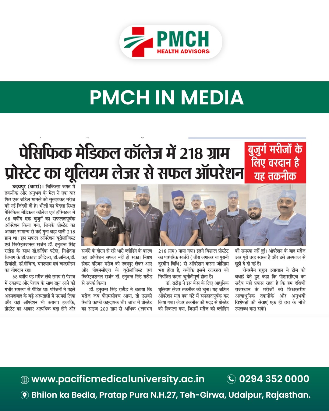 рдЪрд┐рдХрд┐рддреНрд╕рд╛ рдЬрдЧрдд рдореЗрдВ рддрдХрдиреАрдХ рдФрд░ рдЕрдиреБрднрд╡ рдХреЗ рдореЗрд▓ рдиреЗ рдПрдХ рдмрд╛рд░ рдлрд┐рд░ рдПрдХ рдЬрдЯрд┐рд▓ рдорд╛рдорд▓реЗ рдХреЛ рд╕реБрд▓рдЭрд╛рдХрд░ рдорд░реАрдЬ рдХреЛ рдирдИ рдЬрд┐рдВрджрдЧреА рджреА рд╣реИред рднреАрд▓реЛрдВ рдХрд╛ рдмрджрд▓рд╛ рд╕реНрдерд┐рдд рдкреЗрд╕рд┐рдлрд┐рдХ рдореЗрдбрд┐рдХрд▓ рдХреЙрд▓реЗрдЬ рдПрд╡рдВ рд╣реЙрд╕реНрдкрд┐рдЯрд▓ рдореЗрдВ 68 рд╡рд░реНрд╖реАрдп рдПрдХ рдмреБрдЬреБрд░реНрдЧ рдХрд╛ рд╕рдлрд▓рддрд╛рдкреВрд░реНрд╡рдХ рдСрдкрд░реЗрд╢рди рдХрд┐рдпрд╛ рдЧрдпрд╛, рдЬрд┐рдирдХреЗ рдкреНрд░реЛрд╕реНрдЯреЗрдЯ рдХрд╛ рдЖрдХрд╛рд░ рд╕рд╛рдорд╛рдиреНрдп рд╕реЗ рдХрдИ рдЧреБрдирд╛ рдмрдбрд╝рд╛ рдпрд╛рдиреА 218 рдЧреНрд░рд╛рдо рдерд╛ред рдЗрд╕ рд╕рдлрд▓ рдСрдкрд░реЗрд╢рди рдпреВрд░реЛрд▓реЙрдЬрд┐рд╕реНрдЯ рдПрд╡рдВ рд░рд┐рдХрдВрд╕реНрдЯреНрд░рдХреНрд╢рдирд▓ рд╕рд░реНрдЬрди рдбреЙ. рд╣рдиреБрд╡рдиреНрдд рд╕рд┐рдВрд╣ рд░рд╛рдареМрдб рдХреЗ рд╕рд╛рде рдбреЙ. рд╣реЙрд░реНрджрд┐рдХ рдкрдЯреЗрд▓, рдирд┐рд╢реНрдЪреЗрддрдирд╛ рд╡рд┐рднрд╛рдЧ рдХреЗ рдбреЙ. рдкреНрд░рдХрд╛рд╢ рдФрджрд┐рдЪреНрдп, рдбреЙ. рдЕрдирд┐рд▓, рдбреЙ. рдкреНрд░рд┐рдпрд╛рдВрд╢реА, рдбреЙ.рдЧреЛрд╡рд┐рдиреНрдж, рдШрдирд╢реНрдпрд╛рдо рдПрд╡рдВ рдЪрдиреНрджреНрд░рдореЛрд╣рди рдХрд╛ рдпреЛрдЧрджрд╛рди рд░рд╣рд╛ред 68 рд╡рд░реНрд╖реАрдп рдпрд╣ рдорд░реАрдЬ рд▓рдВрдмреЗ рд╕рдордп рд╕реЗ рдкреЗрд╢рд╛рдм рдореЗрдВ рд░реБрдХрд╛рд╡рдЯ рдФрд░ рдкреЗрд╢рд╛рдм рдХреЗ рд╕рд╛рде рдЦреВрди рдЖрдиреЗ рдХреА рдЧрдВрднреАрд░ рд╕рдорд╕реНрдпрд╛ рд╕реЗ рдкреАрдбрд╝рд┐рдд рдерд╛ред рдкрд░рд┐рдЬрдиреЛрдВ рдиреЗ рдкрд╣рд▓реЗ рдЕрд╣рдорджрд╛рдмрд╛рдж рдХреЗ рдмрдбрд╝реЗ рдЕрд╕реНрдкрддрд╛рд▓реЛрдВ рдореЗрдВ рдкрд░рд╛рдорд░реНрд╢ рд▓рд┐рдпрд╛ рдФрд░ рд╡рд╣рд╛рдВ рдСрдкрд░реЗрд╢рди рднреА рдХрд░рд╛рдпрд╛ред рд╣рд╛рд▓рд╛рдВрдХрд┐, рдкреНрд░реЛрд╕реНрдЯреЗрдЯ рдХрд╛ рдЖрдХрд╛рд░ рдЕрддреНрдпрдзрд┐рдХ рдмрдбрд╝рд╛ рд╣реЛрдиреЗ рдФрд░ рд╕рд░реНрдЬрд░реА рдХреЗ рджреМрд░рд╛рди рд╣реЛ рд░рд╣реА рднрд╛рд░реА рдмреНрд▓реАрдбрд┐рдВрдЧ рдХреЗ рдХрд╛рд░рдг рд╡рд╣рд╛рдВ рдСрдкрд░реЗрд╢рди рд╕рдлрд▓ рдирд╣реАрдВ рд╣реЛ рд╕рдХрд╛ред рдирд┐рд░рд╛рд╢ рд╣реЛрдХрд░ рдкрд░рд┐рдЬрди рдорд░реАрдЬ рдХреЛ рдЙрджрдпрдкреБрд░ рд▓реЗрдХрд░ рдЖрдП рдФрд░ рдкреАрдПрдорд╕реАрдПрдЪ рдХреЗ рдпреВрд░реЛрд▓реЙрдЬрд┐рд╕реНрдЯ рдПрд╡рдВ рд░рд┐рдХрдВрд╕реНрдЯреНрд░рдХреНрд╢рдирд▓ рд╕рд░реНрдЬрди рдбреЙ. рд╣рдиреБрд╡рдиреНрдд рд╕рд┐рдВрд╣ рд░рд╛рдареМрдбрд╝ рд╕реЗ рд╕рдВрдкрд░реНрдХ рдХрд┐рдпрд╛ред
