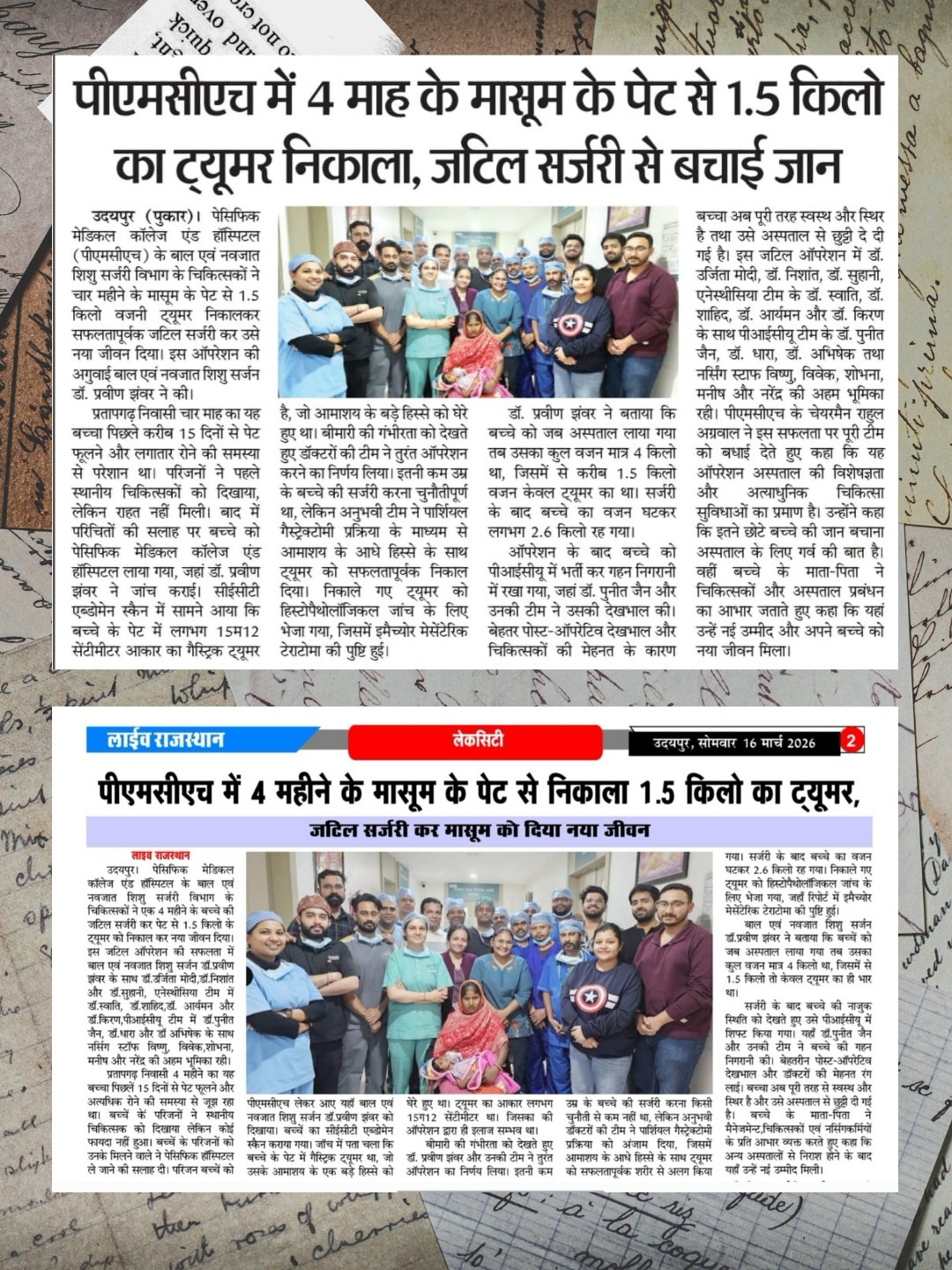 рдкреЗрд╕рд┐рдлрд┐рдХ рдореЗрдбрд┐рдХрд▓ рдХреЙрд▓реЗрдЬ рдПрдВрдб рд╣реЙрд╕реНрдкрд┐рдЯрд▓ (рдкреАрдПрдорд╕реАрдПрдЪ) рдХреЗ рдмрд╛рд▓ рдПрд╡рдВ рдирд╡рдЬрд╛рдд рд╢рд┐рд╢реБ рд╕рд░реНрдЬрд░реА рд╡рд┐рднрд╛рдЧ рдХреЗ рдЪрд┐рдХрд┐рддреНрд╕рдХреЛрдВ рдиреЗ рдЪрд╛рд░ рдорд╣реАрдиреЗ рдХреЗ рдорд╛рд╕реВрдо рдХреЗ рдкреЗрдЯ рд╕реЗ 1.5 рдХрд┐рд▓реЛ рд╡рдЬрдиреА рдЯреНрдпреВрдорд░ рдирд┐рдХрд╛рд▓рдХрд░ рд╕рдлрд▓рддрд╛рдкреВрд░реНрд╡рдХ рдЬрдЯрд┐рд▓ рд╕рд░реНрдЬрд░реА рдХрд░ рдЙрд╕реЗ рдирдпрд╛ рдЬреАрд╡рди рджрд┐рдпрд╛ред рдЗрд╕ рдСрдкрд░реЗрд╢рди рдХреА рдЕрдЧреБрд╡рд╛рдИ рдмрд╛рд▓ рдПрд╡рдВ рдирд╡рдЬрд╛рдд рд╢рд┐рд╢реБ рд╕рд░реНрдЬрди рдбреЙ. рдкреНрд░рд╡реАрдг рдЭрдВрд╡рд░ рдиреЗ рдХреАред рдкреНрд░рддрд╛рдкрдЧрдврд╝ рдирд┐рд╡рд╛рд╕реА рдЪрд╛рд░ рдорд╛рд╣ рдХрд╛ рдпрд╣ рдмрдЪреНрдЪрд╛ рдкрд┐рдЫрд▓реЗ рдХрд░реАрдм 15 рджрд┐рдиреЛрдВ рд╕реЗ рдкреЗрдЯ рдлреВрд▓рдиреЗ рдФрд░ рд▓рдЧрд╛рддрд╛рд░ рд░реЛрдиреЗ рдХреА рд╕рдорд╕реНрдпрд╛ рд╕реЗ рдкрд░реЗрд╢рд╛рди рдерд╛ред рдкрд░рд┐рдЬрдиреЛрдВ рдиреЗ рдкрд╣рд▓реЗ рд╕реНрдерд╛рдиреАрдп рдЪрд┐рдХрд┐рддреНрд╕рдХреЛрдВ рдХреЛ рджрд┐рдЦрд╛рдпрд╛, рд▓реЗрдХрд┐рди рд░рд╛рд╣рдд рдирд╣реАрдВ рдорд┐рд▓реАред рдмрд╛рдж рдореЗрдВ рдкрд░рд┐рдЪрд┐рддреЛрдВ рдХреА рд╕рд▓рд╛рд╣ рдкрд░ рдмрдЪреНрдЪреЗ рдХреЛ рдкреЗрд╕рд┐рдлрд┐рдХ рдореЗрдбрд┐рдХрд▓ рдХреЙрд▓реЗрдЬ рдПрдВрдб рд╣реЙрд╕реНрдкрд┐рдЯрд▓ рд▓рд╛рдпрд╛ рдЧрдпрд╛, рдЬрд╣рд╛рдВ рдбреЙ. рдкреНрд░рд╡реАрдг рдЭрдВрд╡рд░ рдиреЗ рдЬрд╛рдВрдЪ рдХрд░рд╛рдИред рд╕реАрдИрд╕реАрдЯреА рдПрдмреНрдбреЛрдореЗрди рд╕реНрдХреИрди рдореЗрдВ рд╕рд╛рдордиреЗ рдЖрдпрд╛ рдХрд┐ рдмрдЪреНрдЪреЗ рдХреЗ рдкреЗрдЯ рдореЗрдВ рд▓рдЧрднрдЧ 15рдо12 рд╕реЗрдВрдЯреАрдореАрдЯрд░ рдЖрдХрд╛рд░ рдХрд╛ рдЧреИрд╕реНрдЯреНрд░рд┐рдХ рдЯреНрдпреВрдорд░ рд╣реИ, рдЬреЛ рдЖрдорд╛рд╢рдп рдХреЗ рдмрдбрд╝реЗ рд╣рд┐рд╕реНрд╕реЗ рдХреЛ рдШреЗрд░реЗ рд╣реБрдП рдерд╛ред рдмреАрдорд╛рд░реА рдХреА рдЧрдВрднреАрд░рддрд╛ рдХреЛ рджреЗрдЦрддреЗ рд╣реБрдП рдбреЙрдХреНрдЯрд░реЛрдВ рдХреА рдЯреАрдо рдиреЗ рддреБрд░рдВрдд рдСрдкрд░реЗрд╢рди рдХрд░рдиреЗ рдХрд╛ рдирд┐рд░реНрдгрдп рд▓рд┐рдпрд╛ред рдЗрддрдиреА рдХрдо рдЙрдореНрд░ рдХреЗ рдмрдЪреНрдЪреЗ рдХреА рд╕рд░реНрдЬрд░реА рдХрд░рдирд╛ рдЪреБрдиреМрддреАрдкреВрд░реНрдг рдерд╛, рд▓реЗрдХрд┐рди рдЕрдиреБрднрд╡реА рдЯреАрдо рдиреЗ рдкрд╛рд░реНрд╢рд┐рдпрд▓ рдЧреИрд╕реНрдЯреНрд░реЗрдХреНрдЯреЛрдореА рдкреНрд░рдХреНрд░рд┐рдпрд╛ рдХреЗ рдорд╛рдзреНрдпрдо рд╕реЗ рдЖрдорд╛рд╢рдп рдХреЗ рдЖрдзреЗ рд╣рд┐рд╕реНрд╕реЗ рдХреЗ рд╕рд╛рде рдЯреНрдпреВрдорд░ рдХреЛ рд╕рдлрд▓рддрд╛рдкреВрд░реНрд╡рдХ рдирд┐рдХрд╛рд▓ рджрд┐рдпрд╛ред рдирд┐рдХрд╛рд▓реЗ рдЧрдП рдЯреНрдпреВрдорд░ рдХреЛ рд╣рд┐рд╕реНрдЯреЛрдкреИрдереЛрд▓реЙрдЬрд┐рдХрд▓ рдЬрд╛рдВрдЪ рдХреЗ рд▓рд┐рдП рднреЗрдЬрд╛ рдЧрдпрд╛, рдЬрд┐рд╕рдореЗрдВ рдЗрдореИрдЪреНрдпреЛрд░ рдореЗрд╕реЗрдВрдЯреЗрд░рд┐рдХ рдЯреЗрд░рд╛рдЯреЛрдорд╛ рдХреА рдкреБрд╖реНрдЯрд┐ рд╣реБрдИред