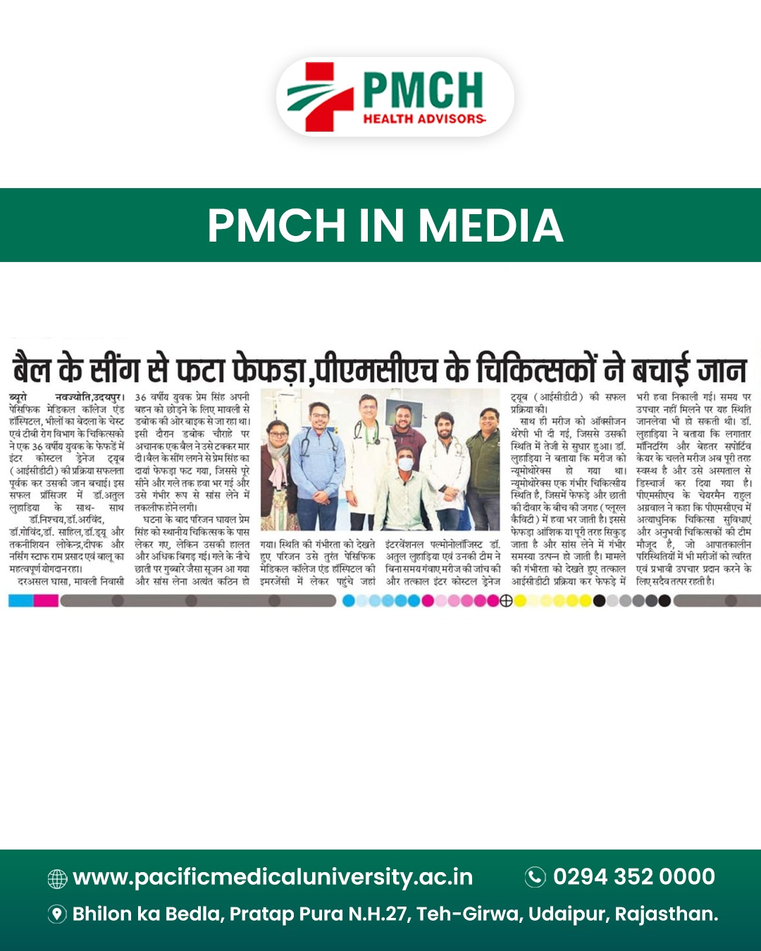 рдкреЗрд╕рд┐рдлрд┐рдХ рдореЗрдбрд┐рдХрд▓ рдХреЙрд▓реЗрдЬ рдПрдВрдб рд╣реЙрд╕реНрдкрд┐рдЯрд▓, рднреАрд▓реЛрдВ рдХрд╛ рдмреЗрджрд▓рд╛ рдХреЗ рдЪреЗрд╕реНрдЯ рдПрд╡рдВ рдЯреАрдмреА рд░реЛрдЧ рд╡рд┐рднрд╛рдЧ рдХреЗ рдЪрд┐рдХрд┐рддреНрд╕рдХреЛ рдиреЗ рдПрдХ 36 рд╡рд░реНрд╖реАрдп рдпреБрд╡рдХ рдХреЗ рдлреЗрдлрдбрд╝реЗ рдореЗрдВ рдЗрдВрдЯрд░ рдХреЛрд╕реНрдЯрд▓ рдбреНрд░реЗрдиреЗрдЬ рдЯреНрдпреВрдм (рдЖрдИрд╕реАрдбреАрдЯреА) рдХреА рдкреНрд░рдХреНрд░рд┐рдпрд╛ рд╕рдлрд▓рддрд╛ рдкреВрд░реНрд╡рдХ рдХрд░ рдЙрд╕рдХреА рдЬрд╛рди рдмрдЪрд╛рдИред рдЗрд╕ рд╕рдлрд▓ рдкреНрд░реЙрд╕рд┐рдЬрд░ рдореЗрдВ рдбреЙ. рдЕрддреБрд▓ рд▓реБрд╣рд╛рдбрд┐рдпрд╛ рдХреЗ рд╕рд╛рде- рд╕рд╛рде рдбреЙ. рдирд┐рд╢реНрдЪрдп, рдбреЙ. рдЕрд░рд╡рд┐рдВрдж, рдбреЙ.рдЧреЛрд╡рд┐рдВрдж,рдбреЙ. рд╕рд╛рд╣рд┐рд▓,рдбреЙ. рдбреНрдпреВ рдФрд░ рддрдХрдиреАрд╢рд┐рдпрди рд▓реЛрдХреЗрдиреНрджреНрд░, рджреАрдкрдХ рдФрд░ рдирд░реНрд╕рд┐рдВрдЧ рд╕реНрдЯрд╛рдл рд░рд╛рдо рдкреНрд░рд╕рд╛рдж рдПрд╡рдВ рдмрд╛рд▓реВ рдХрд╛ рдорд╣рддреНрд╡рдкреВрд░реНрдг рдпреЛрдЧрджрд╛рди рд░рд╣рд╛ред рджрд░рдЕрд╕рд▓ рдШрд╛рд╕рд╛, рдорд╛рд╡рд▓реА рдирд┐рд╡рд╛рд╕реА 36 рд╡рд░реНрд╖реАрдп рдпреБрд╡рдХ рдкреНрд░реЗрдо рд╕рд┐рдВрд╣ рдЕрдкрдиреА рдмрд╣рди рдХреЛ рдЫреЛрдбрд╝рдиреЗ рдХреЗ рд▓рд┐рдП рдорд╛рд╡рд▓реА рд╕реЗ рдбрдмреЛрдХ рдХреА рдУрд░ рдмрд╛рдЗрдХ рд╕реЗ рдЬрд╛ рд░рд╣рд╛ рдерд╛ред рдЗрд╕реА рджреМрд░рд╛рди рдбрдмреЛрдХ рдЪреМрд░рд╛рд╣реЗ рдкрд░ рдЕрдЪрд╛рдирдХ рдПрдХ рдмреИрд▓ рдиреЗ рдЙрд╕реЗ рдЯрдХреНрдХрд░ рдорд╛рд░ рджреАред рдмреИрд▓ рдХреЗ рд╕реАрдВрдЧ рд▓рдЧрдиреЗ рд╕реЗ рдкреНрд░реЗрдо рд╕рд┐рдВрд╣ рдХрд╛ рджрд╛рдпрд╛рдВ рдлреЗрдлрдбрд╝рд╛ рдлрдЯ рдЧрдпрд╛, рдЬрд┐рд╕рд╕реЗ рдкреВрд░реЗ рд╕реАрдиреЗ рдФрд░ рдЧрд▓реЗ рддрдХ рд╣рд╡рд╛ рднрд░ рдЧрдИ рдФрд░ рдЙрд╕реЗ рдЧрдВрднреАрд░ рд░реВрдк рд╕реЗ рд╕рд╛рдВрд╕ рд▓реЗрдиреЗ рдореЗрдВ рддрдХрд▓реАрдл рд╣реЛрдиреЗ рд▓рдЧреАред